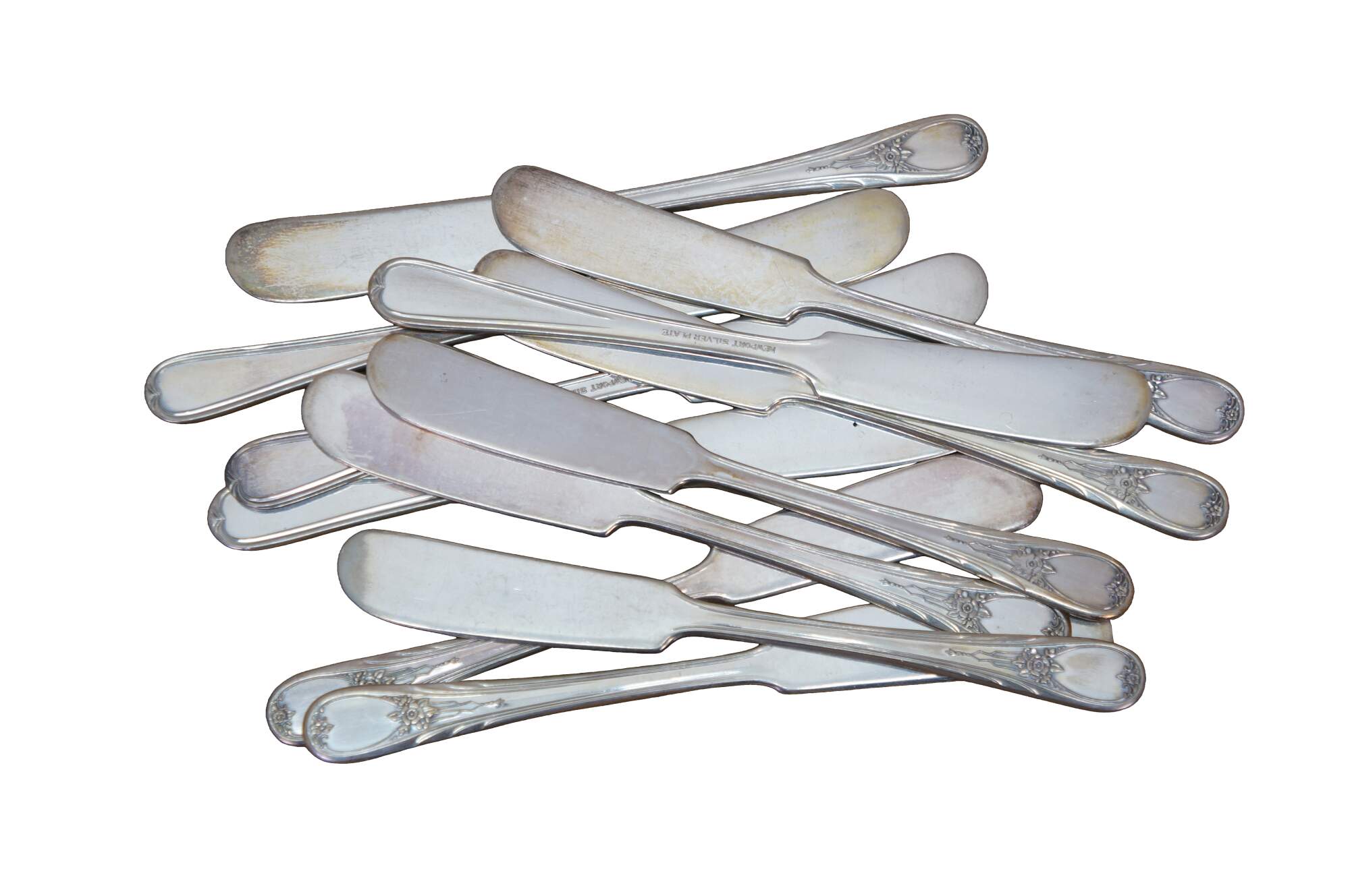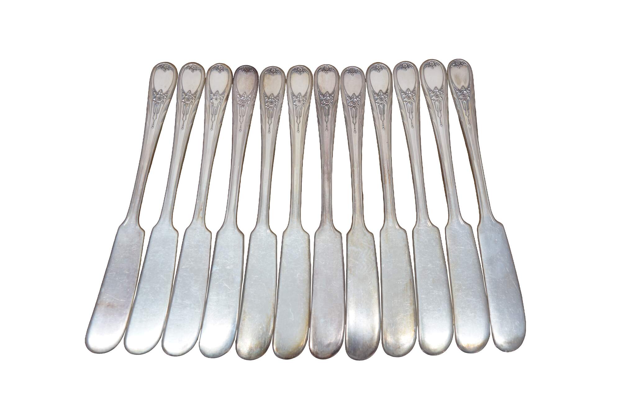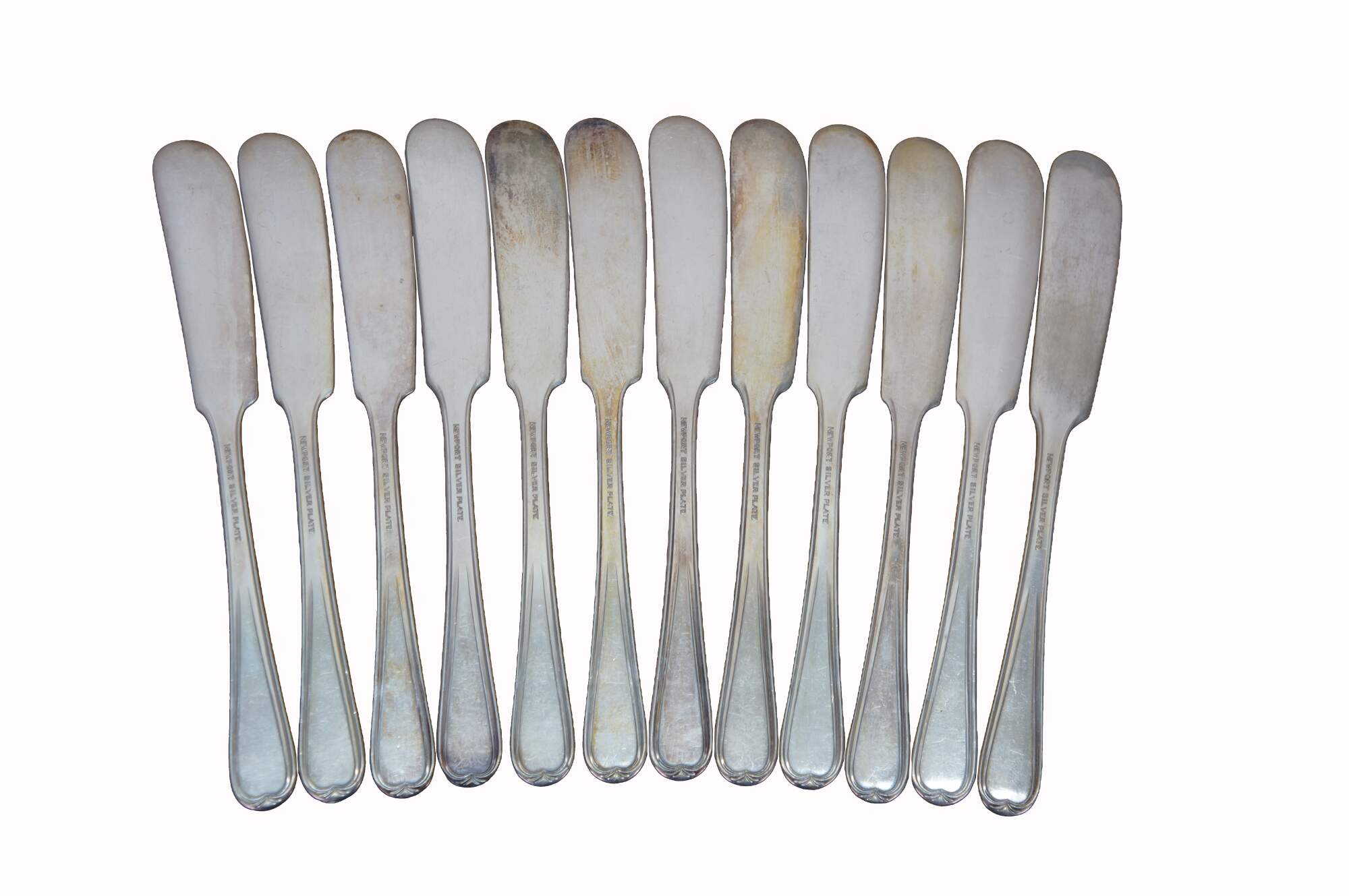 Twelve antique art nouveau Newport silver plated flat handle butter knives / spreaders.
