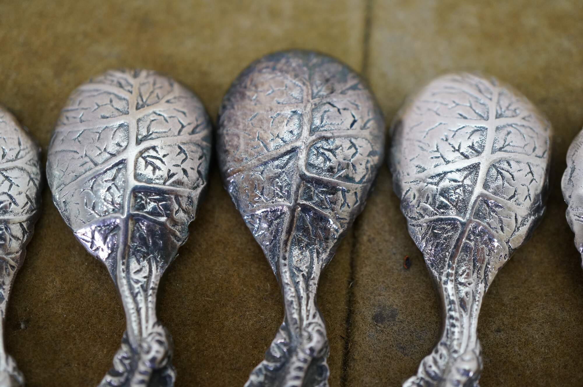 Six antique cast metal floral cabbage tea leaf demitasse spoons.