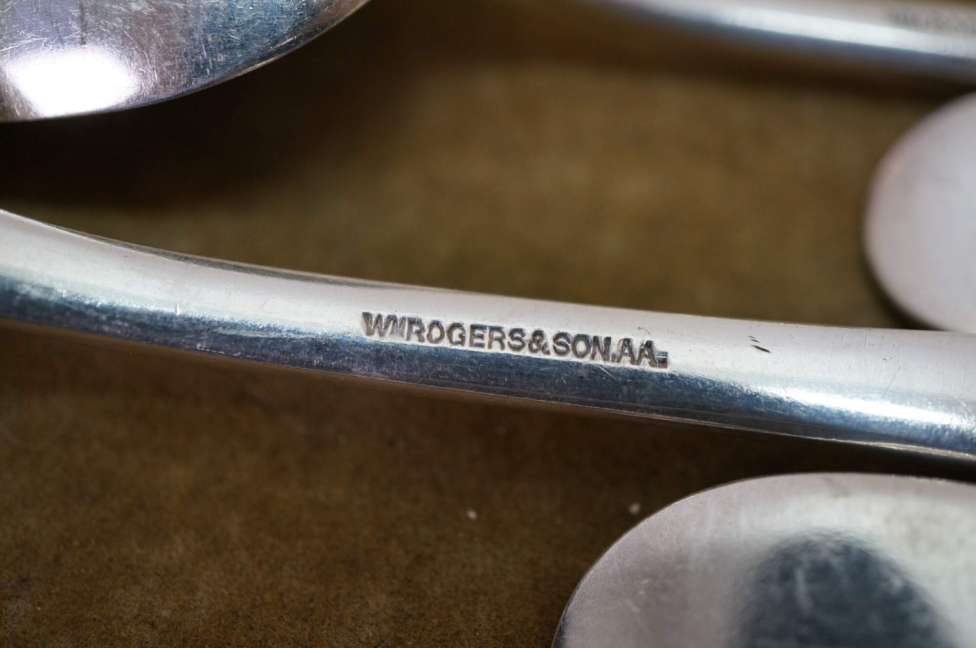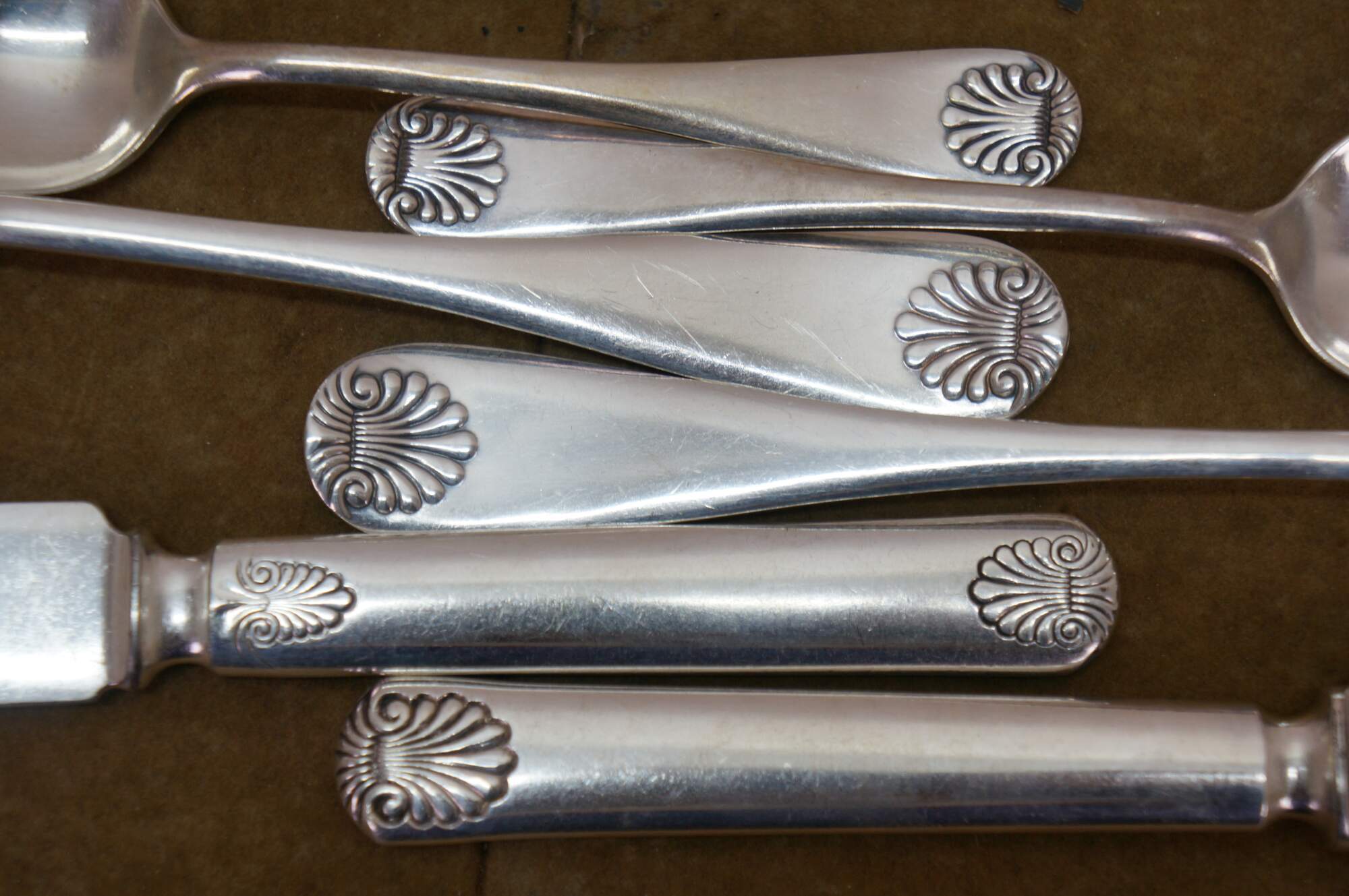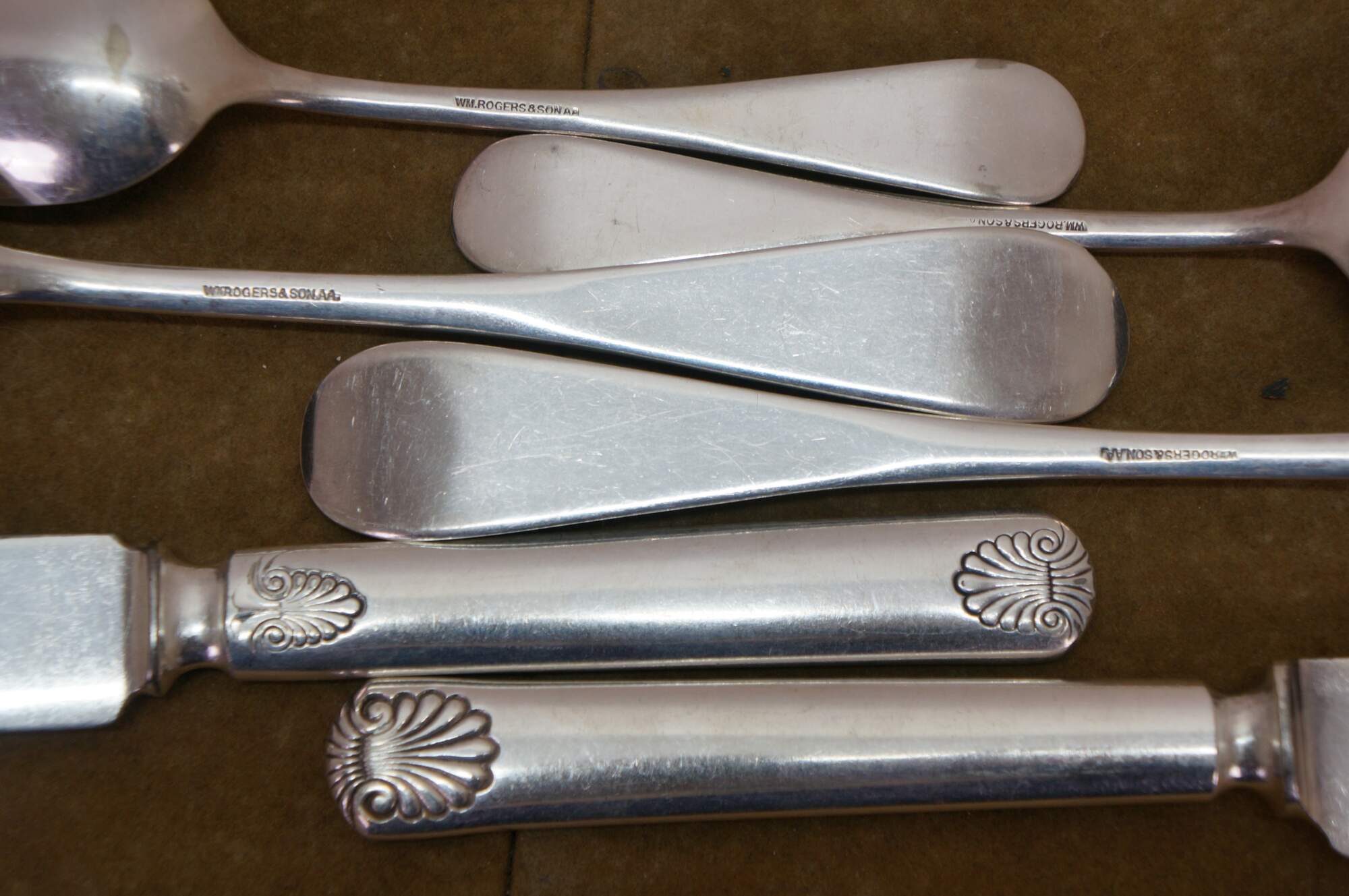 Twenty piece antique WM Rogers & son A1 silver plated shell pattern dinner spoons and knives / spreaders.