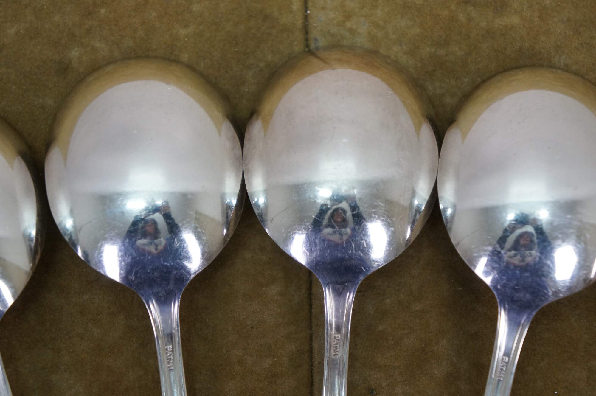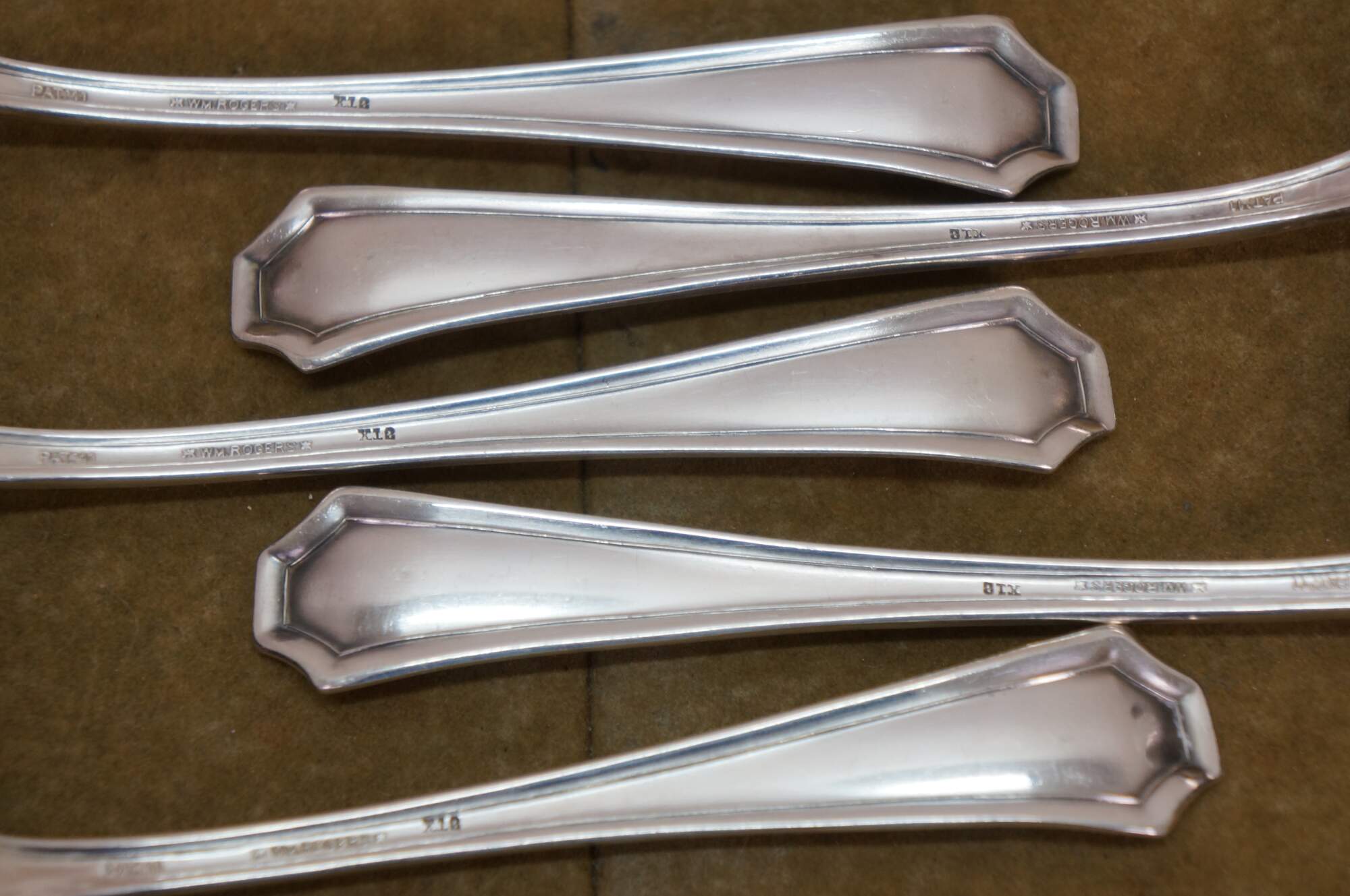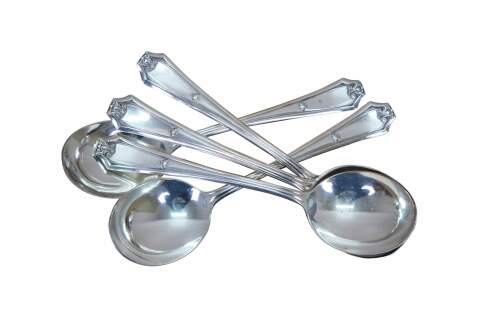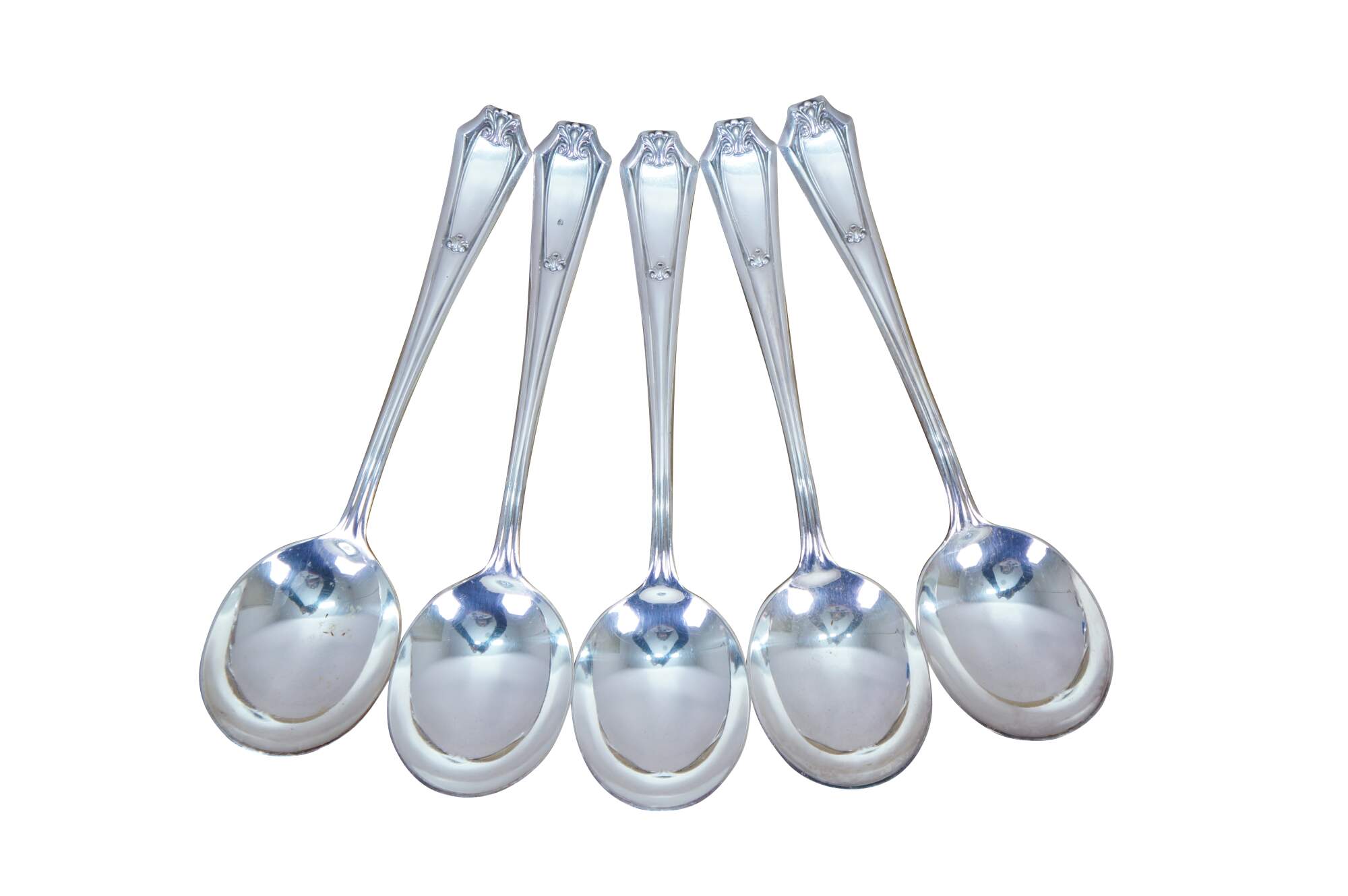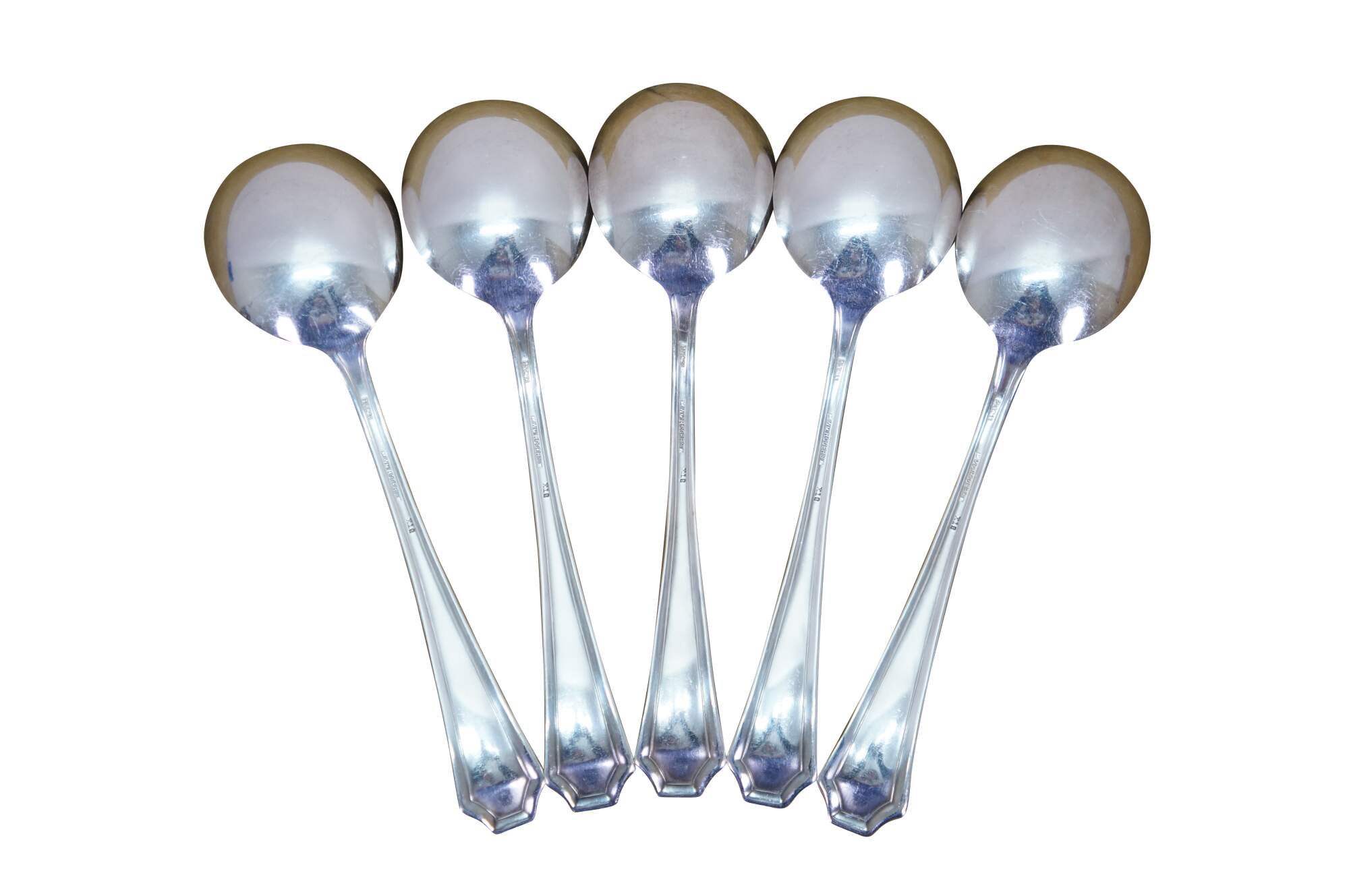 Five antique circa 1911 WM Rogers X12 Fairmount / Carrollton pattern bouillon soup spoons.