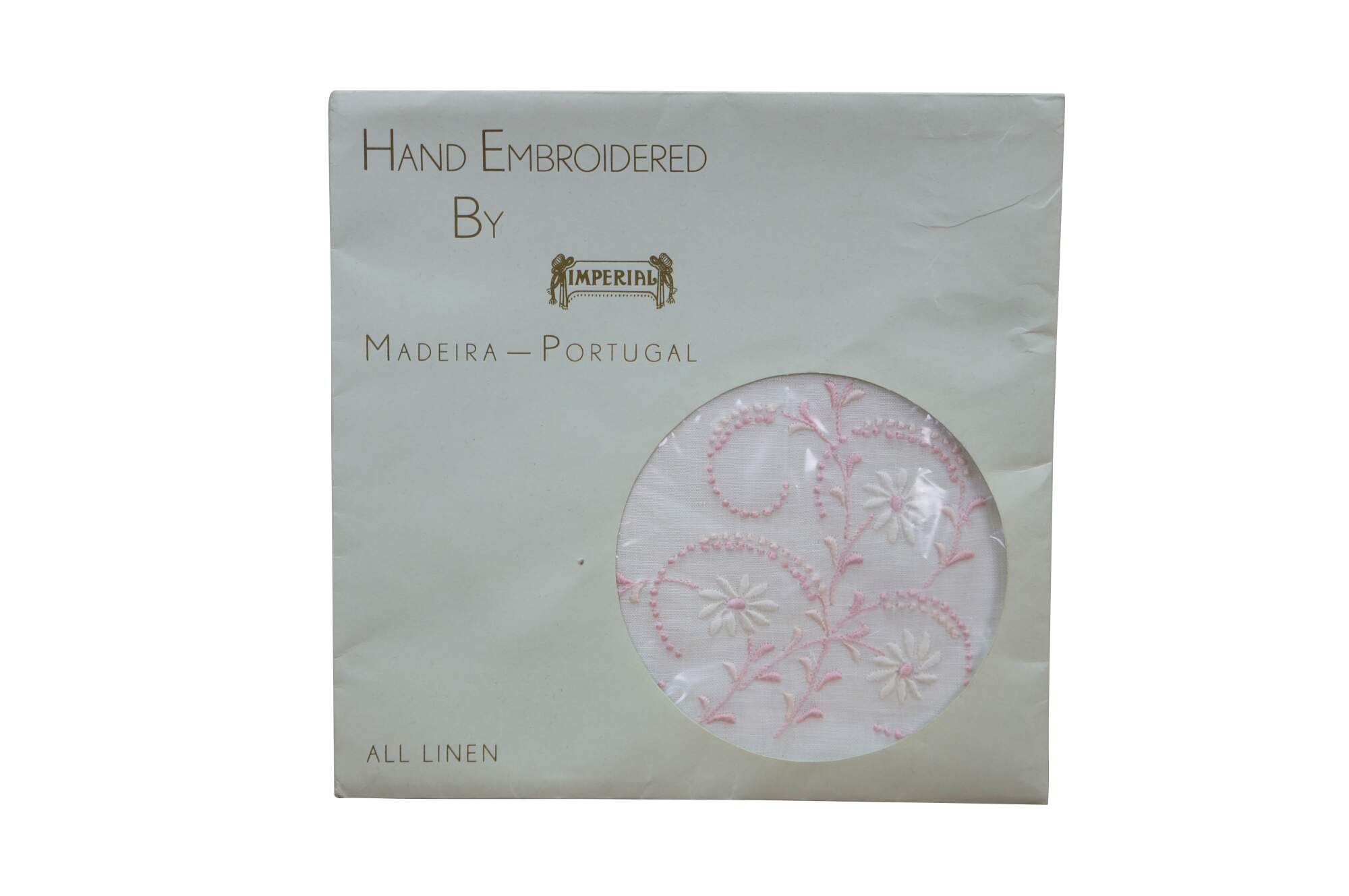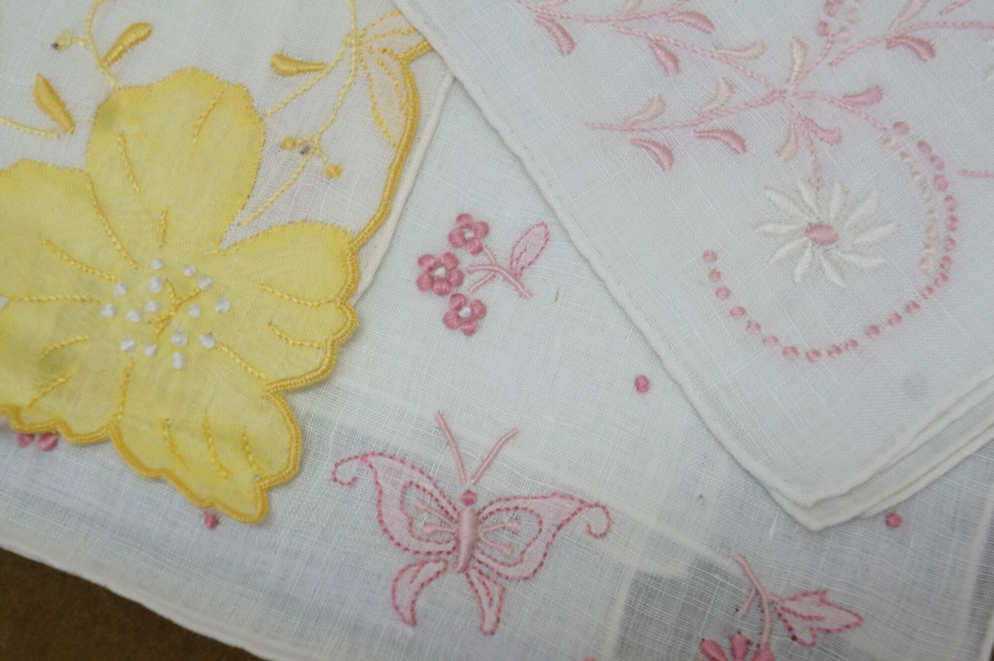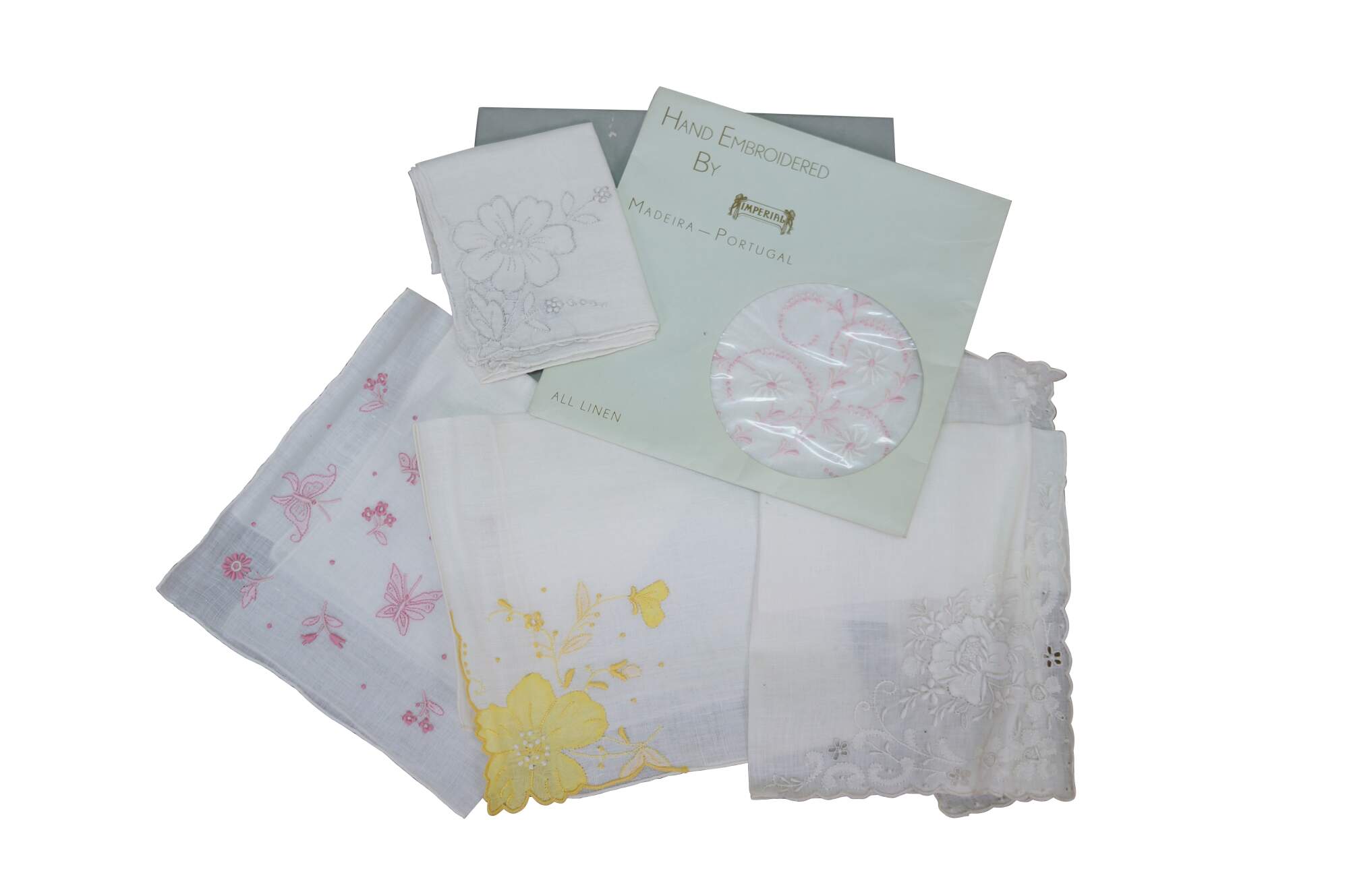 Set of vintage Portuguese Madeira Imperial embroidered linen handkerchiefs textile cloths. Gerbrend. Tork Street. Decorations all cotton.