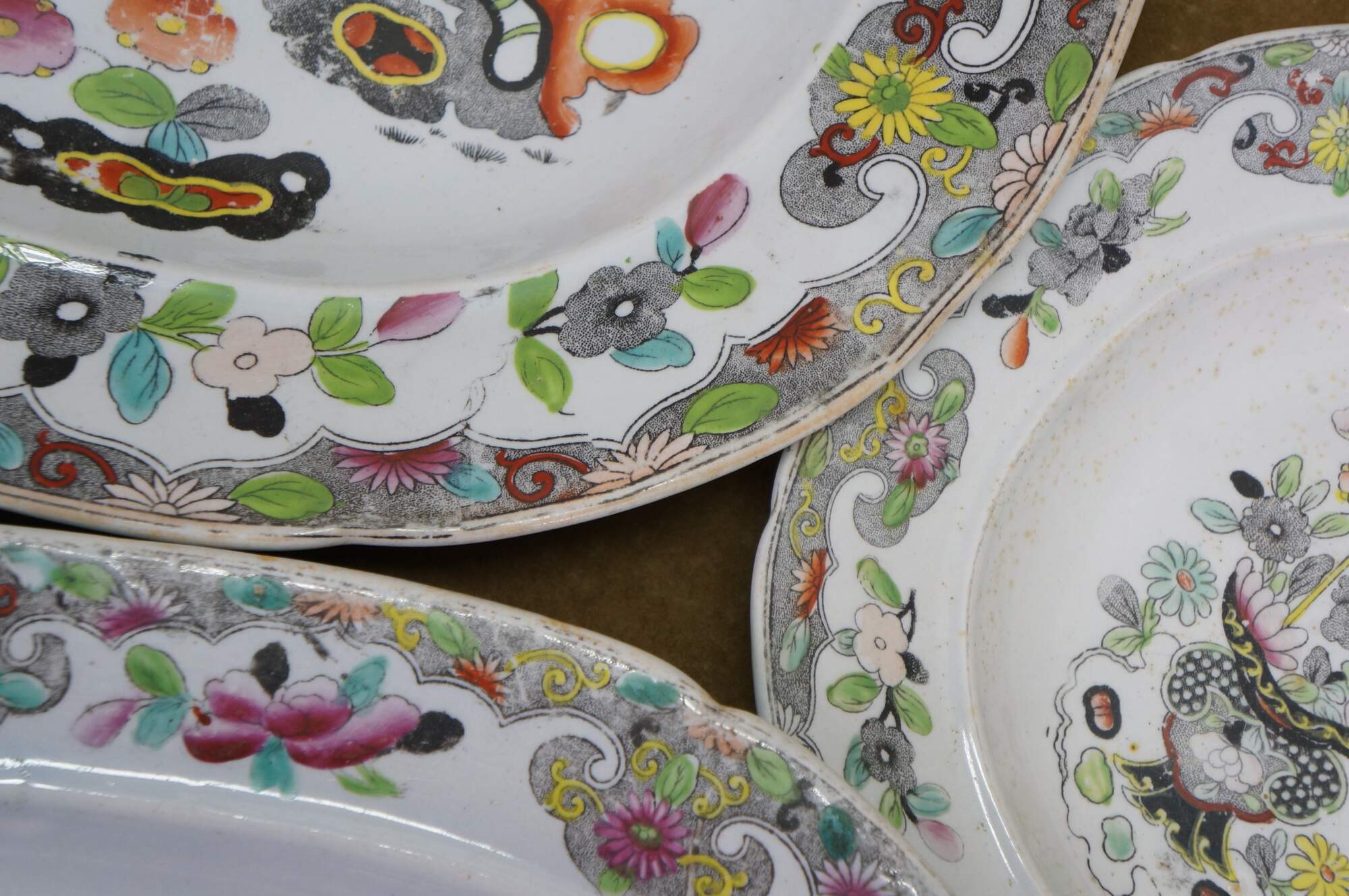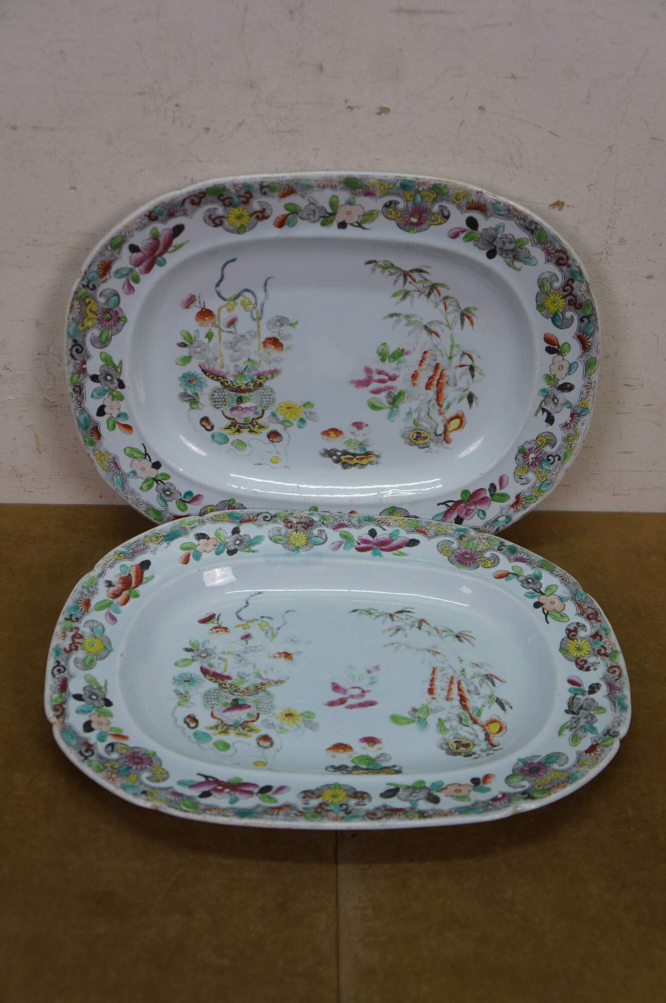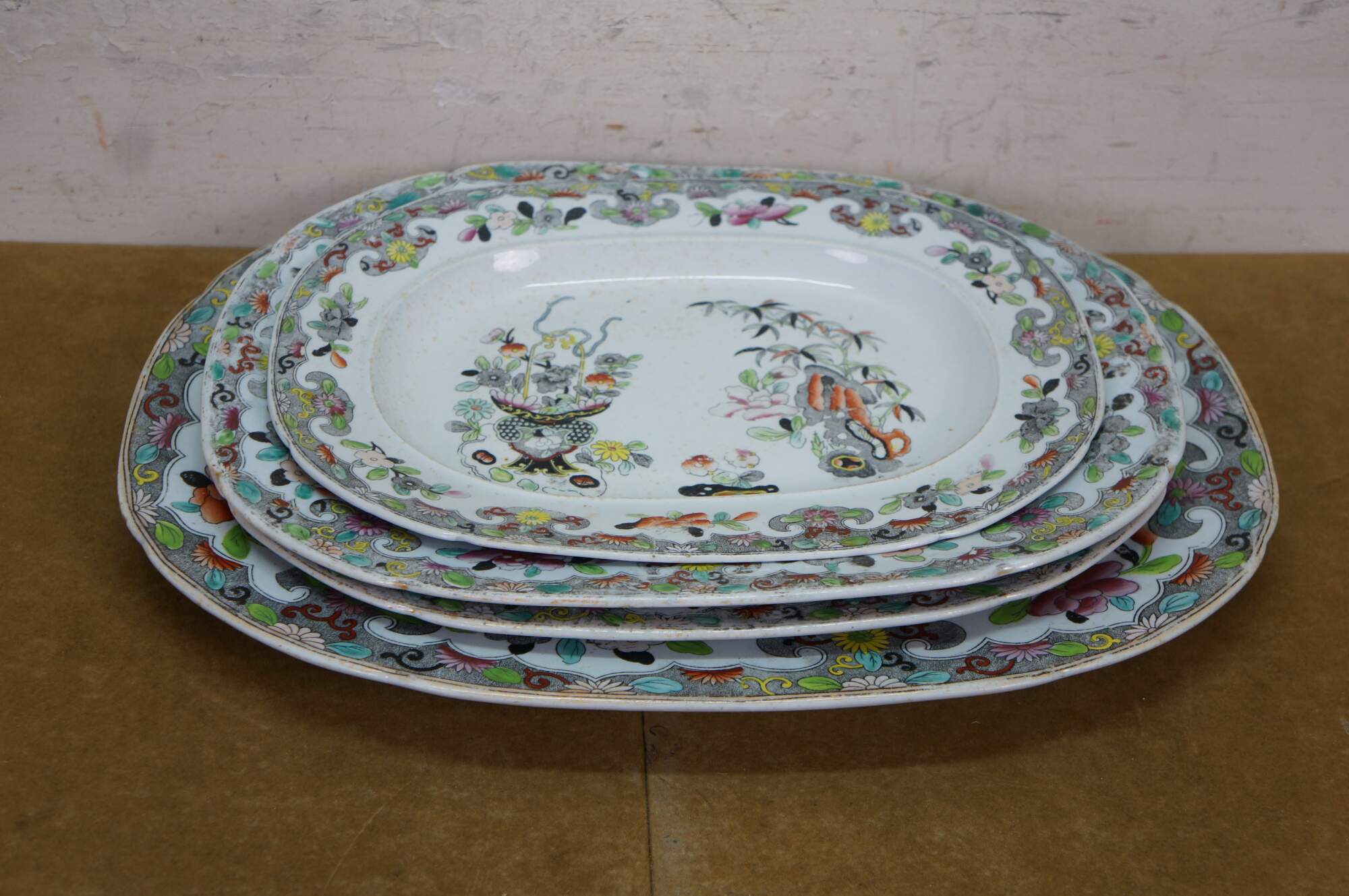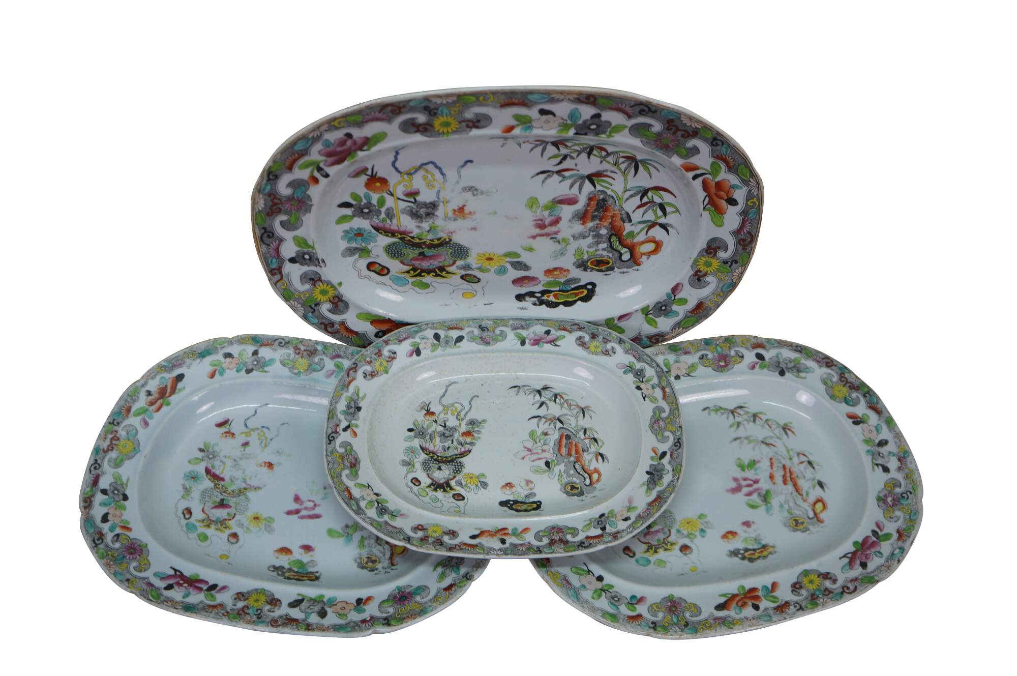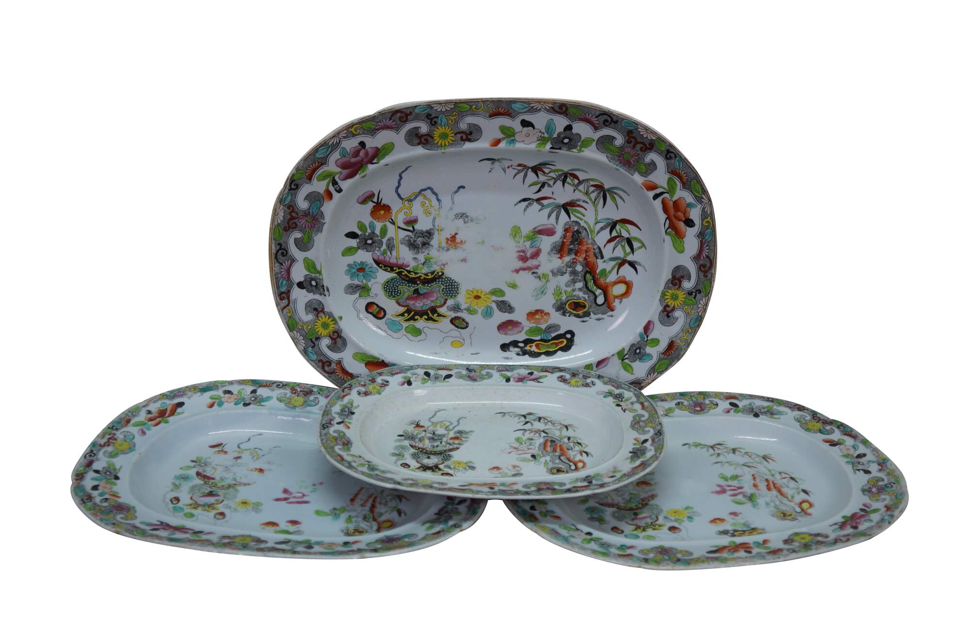 Four antique Stephen Folch serving platters / trays in the Bamboo & Basket pattern with Royal Arms mark, Circa 1825