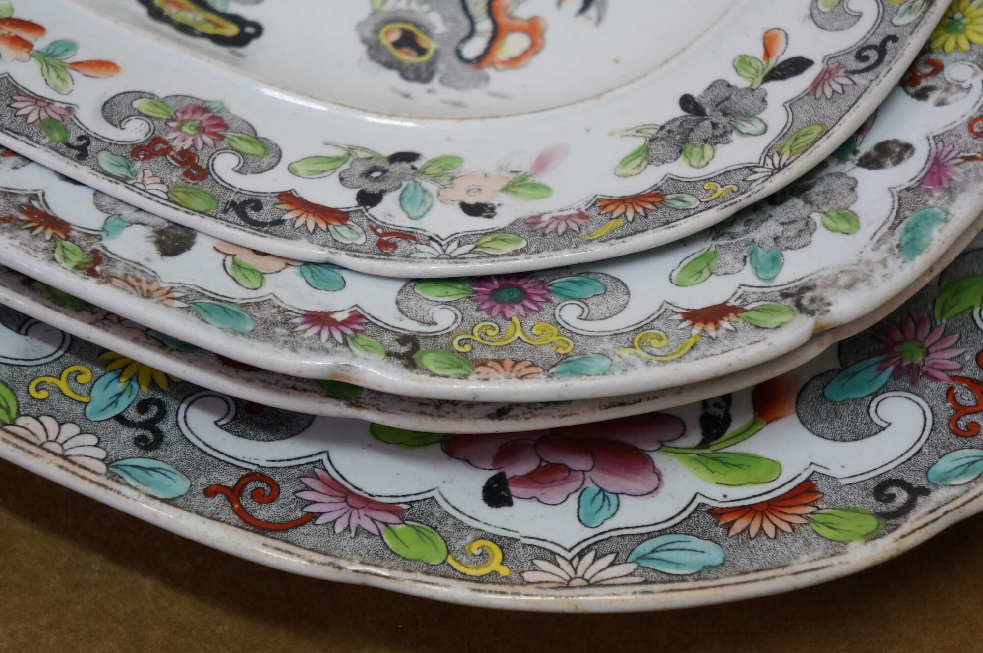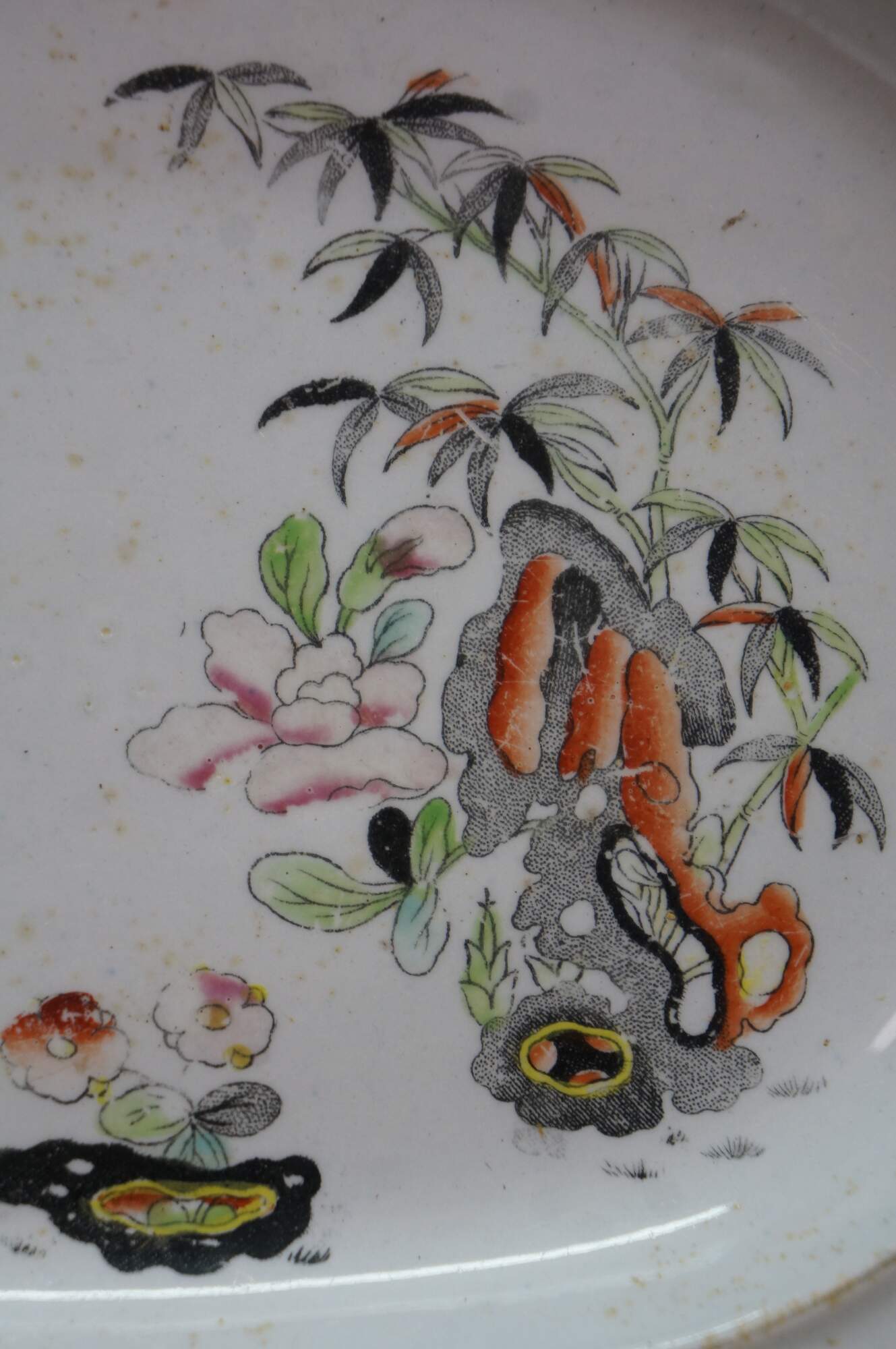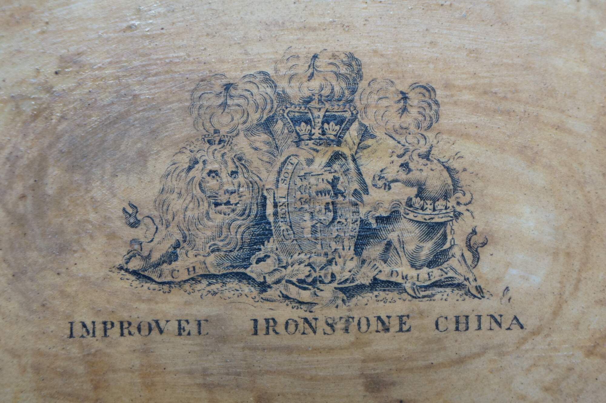 The plate is fully marked on the base with a Royal Arms mark having the Prince of Wales feathers behind and improved ironstone China below, all printed in black. A Plate in this pattern with the same back mark is illustrated on Page 243, plates 186 a & b, of Godden's Guide to Ironstone, by Geoffrey A Godden, published by The Antique Collectors' Club.