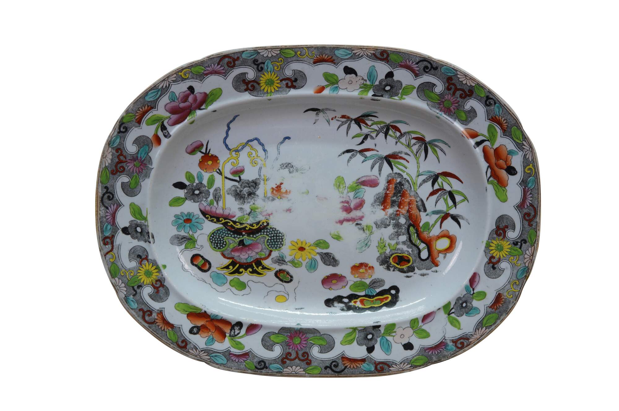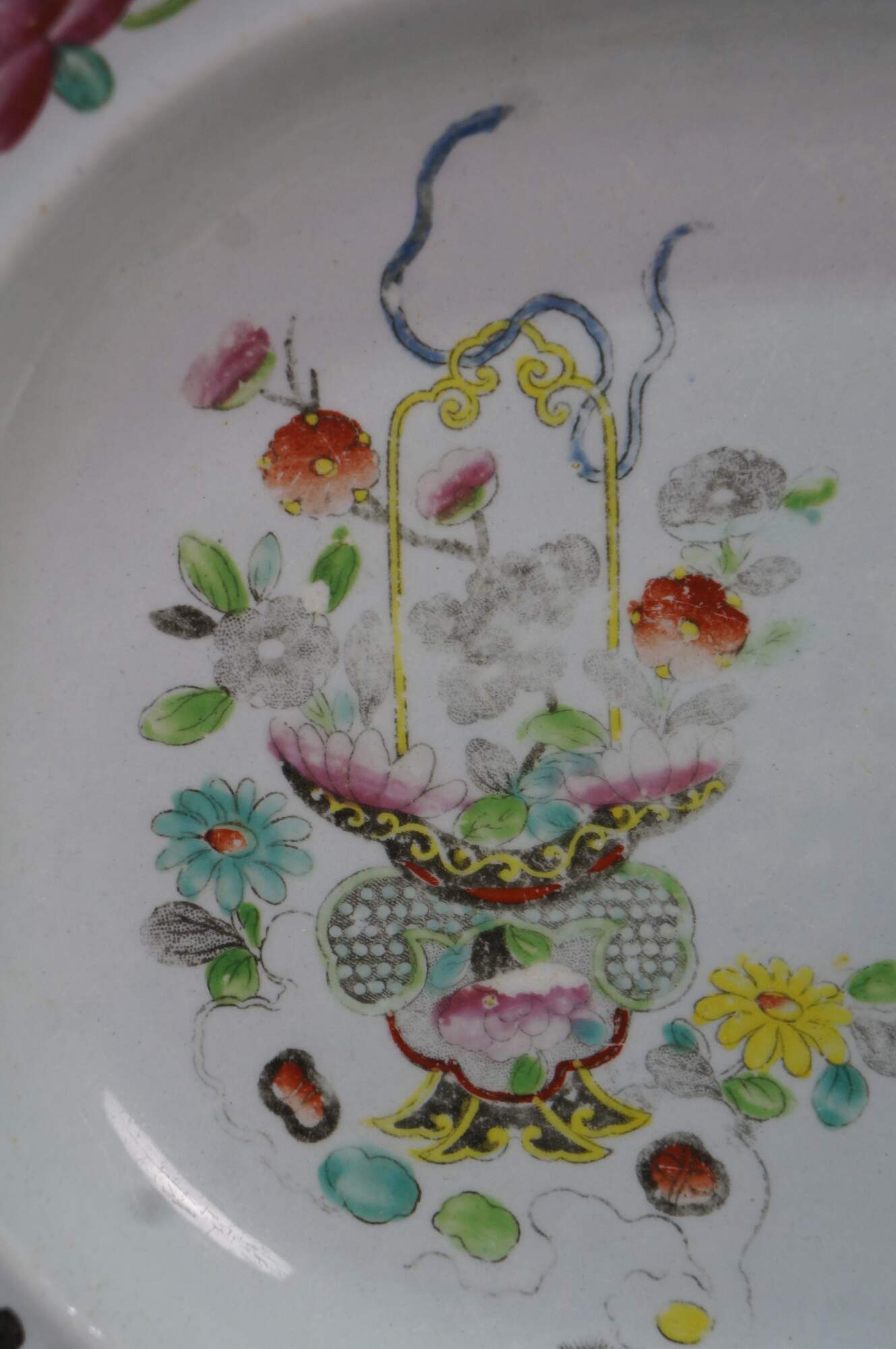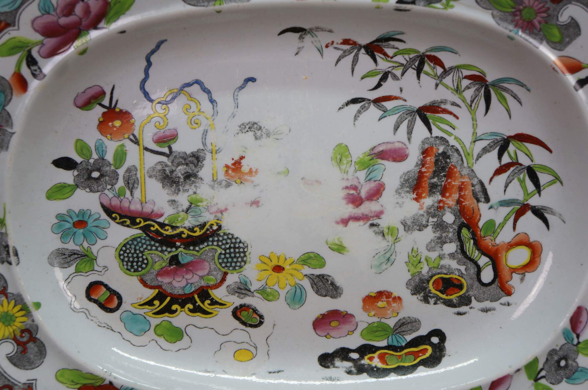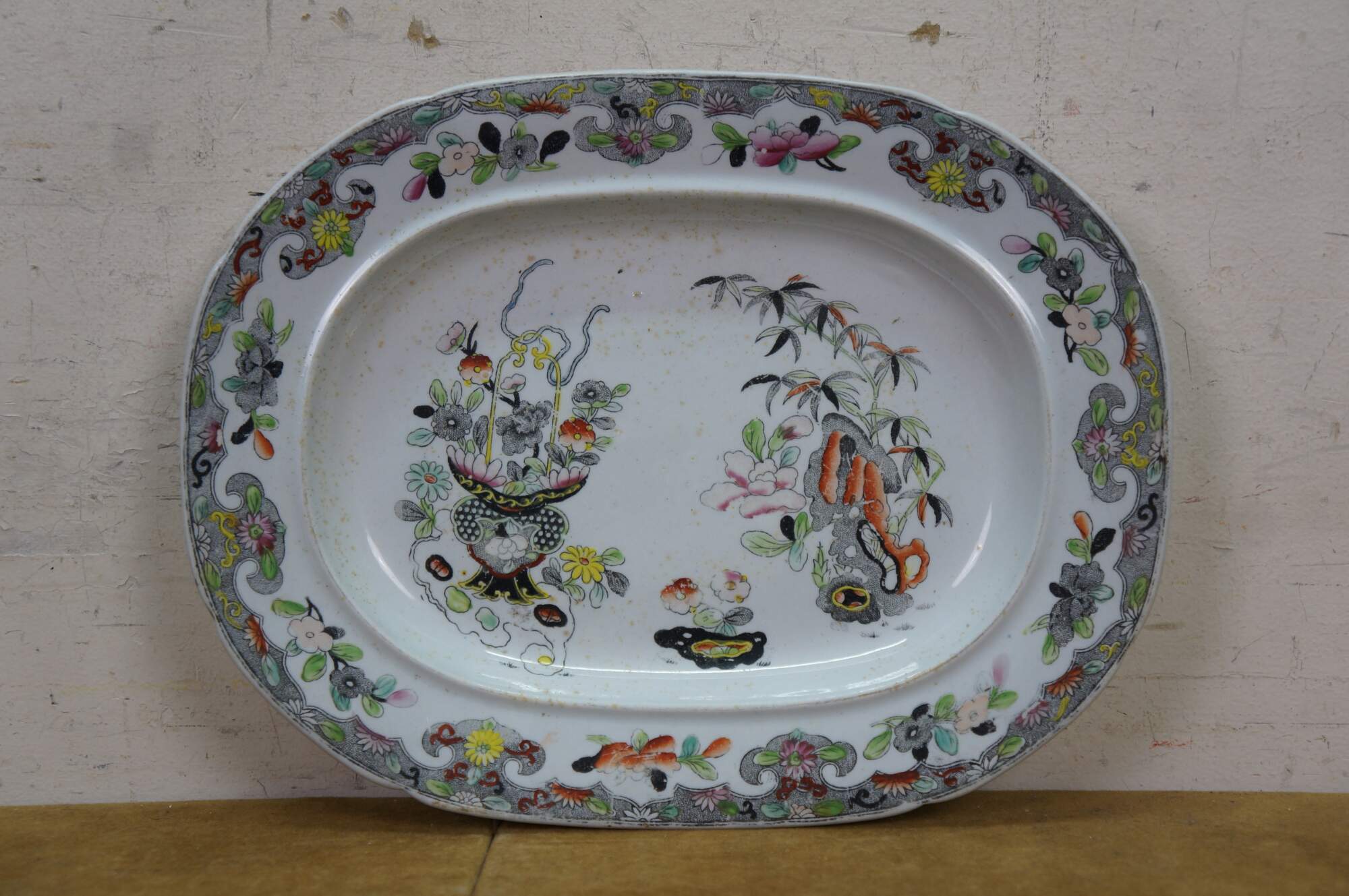 The plate is fully marked on the base with a Royal Arms mark having the Prince of Wales feathers behind and improved ironstone China below, all printed in black. A Plate in this pattern with the same back mark is illustrated on Page 243, plates 186 a & b, of Godden's Guide to Ironstone, by Geoffrey A Godden, published by The Antique Collectors' Club.
