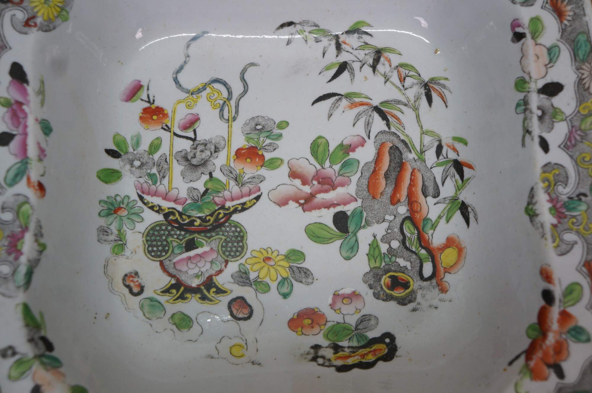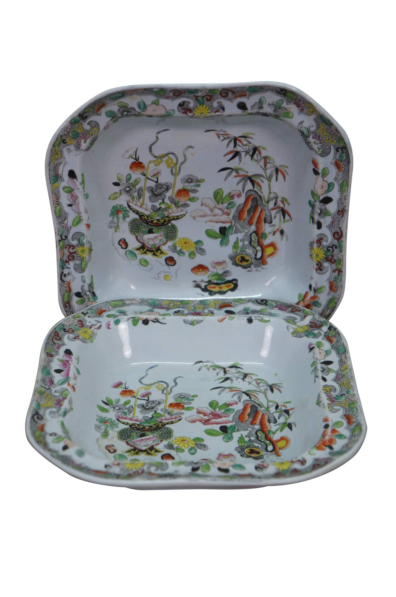 Two antique English Stephen Folch Chinoiserie Square Serving Bowls or trays in the Imari Ironstone Bamboo & Basket pattern with Royal Arms mark, Circa 1825