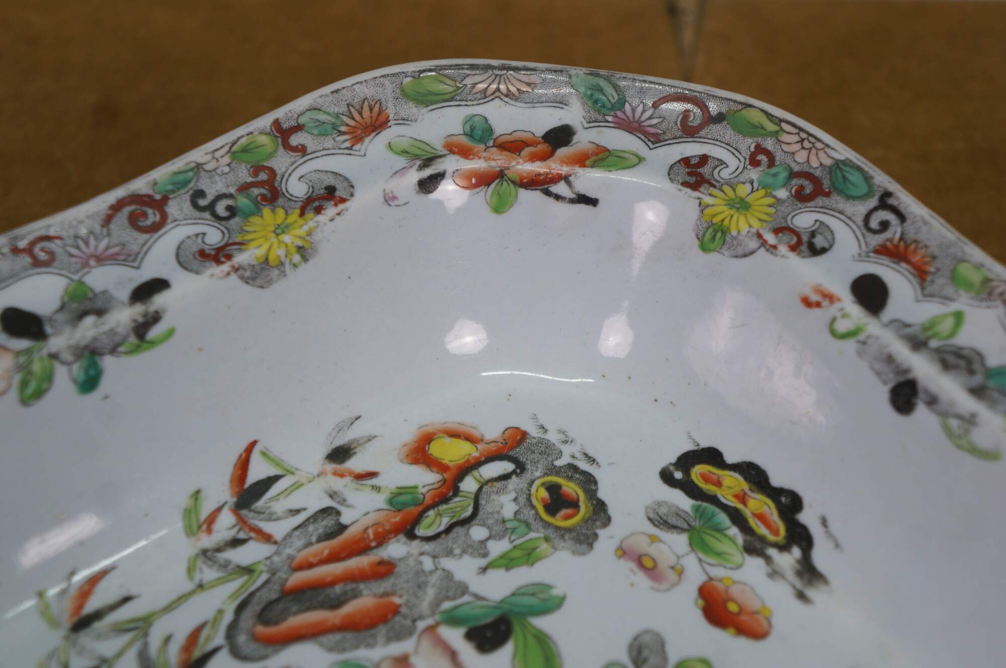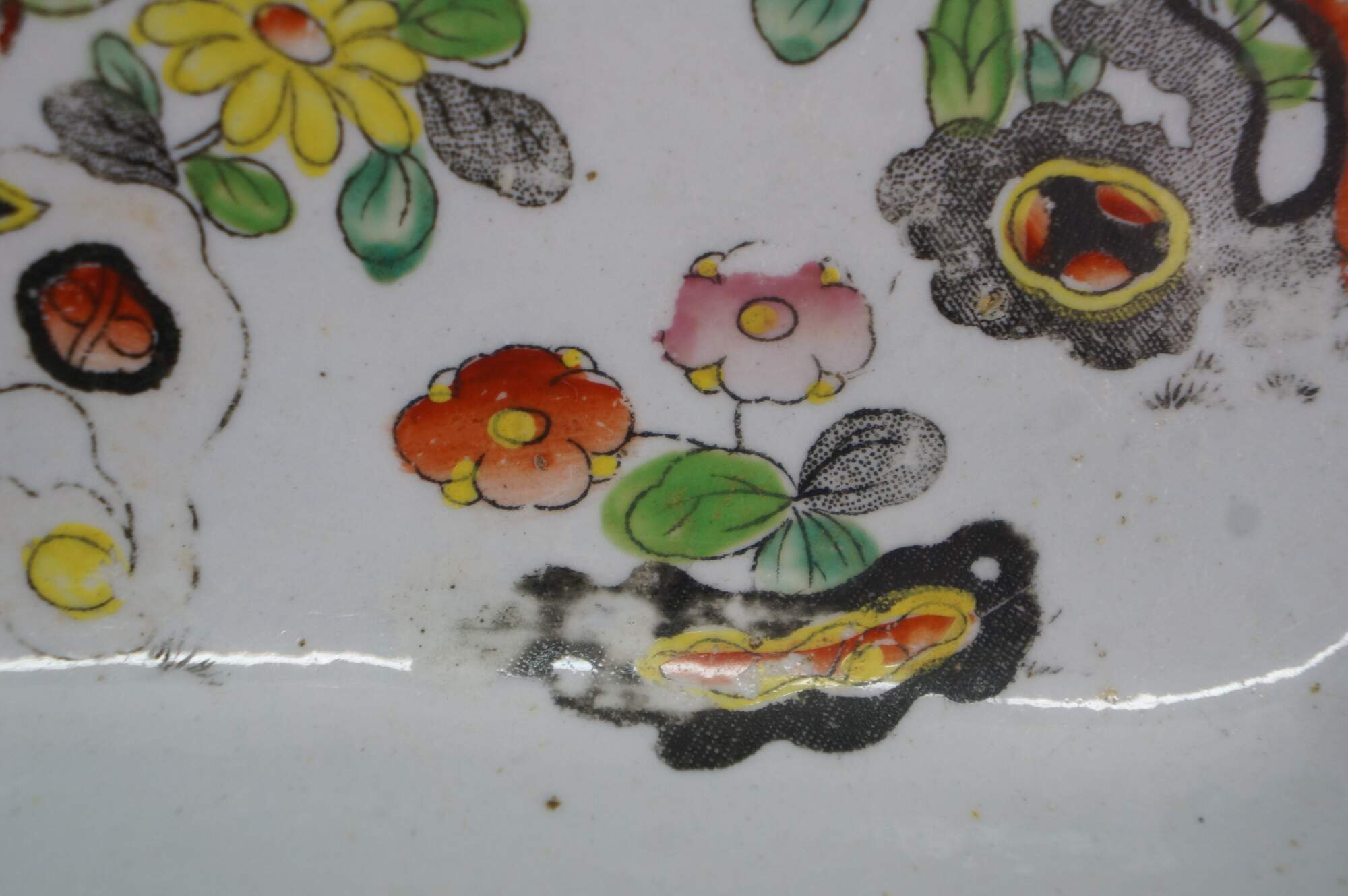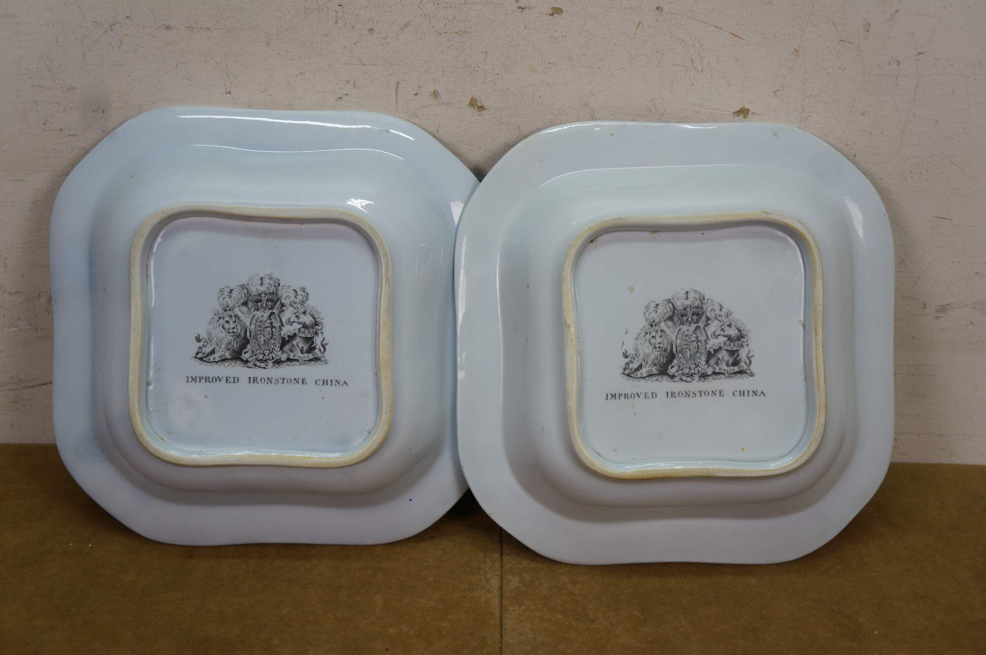 The plate is fully marked on the base with a Royal Arms mark having the Prince of Wales feathers behind and improved ironstone China below, all printed in black. A Plate in this pattern with the same back mark is illustrated on Page 243, plates 186 a & b, of Godden's Guide to Ironstone, by Geoffrey A Godden, published by The Antique Collectors' Club.