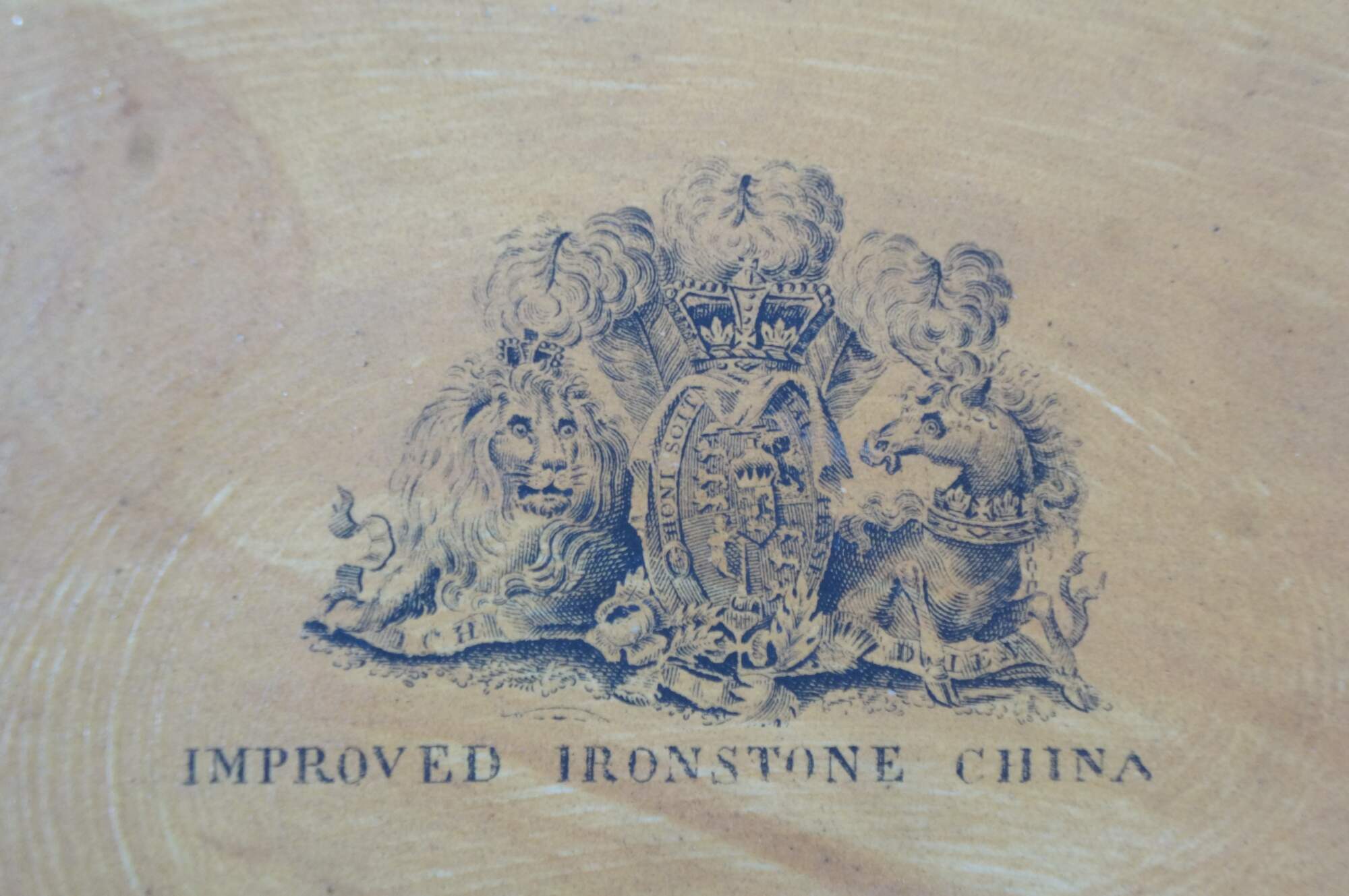 The plate is fully marked on the base with a Royal Arms mark having the Prince of Wales feathers behind and improved ironstone China below, all printed in black. A Plate in this pattern with the same back mark is illustrated on Page 243, plates 186 a & b, of Godden's Guide to Ironstone, by Geoffrey A Godden, published by The Antique Collectors' Club.