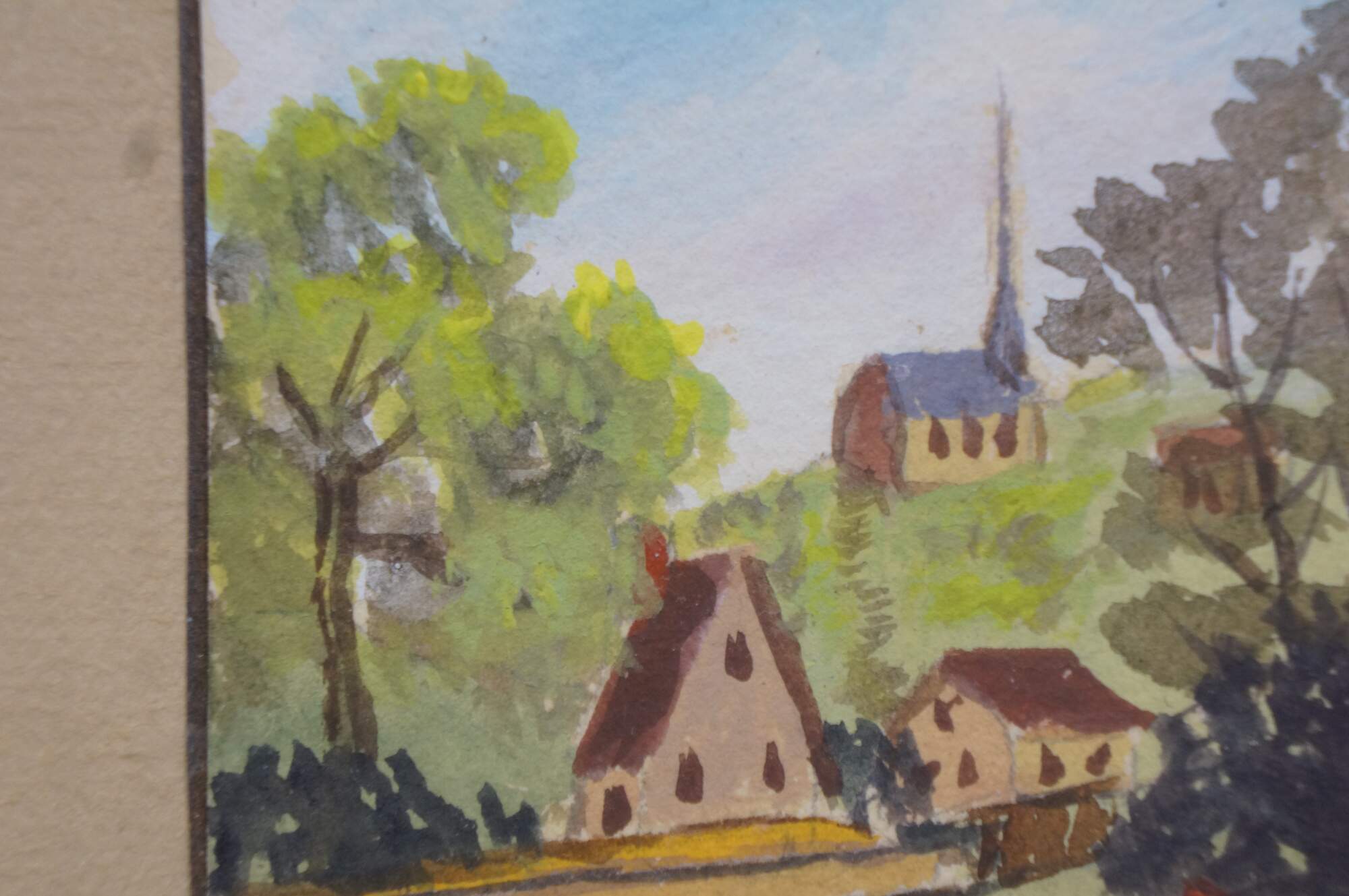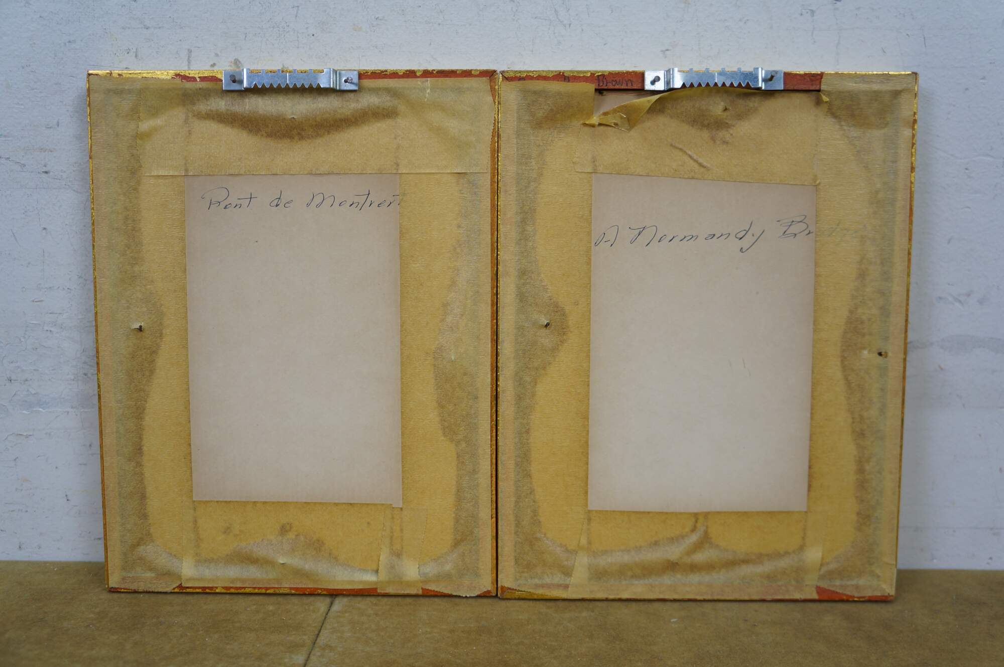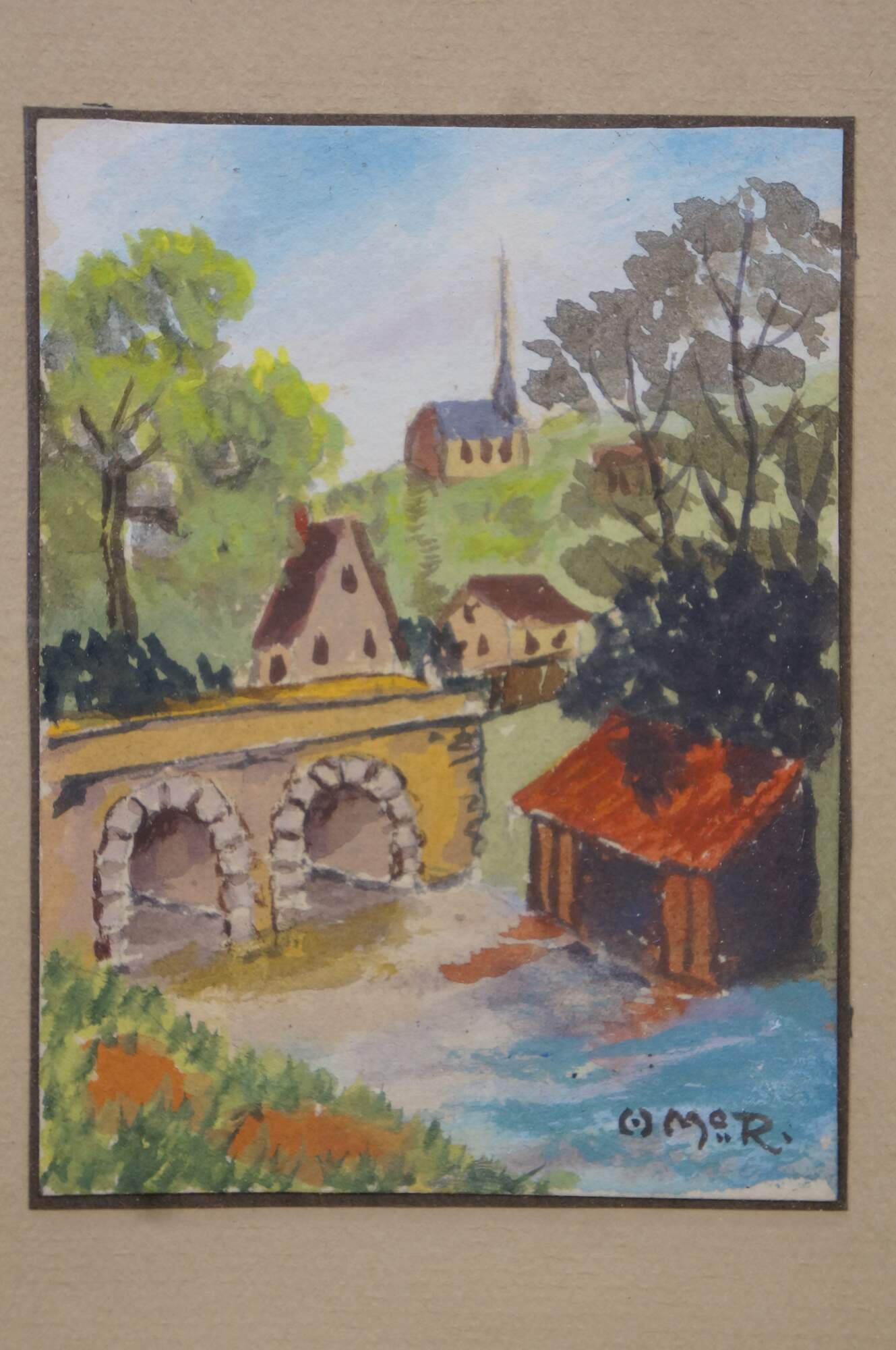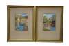 2 Mid Century Still Life Watercolor Paintings by Helen J. McRae of New York. Circa mid-20th Century. Helen had masters in Fine Art. The two paintings highlight cityscape centered around bridges. Signed lower corners. Neatly framed on a beige mat with gold finished frame.