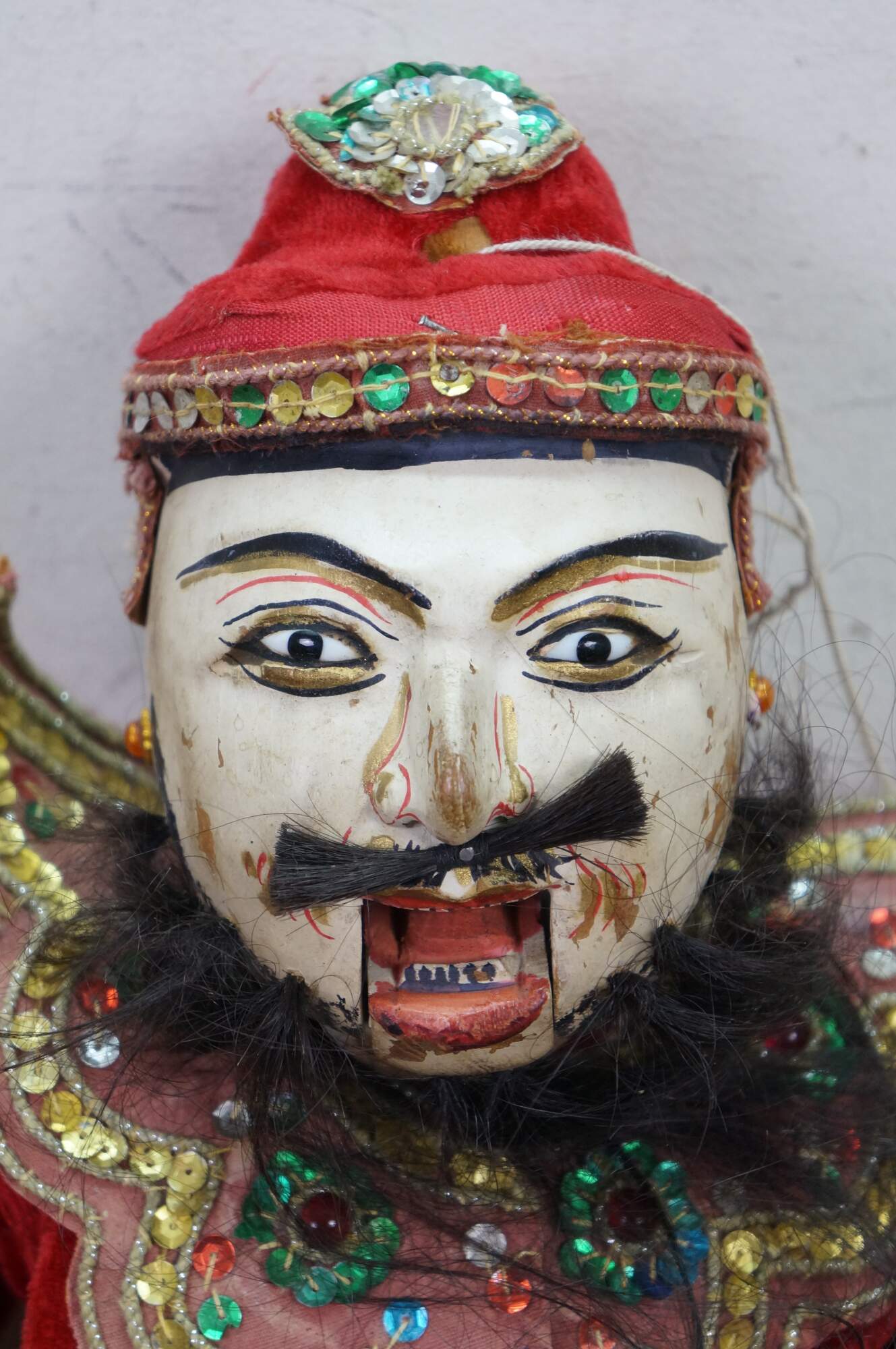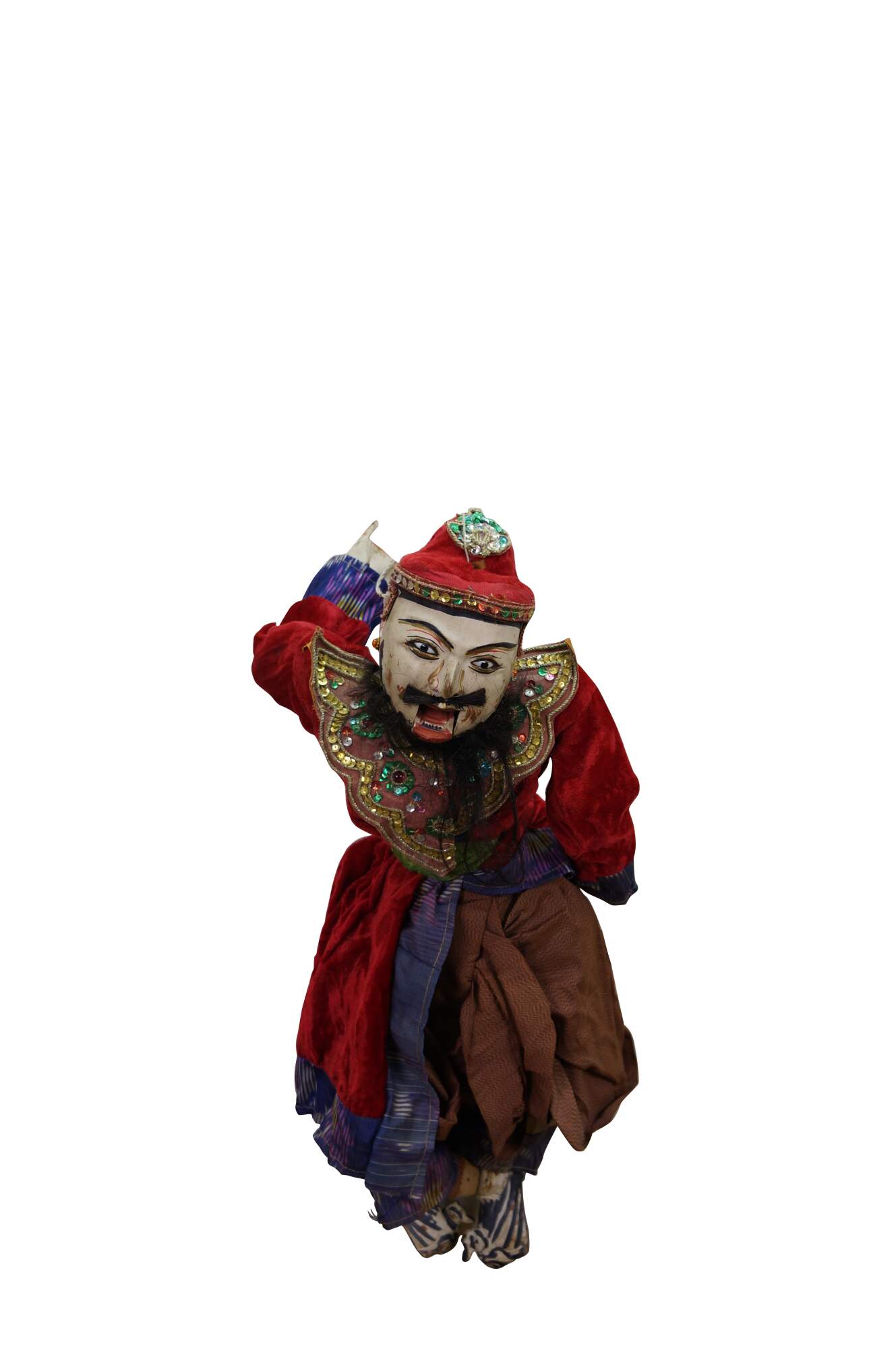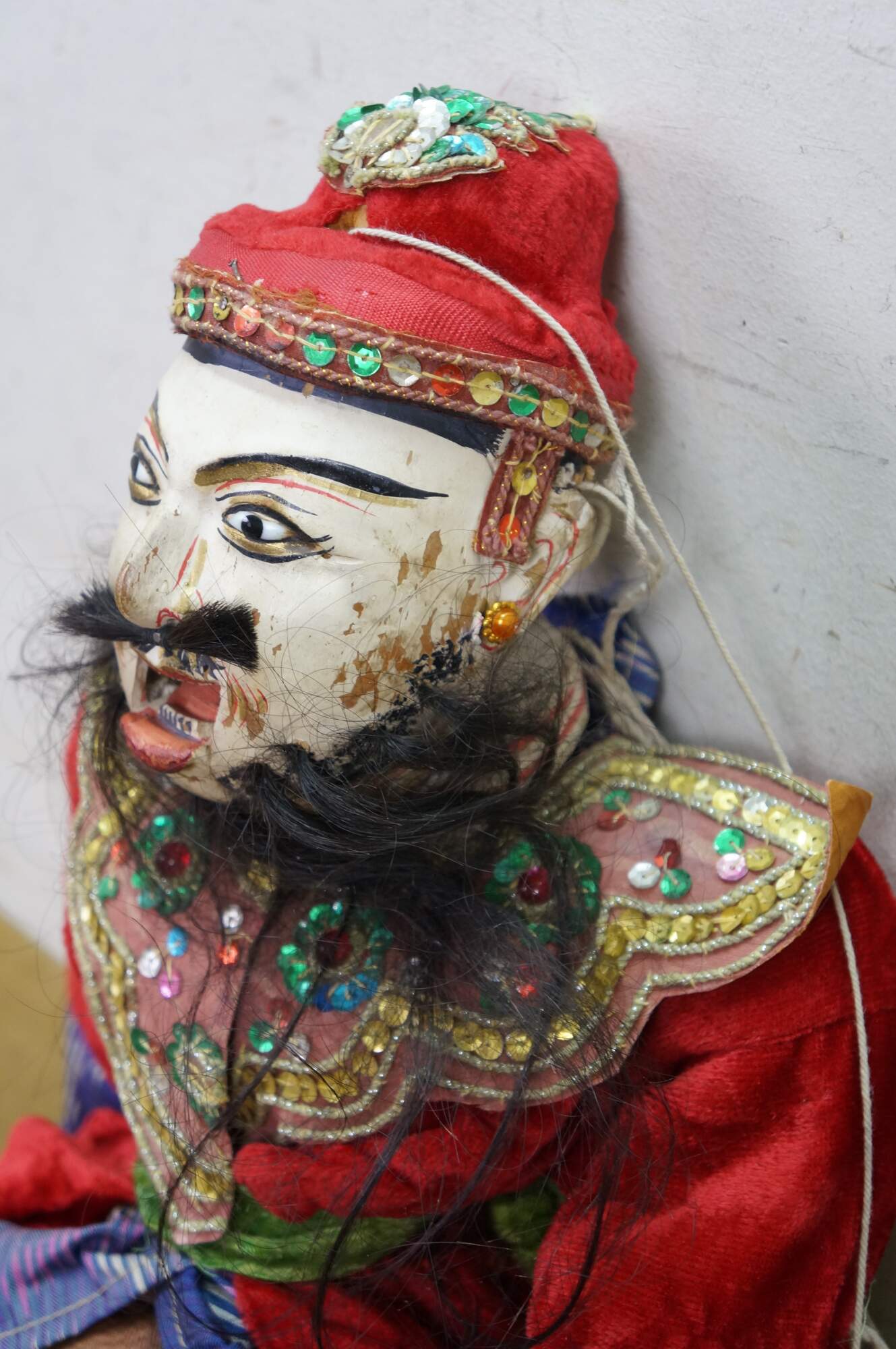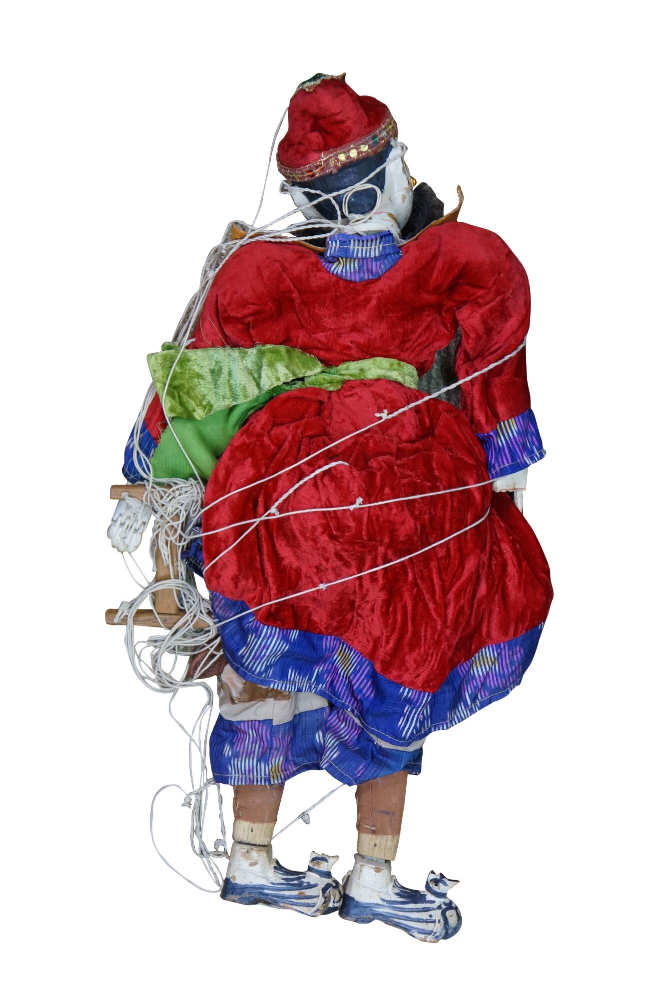 Burmese carved wood marionette of the alchemist Zawgyi, this jointed puppet used in the traditional Burmese puppet theatre (yoke thay) in a story of creation from the Hindu epic the Ramayana, Zawgyi is one of the most difficult parts to perform and only the most experienced puppeteers command this marionette