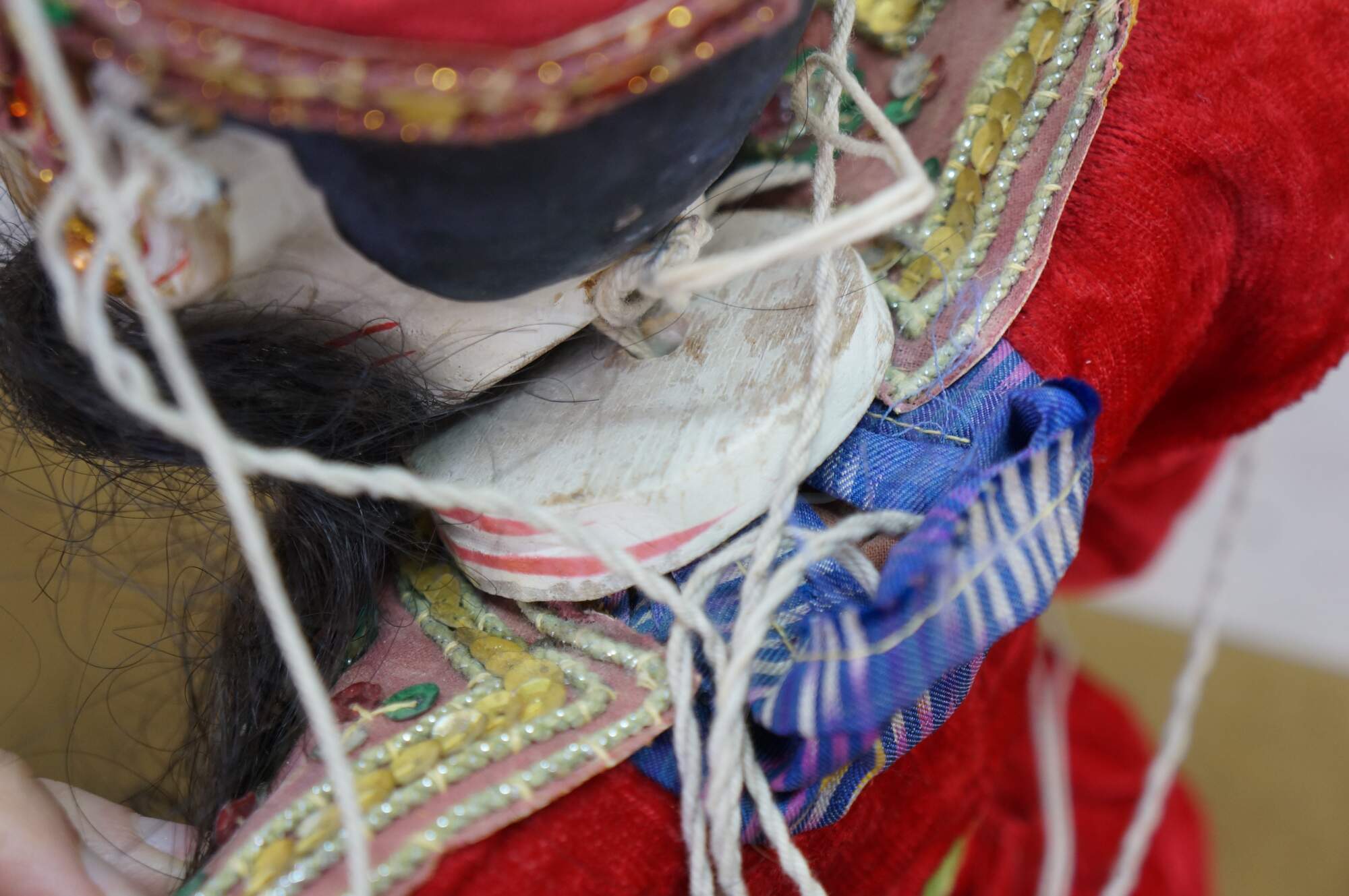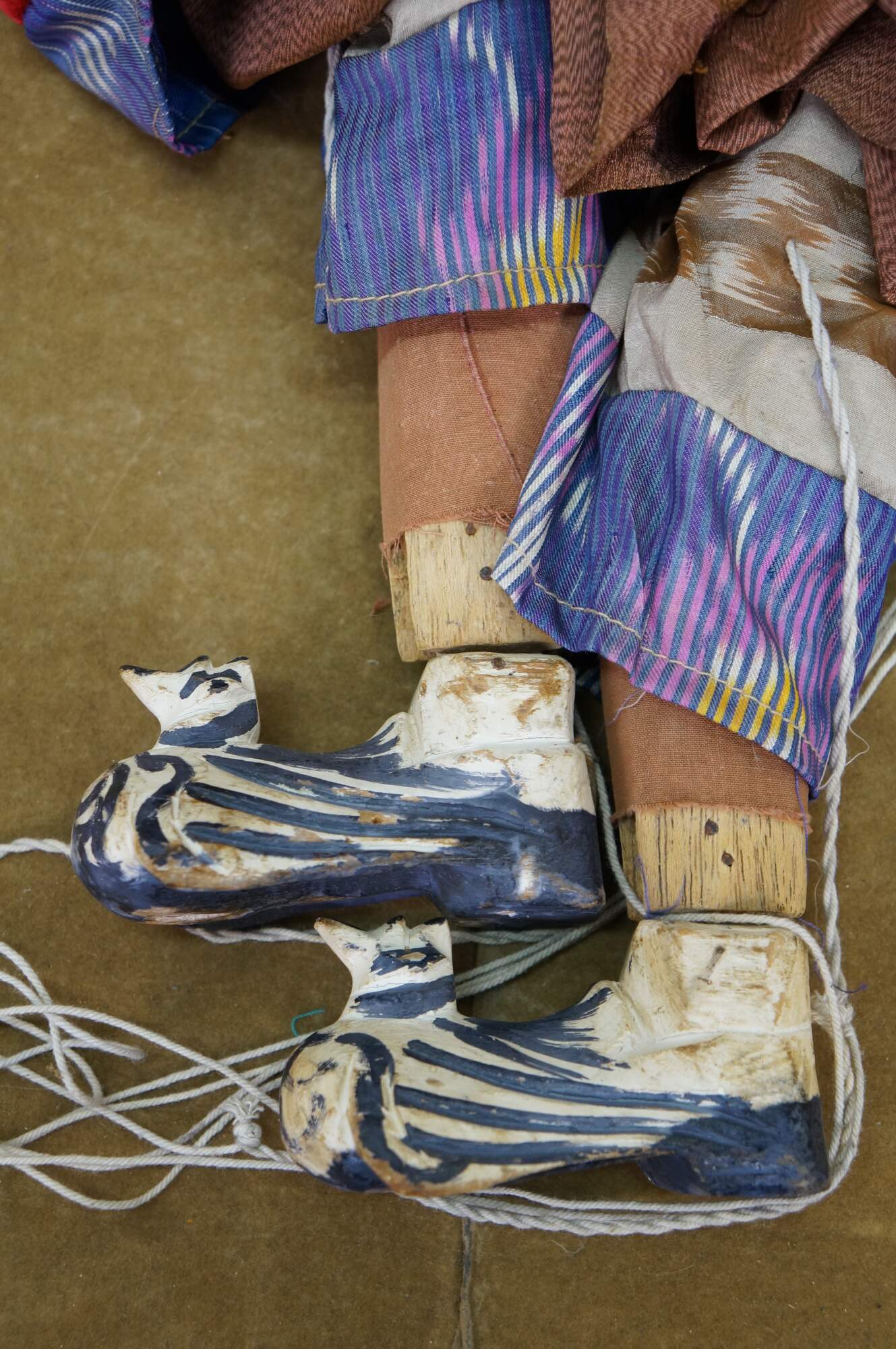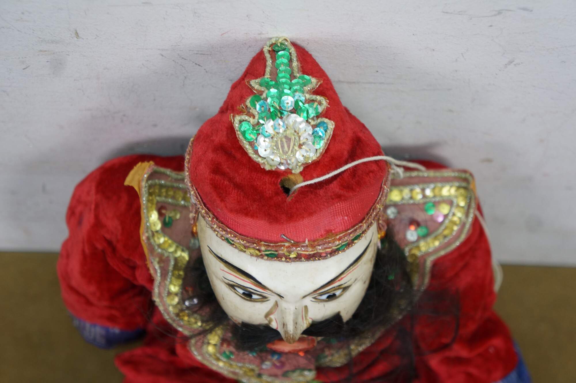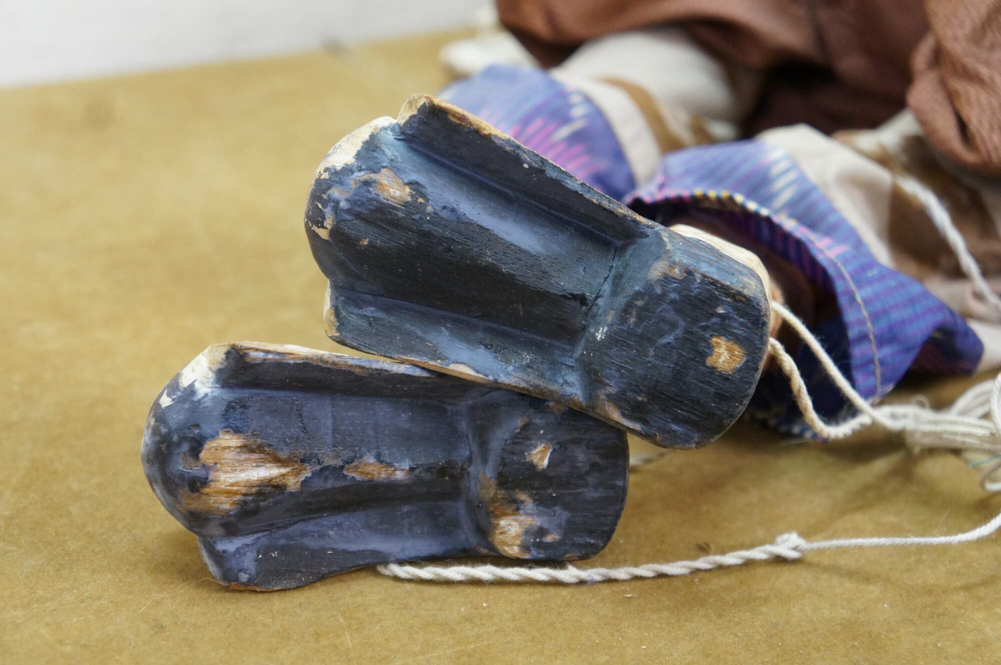 Burmese carved wood marionette of the alchemist Zawgyi, this jointed puppet used in the traditional Burmese puppet theatre (yoke thay) in a story of creation from the Hindu epic the Ramayana, Zawgyi is one of the most difficult parts to perform and only the most experienced puppeteers command this marionette