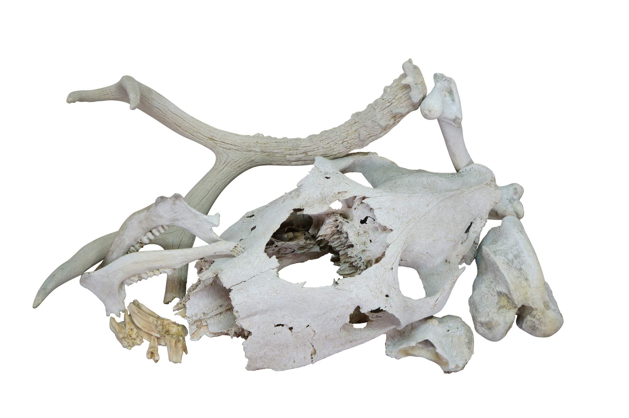 Lot of Deer Bones. Includes parts of a skull, jaw and antlers. Some smaller miscellaneous bones as well.