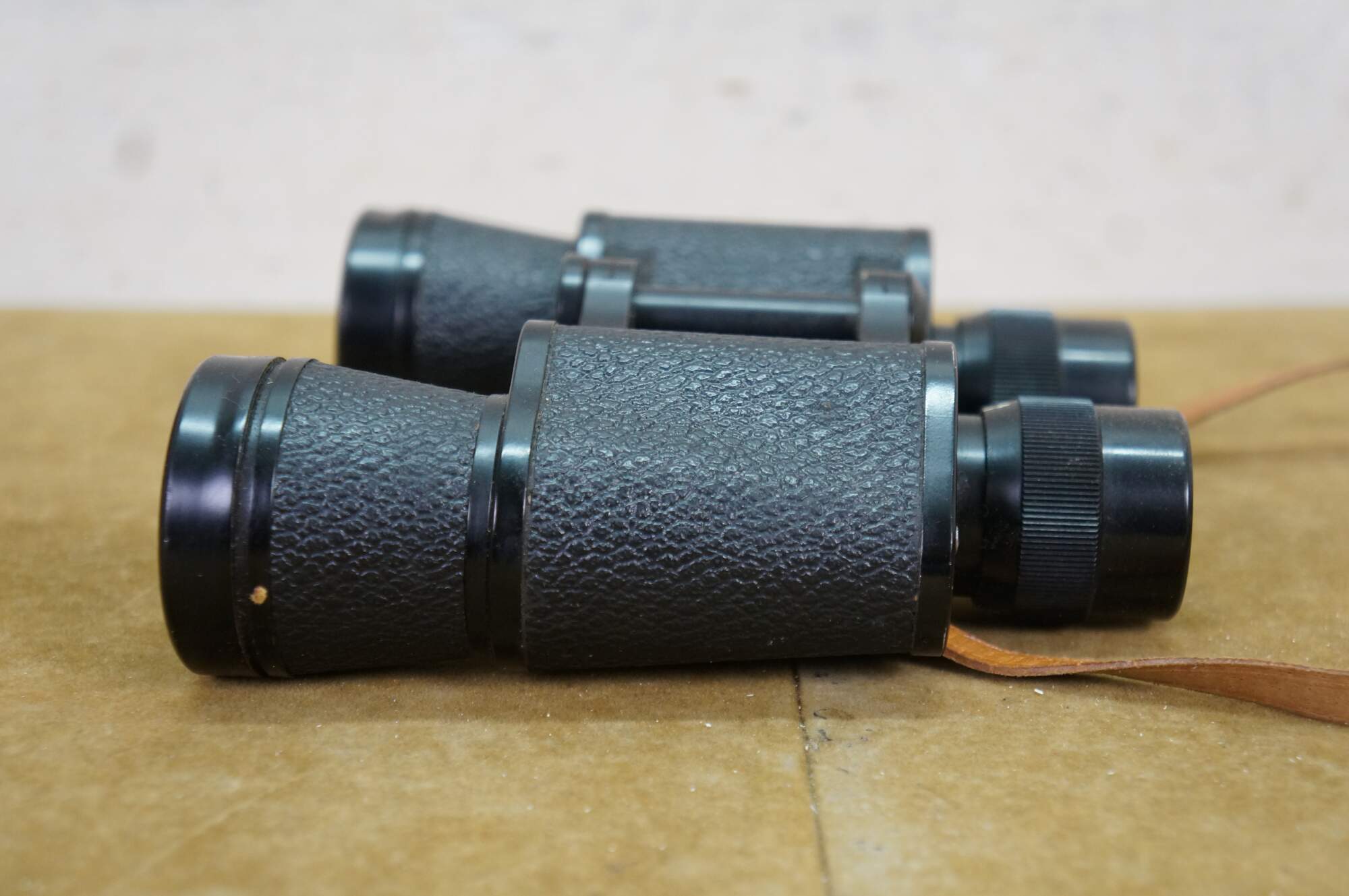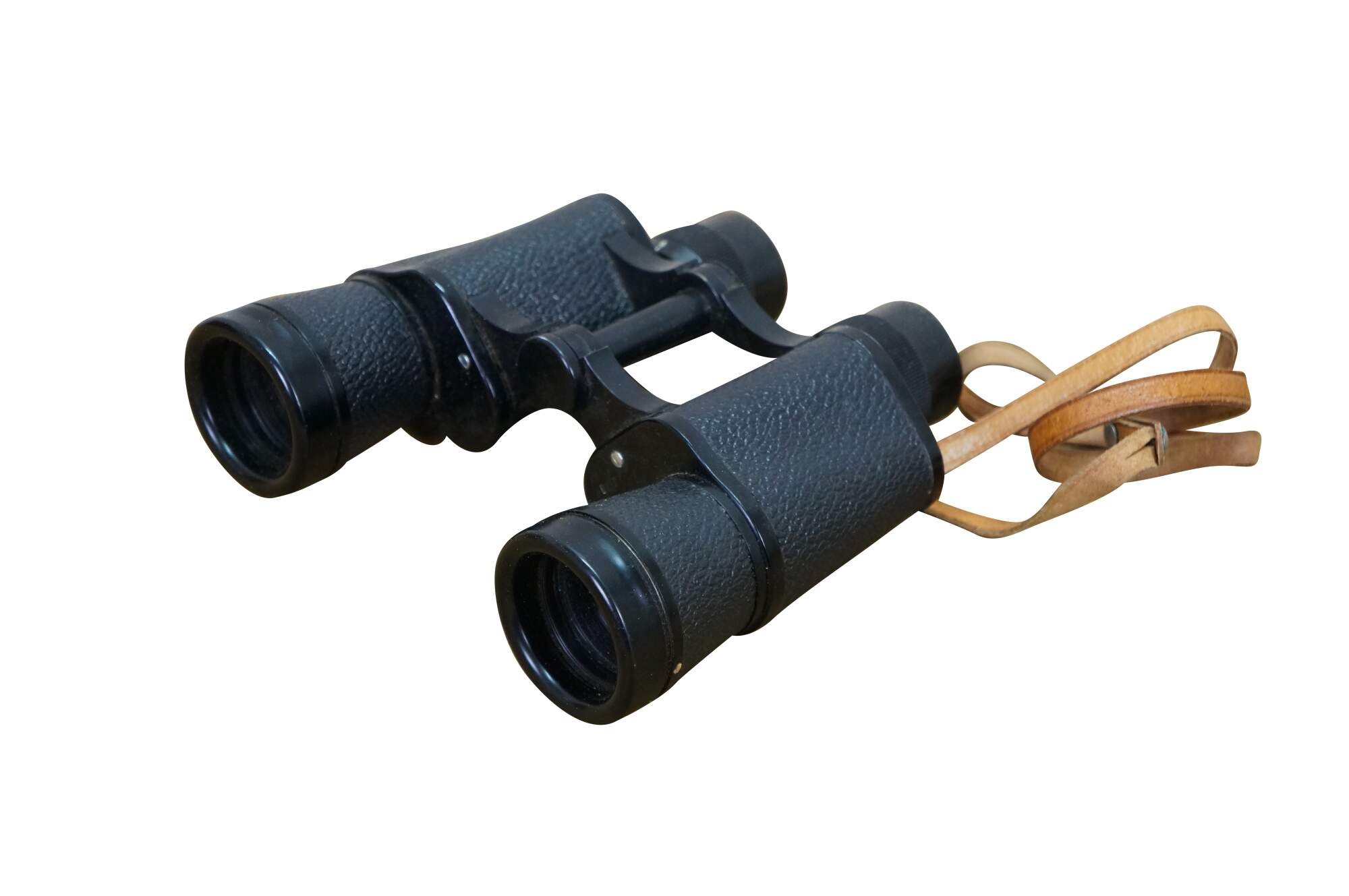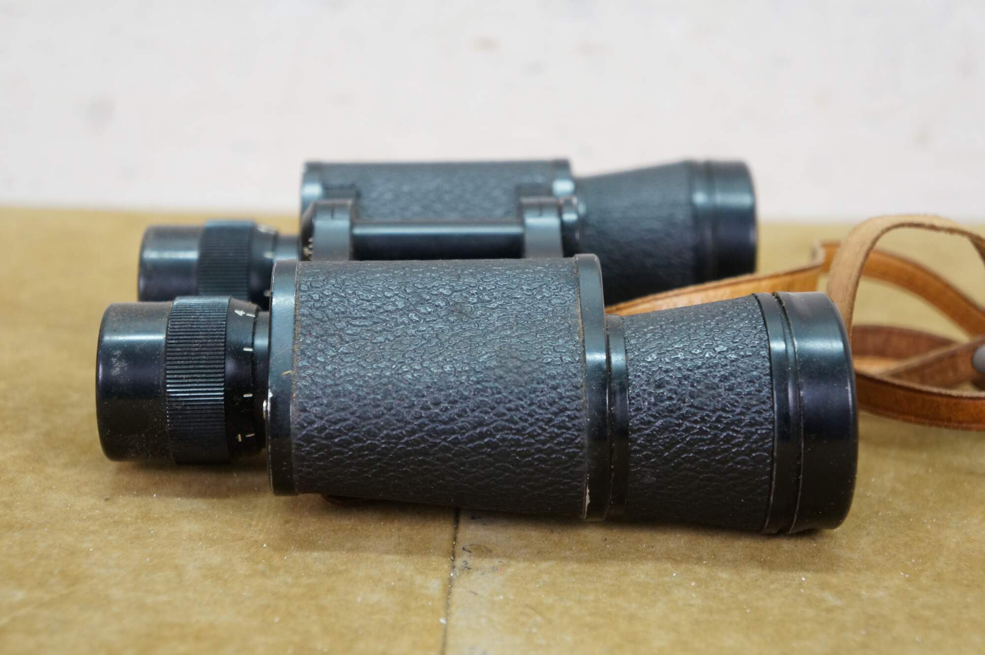 Vintage pair of wide-angle binoculars made in Japan, featuring coated optics and sturdy construction with Hoya glass components. Includes leather case.