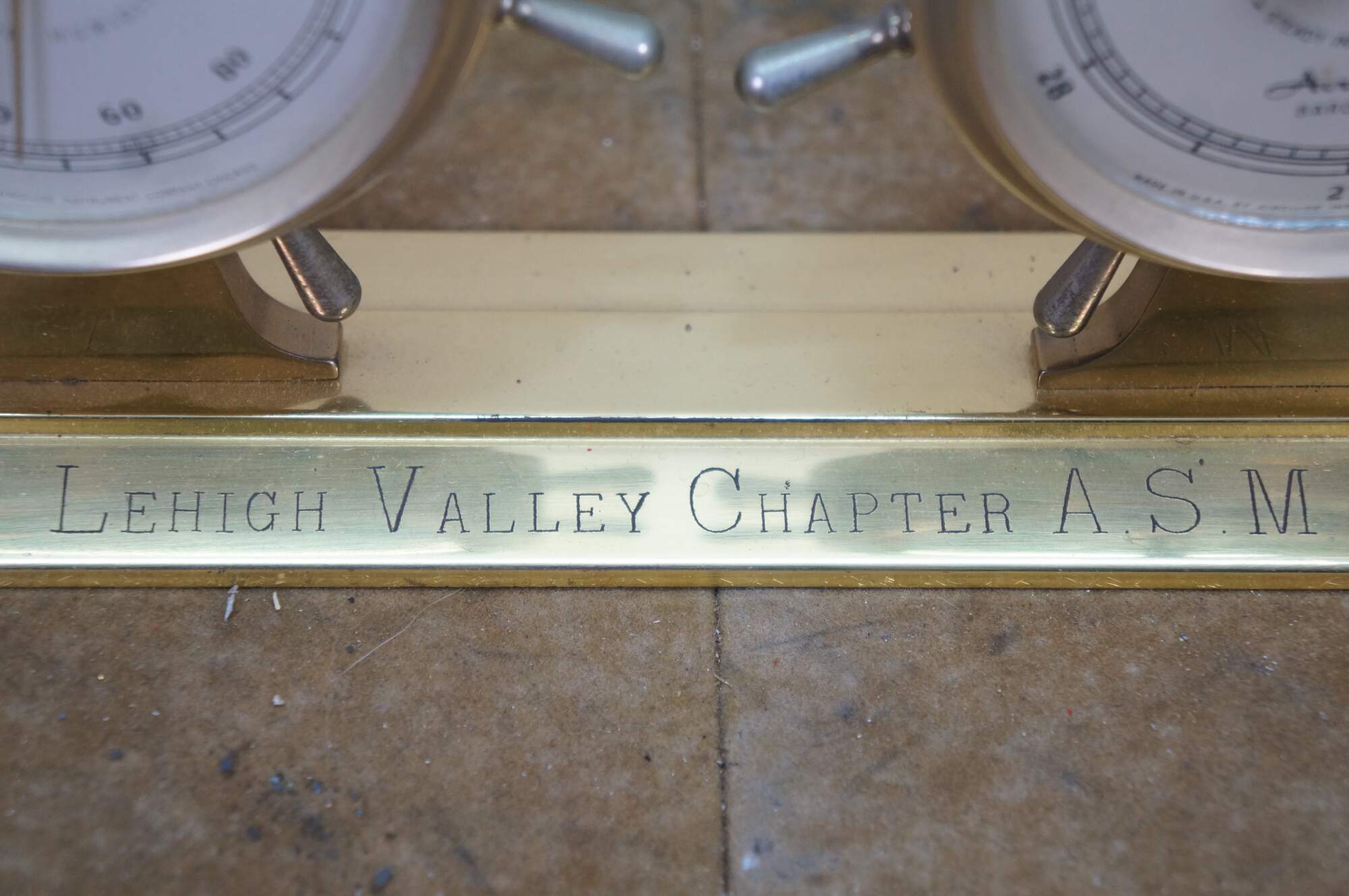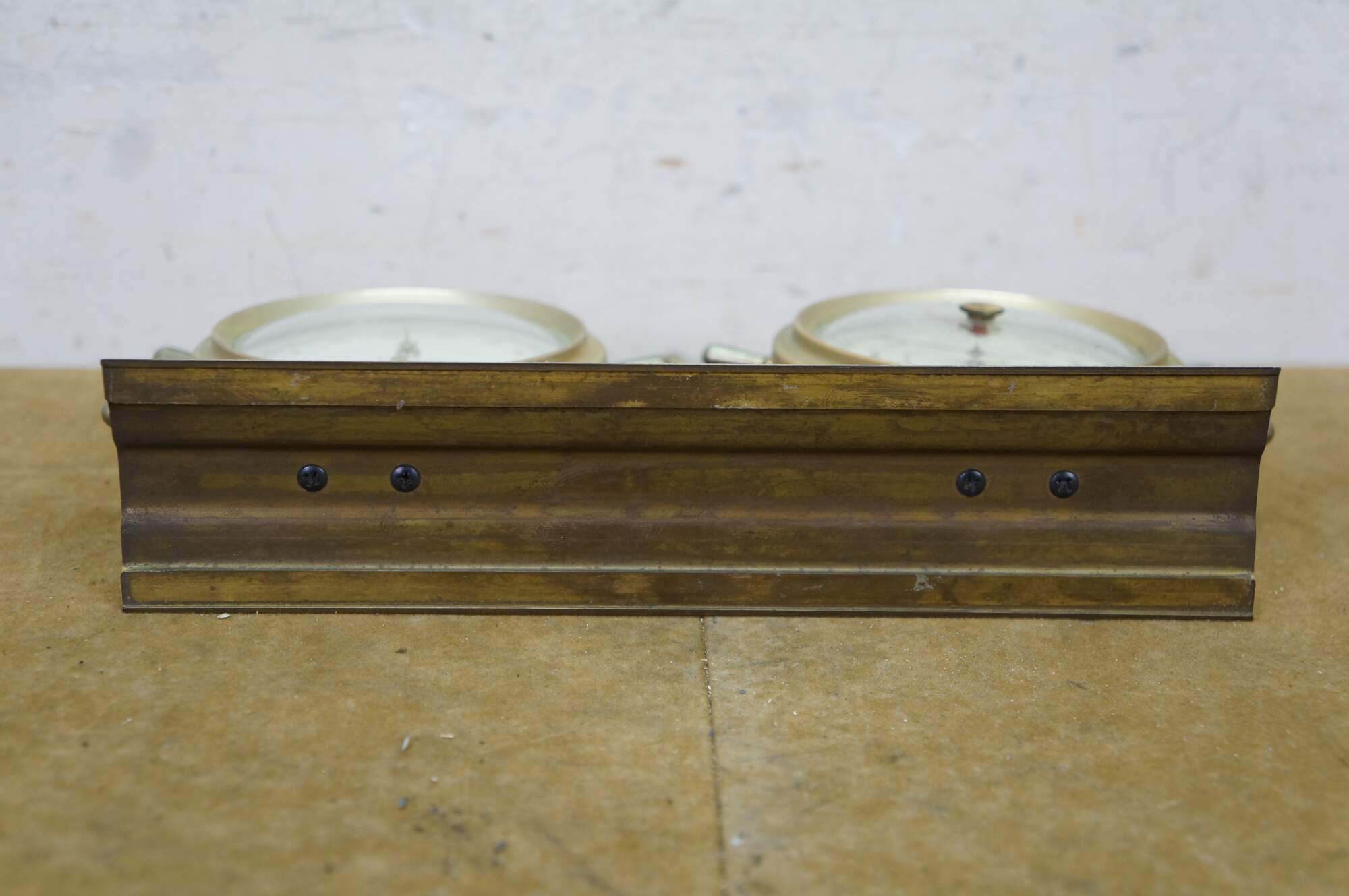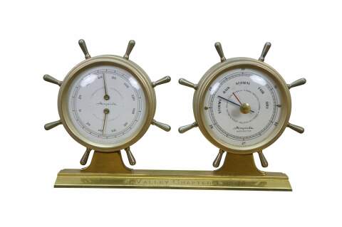 Nautical-themed barometer and thermometer gauge set. Features Brass-colored construction, decorative base, and two gauges for measuring atmospheric pressure and temperature