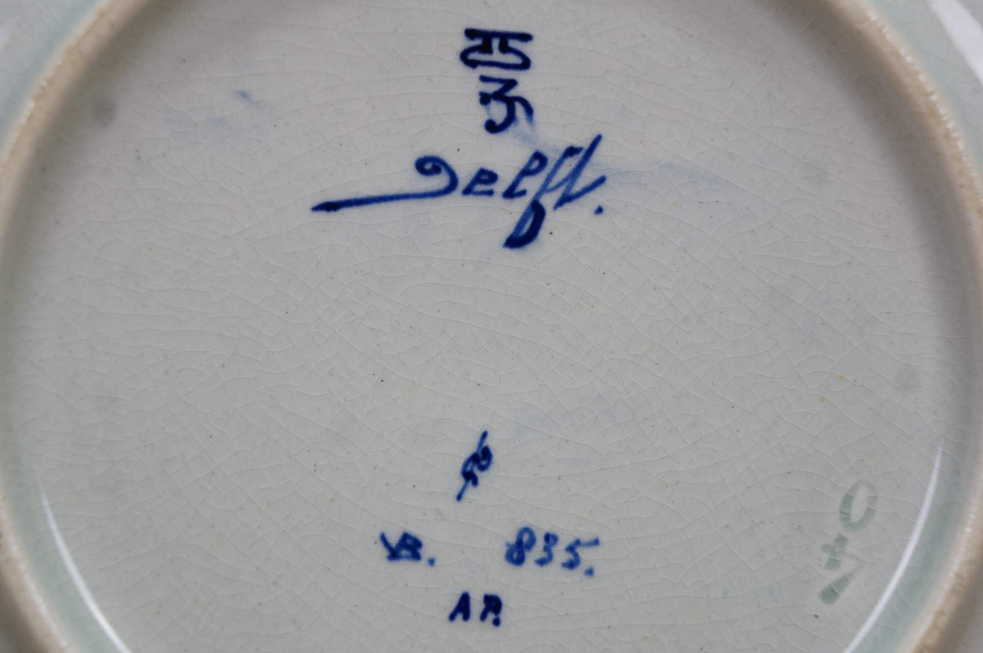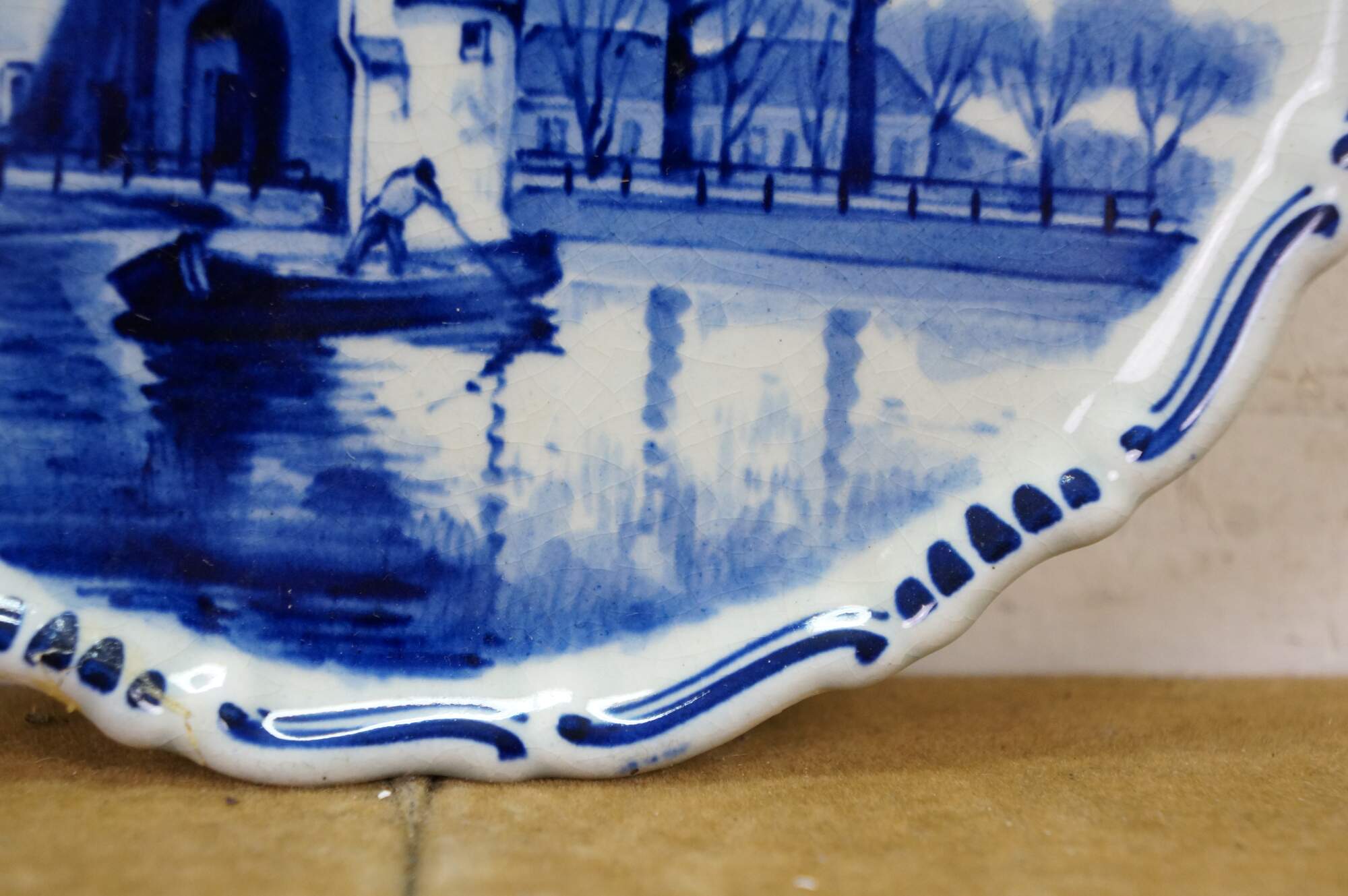 An early 20th Hand Painted Delft Wall Hanging Plate. Features a river scene in Delft, South Hollands showcasing the Oostpoort. The Oostpoort is a historic 15th-century fortified city gate built in the Brick Gothic style. Located at the eastern end of the old town, it is a prominent, photogenic landmark featuring two towers and an old bridge. It is part of the former defense system. The plate is blue and white with a scalloped edge. It is signed along the back side and dates to 1922.