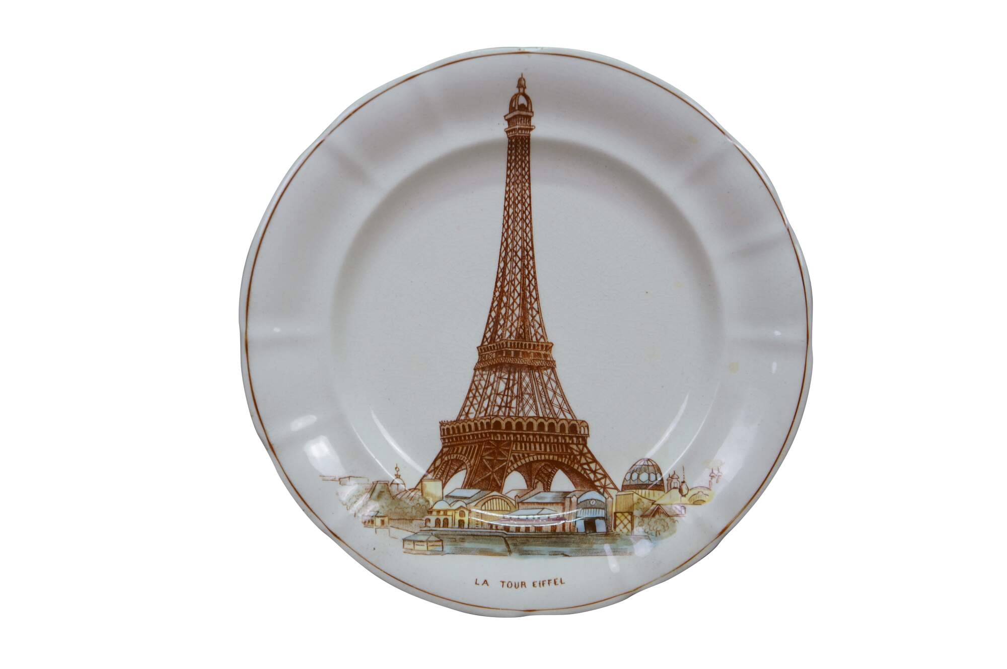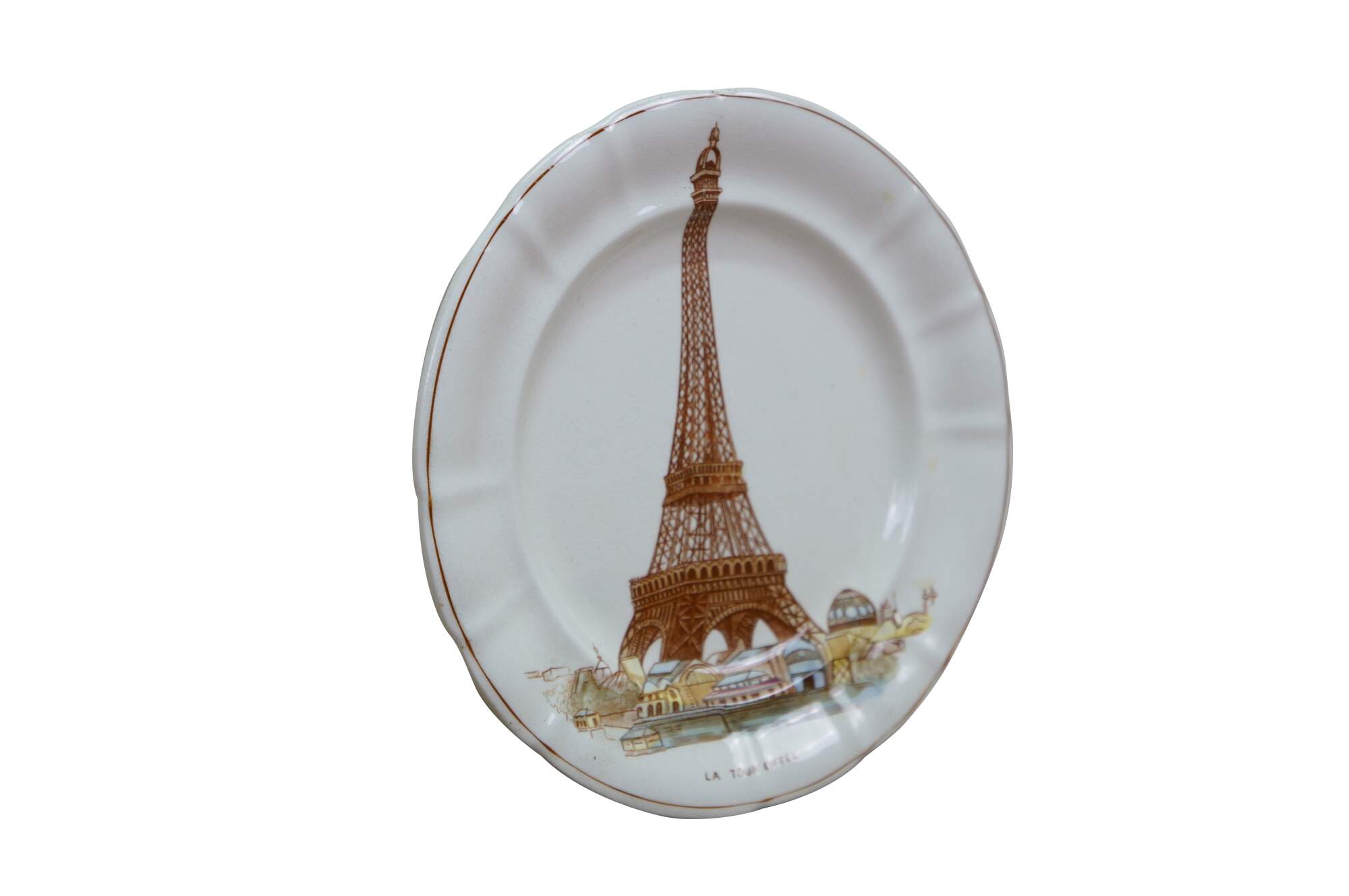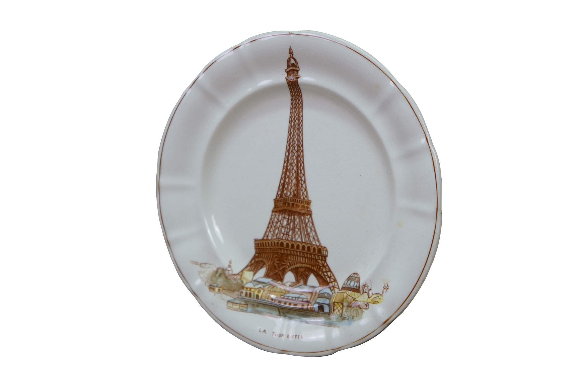 Late 20th Century Limoges porcelain souvenir plate depicting the Eiffel Tower in Paris, France.