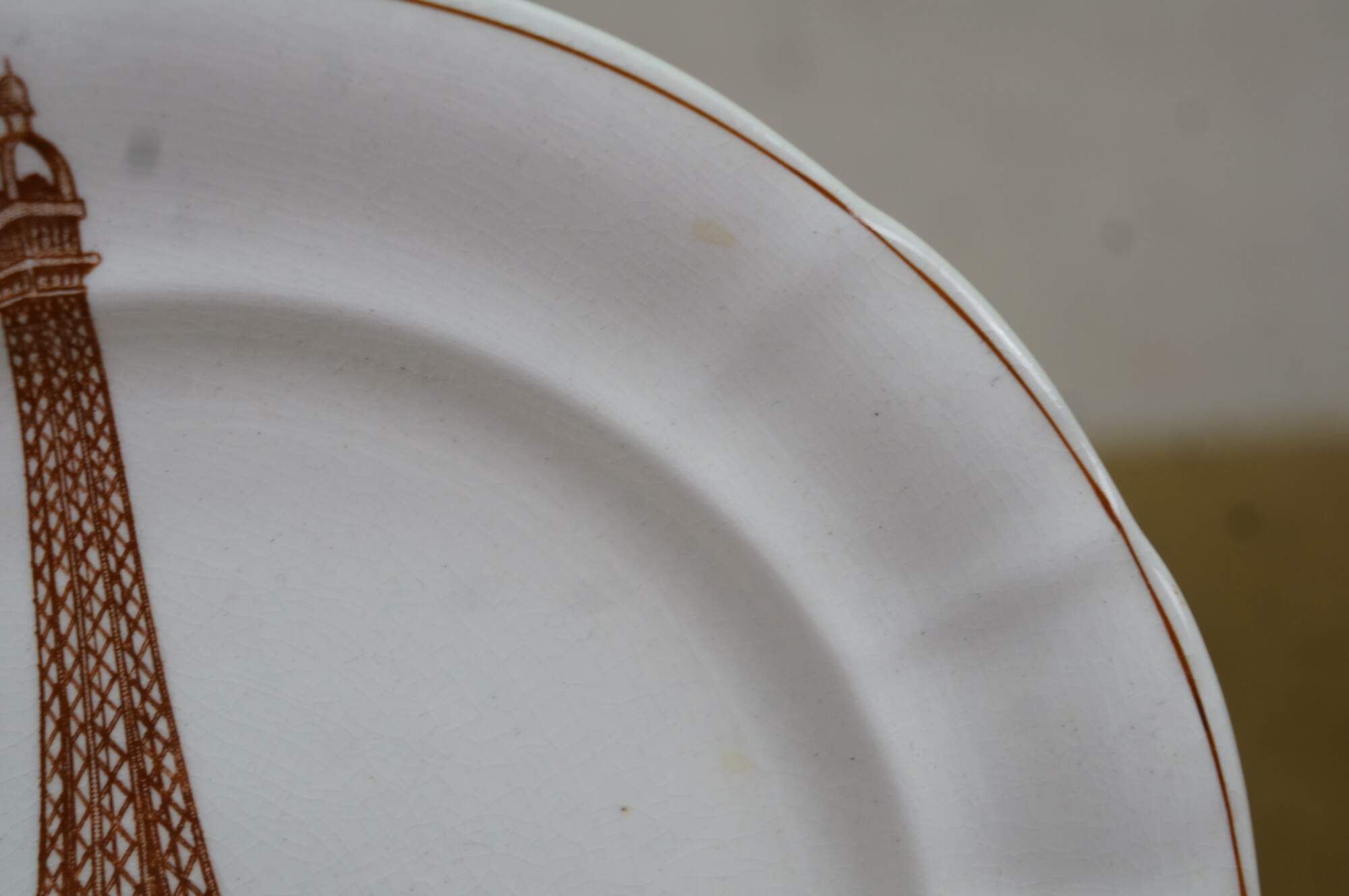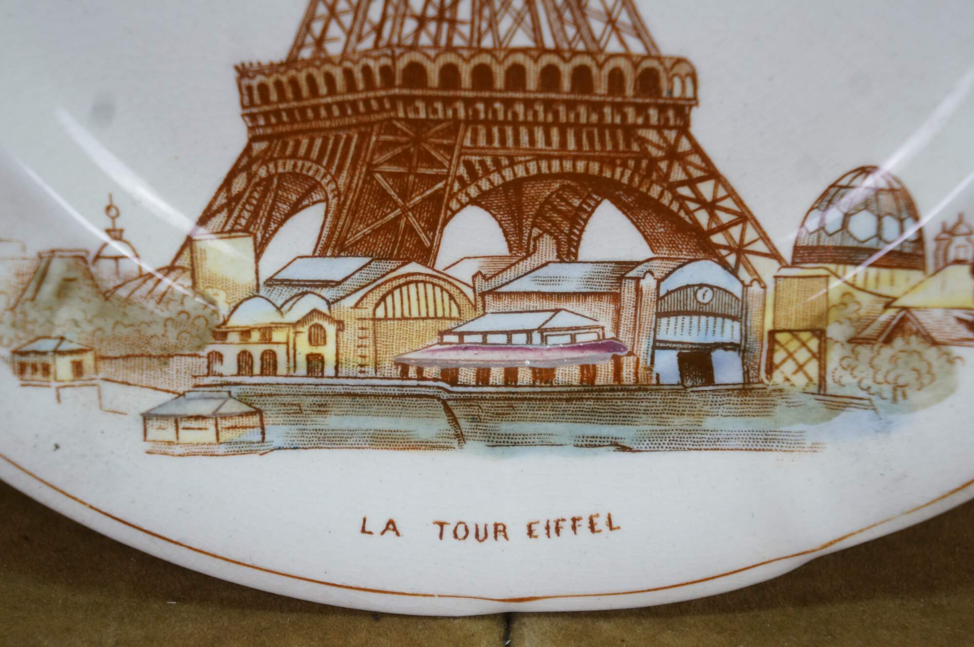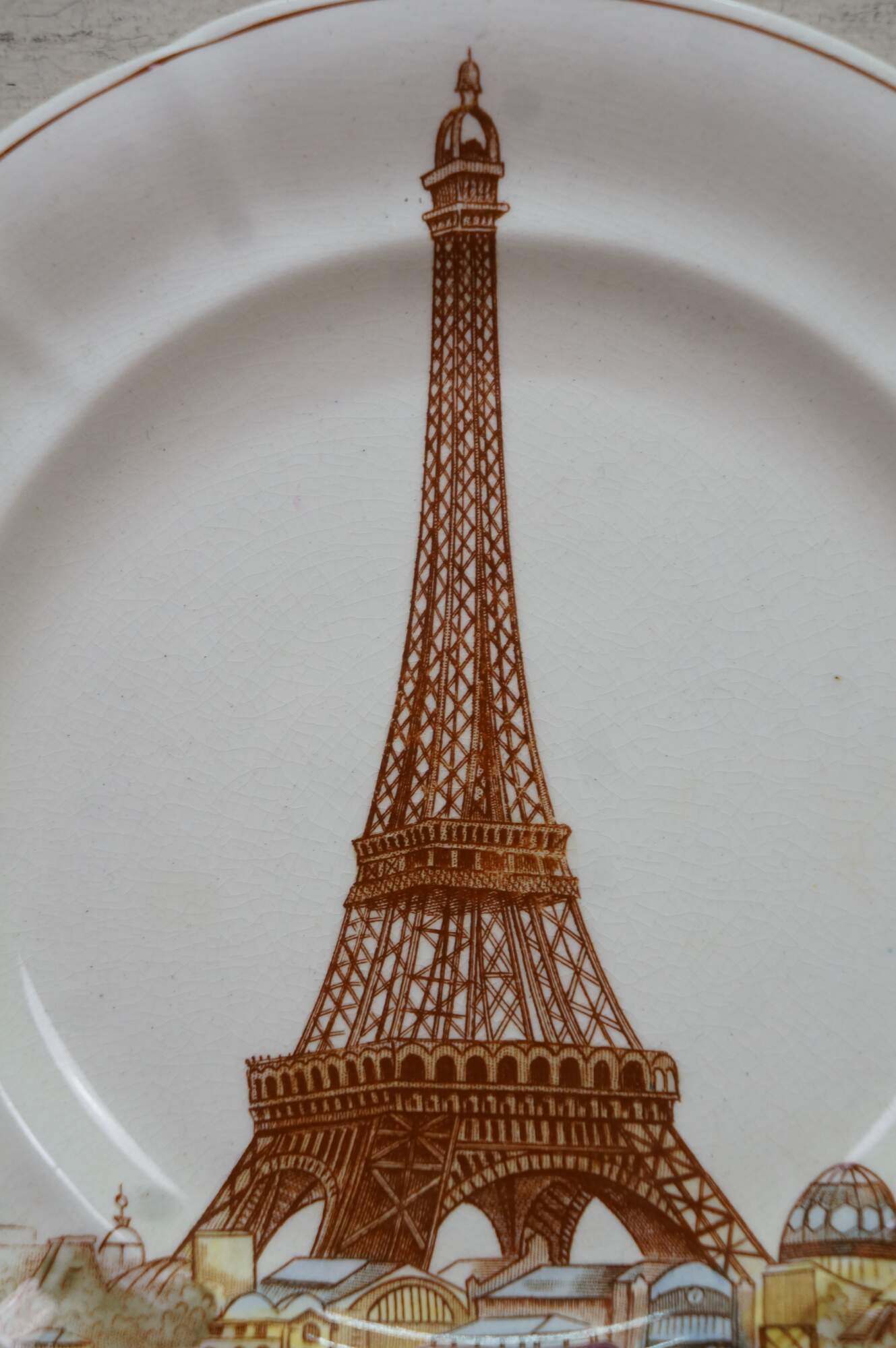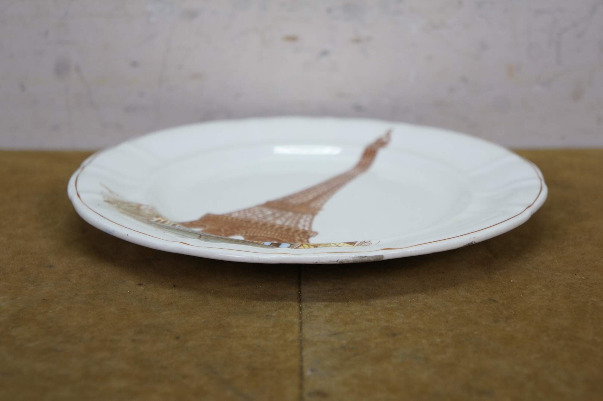 Late 20th Century Limoges porcelain souvenir plate depicting the Eiffel Tower in Paris, France.