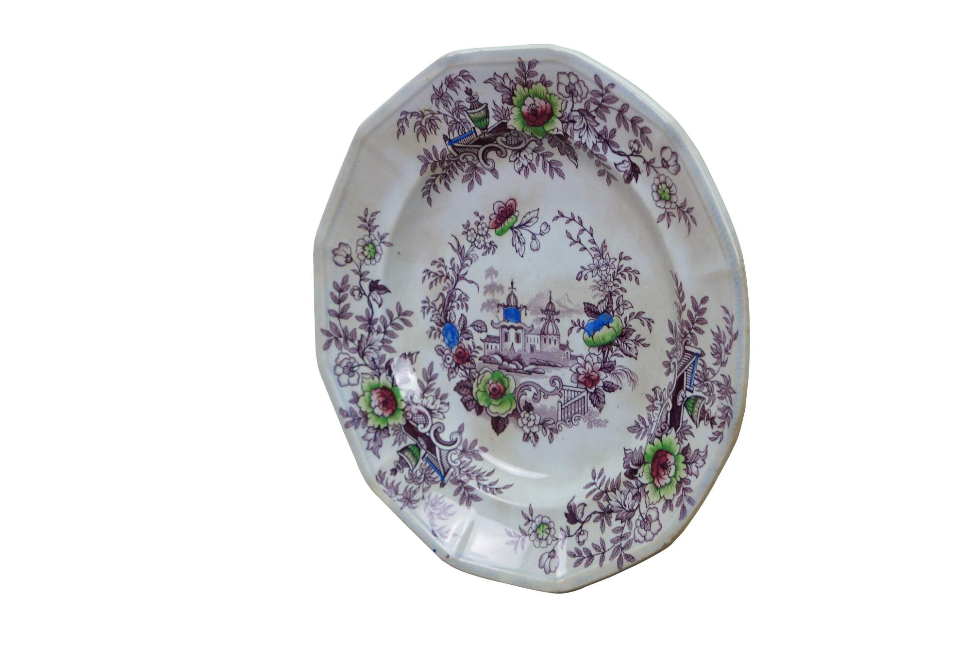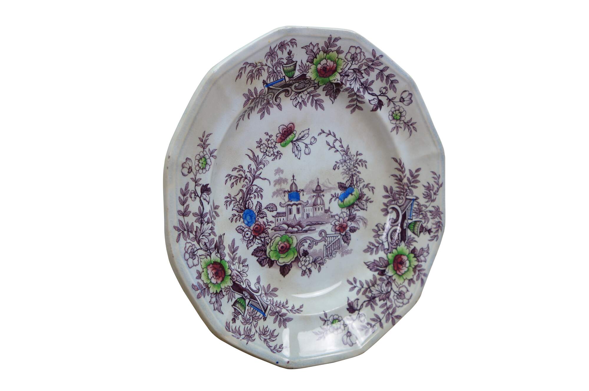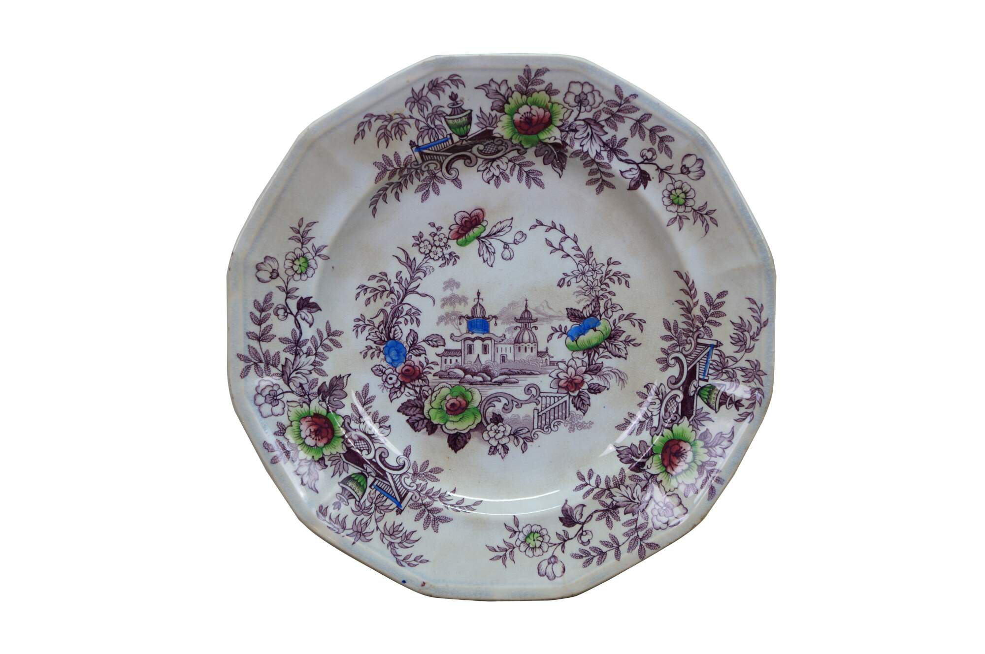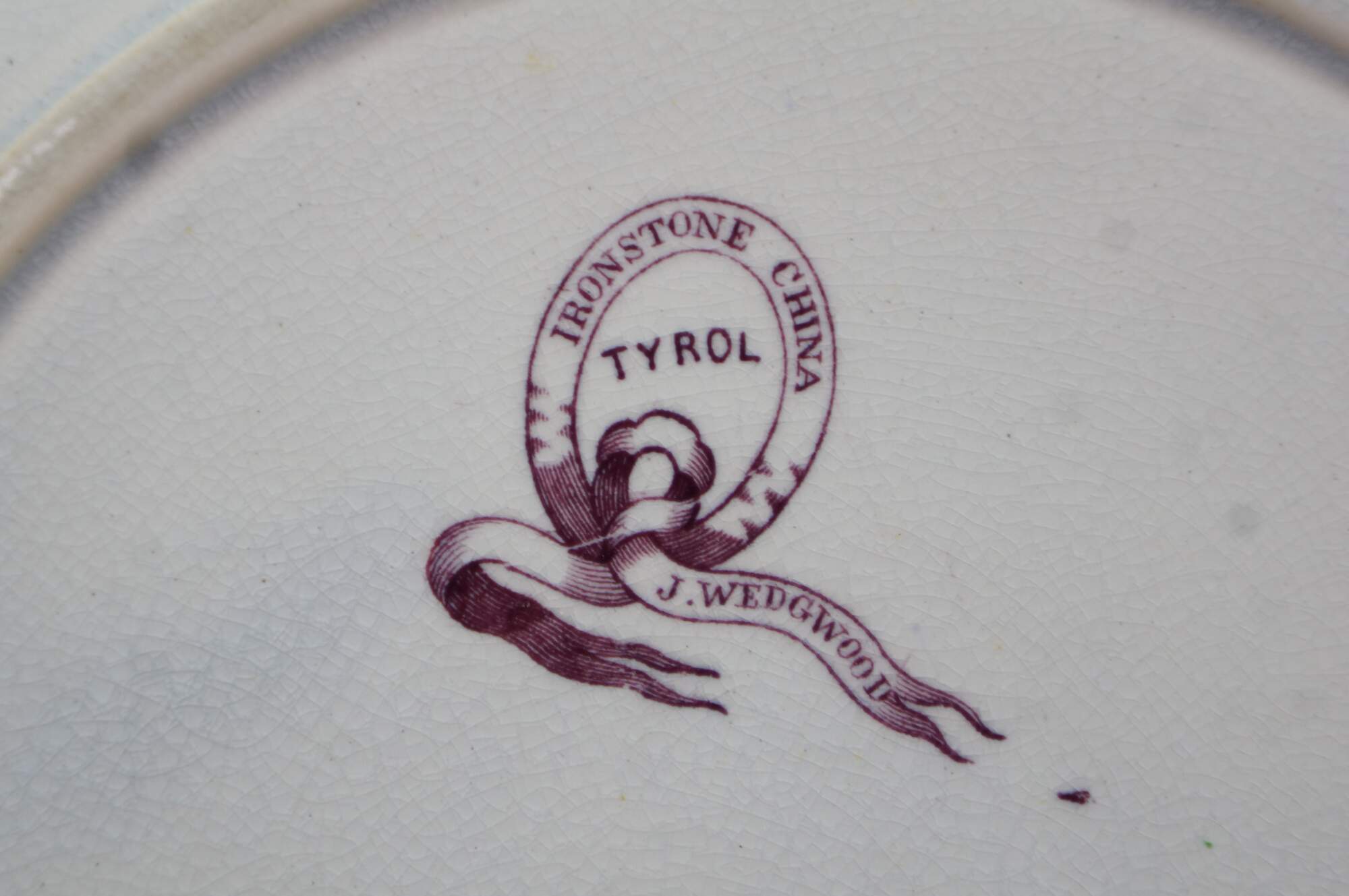 Antique Wedgwood Tyrol Staffordshire Transferware Plate. Features a pastoral scene in purple, green, and blue.
