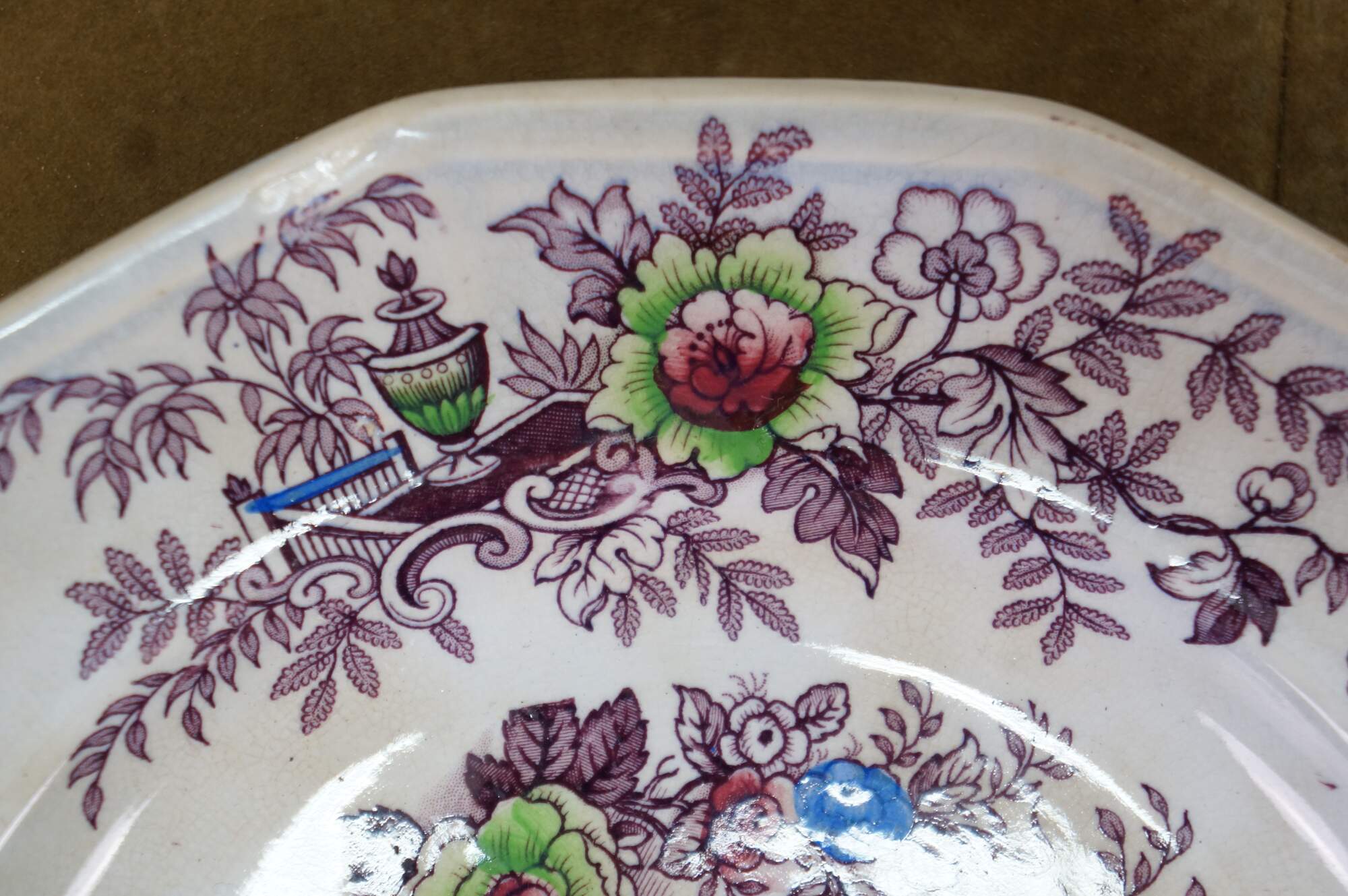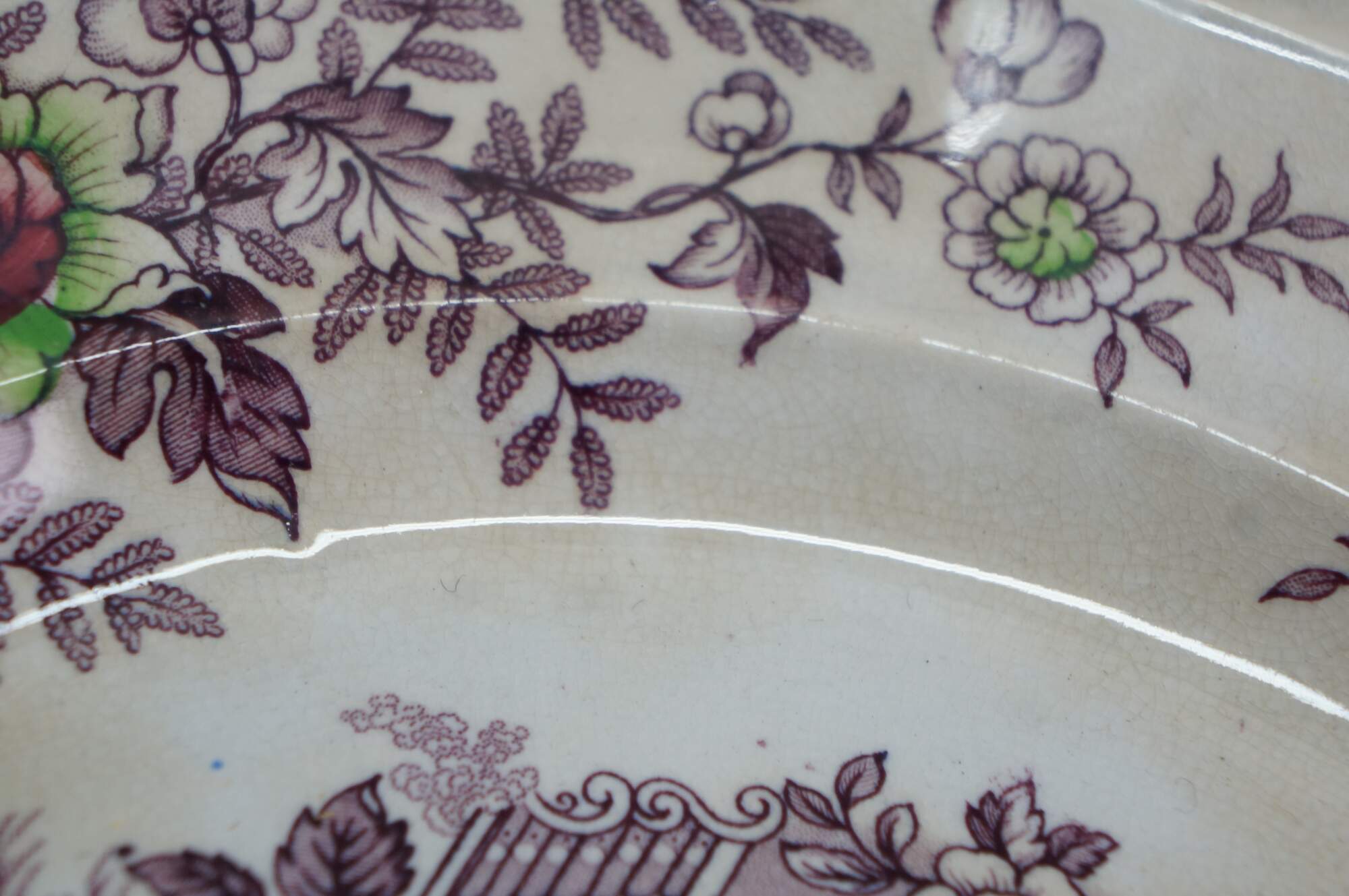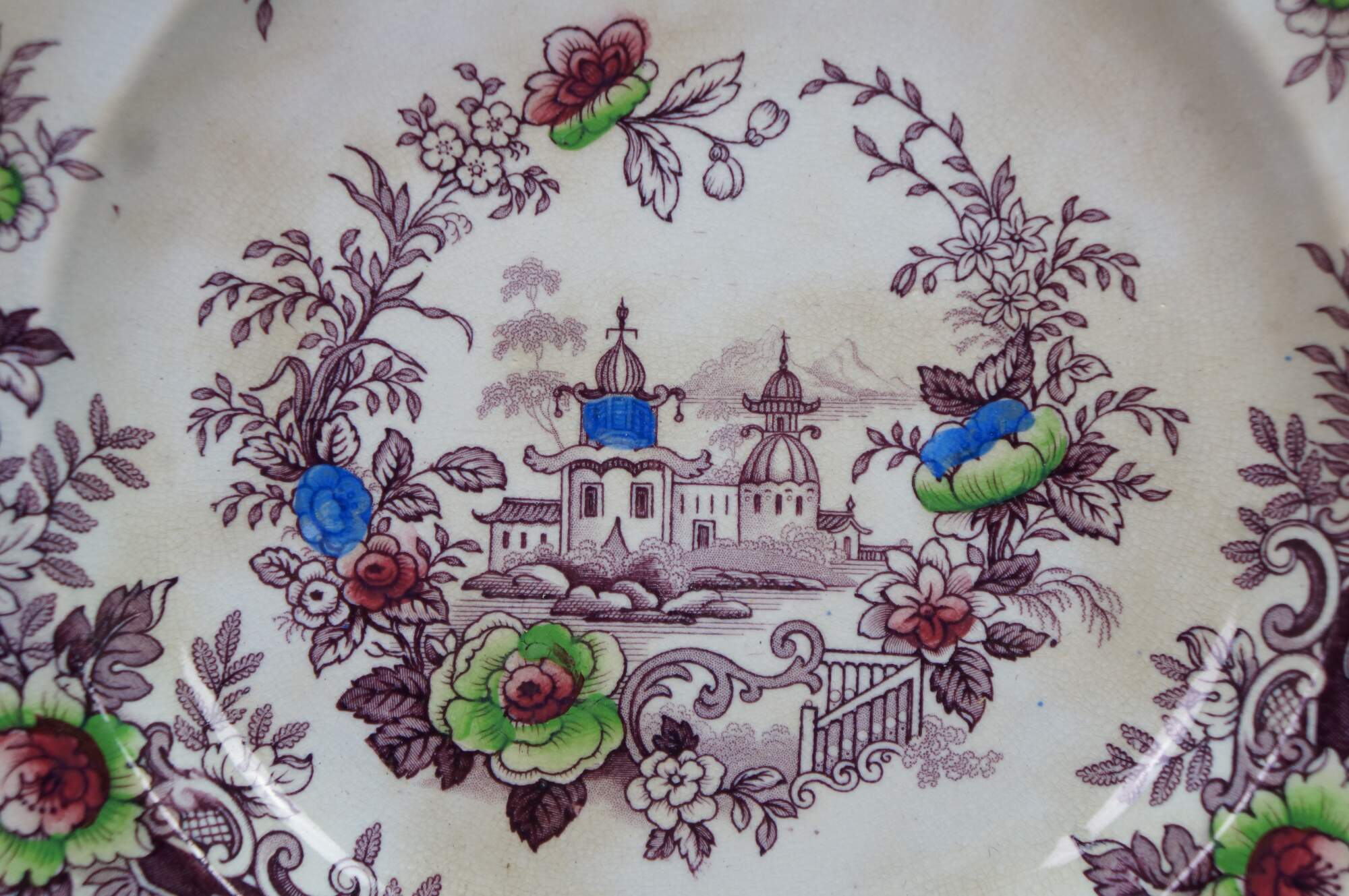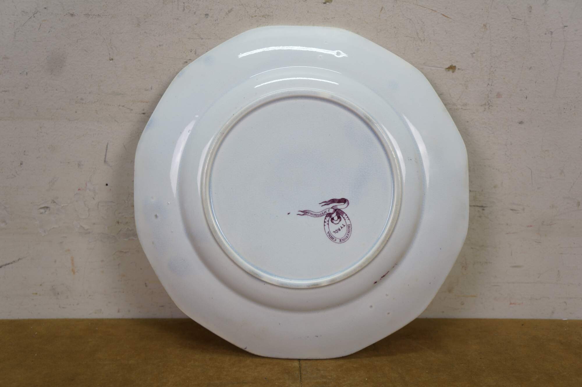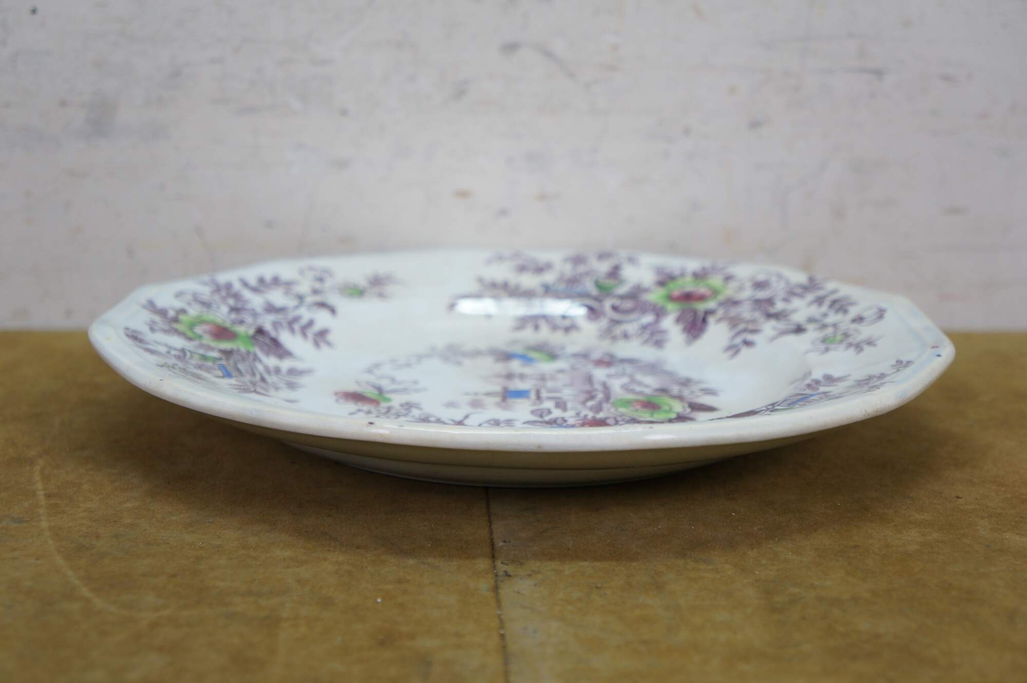 Antique Wedgwood Tyrol Staffordshire Transferware Plate. Features a pastoral scene in purple, green, and blue.