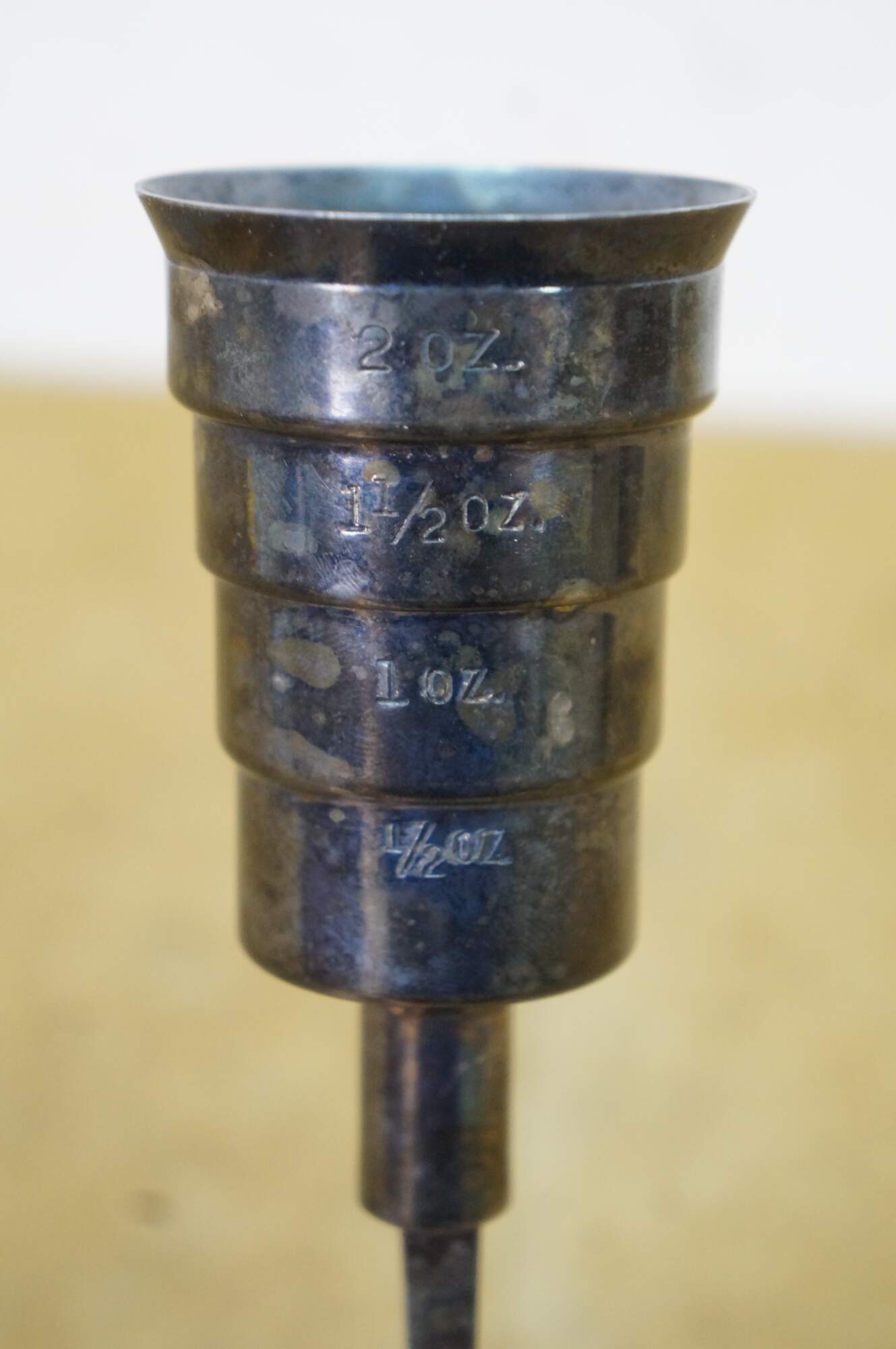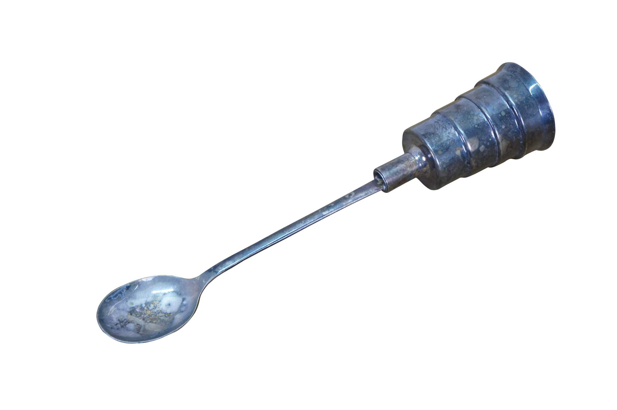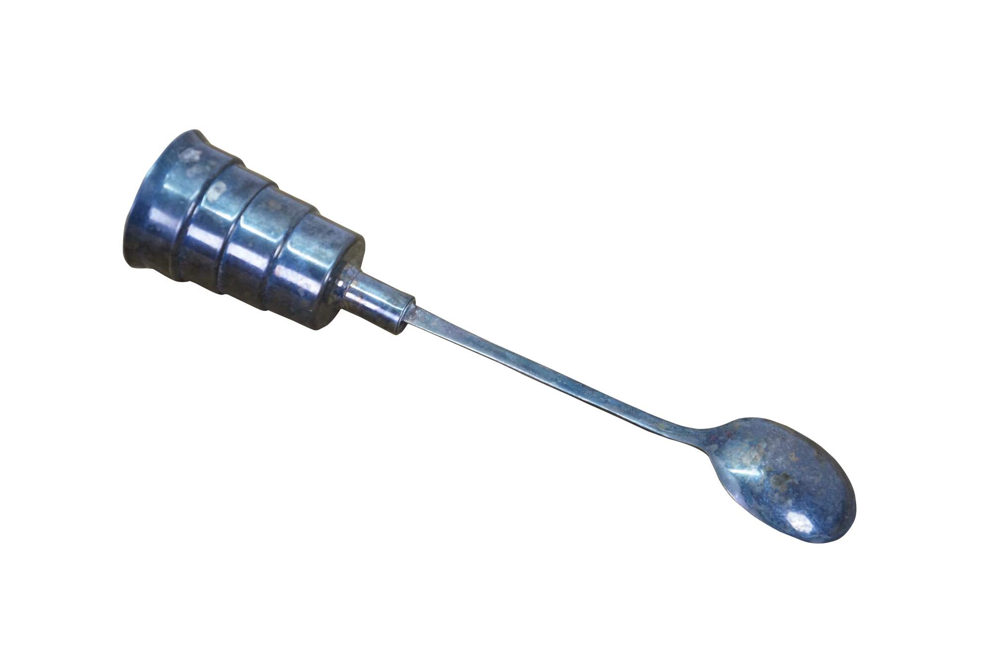 A fine art deco antique silver-plated cocktail spoon & mechanical spirits jigger manufactured in the early 20th century by the Napier Company. Features a stepped design with liquid measuring intervals. When pressing down on the jigger, it allows the liquid to quickly escape down the spoon. A wonderful gift for the mixologist.