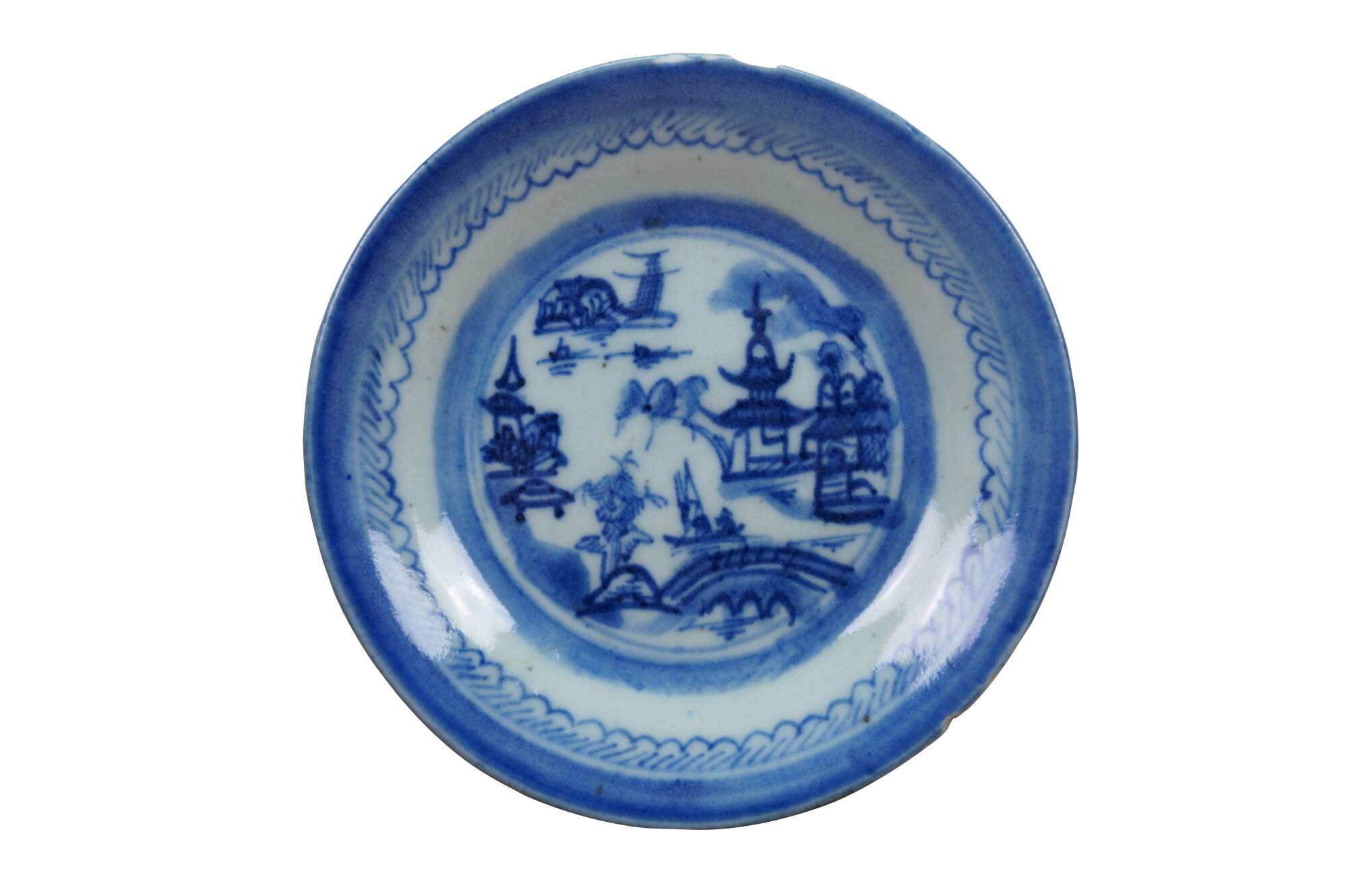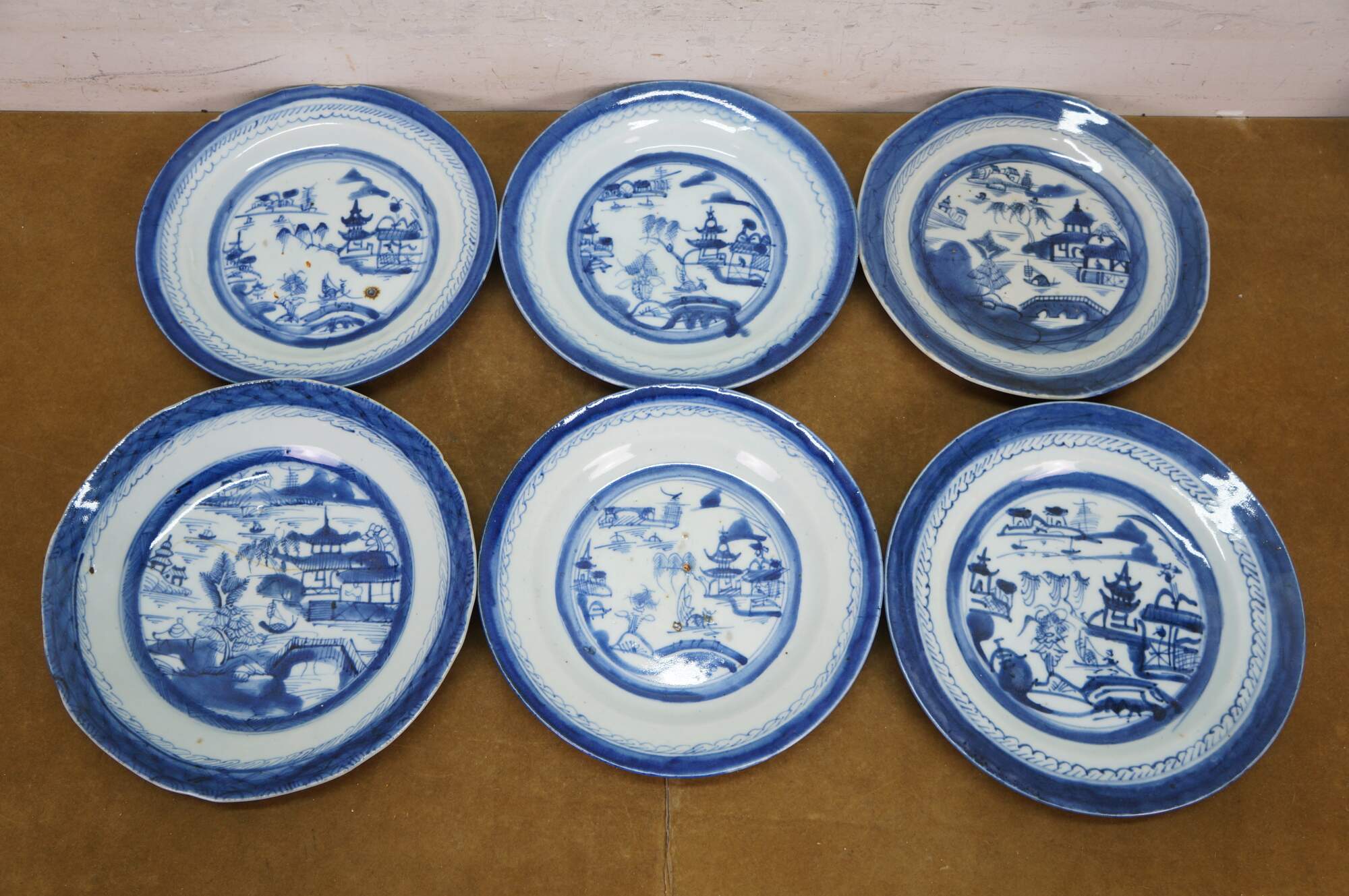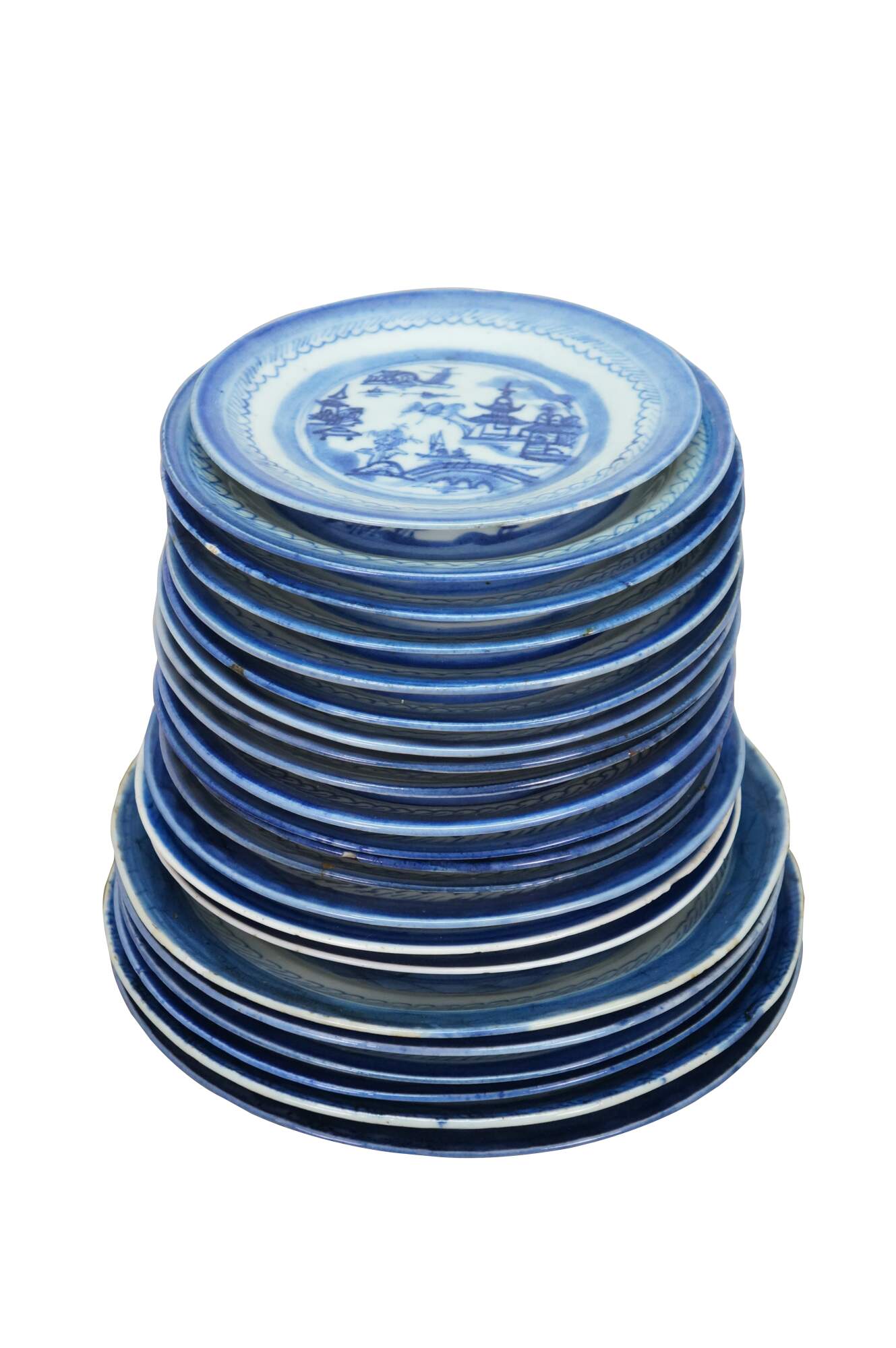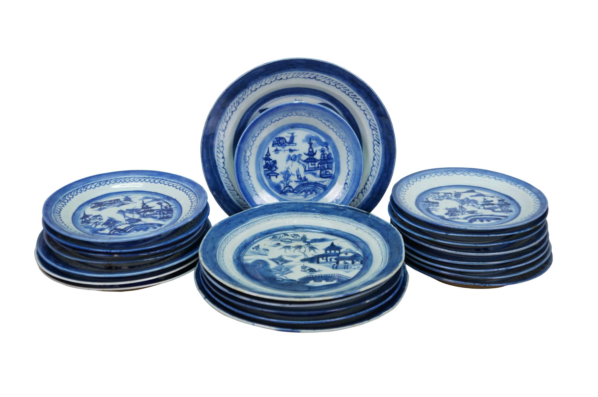 Lot of 22 antique 19th Century chinese export Canton dinnerware.. Made from porcelain with traditional blue and white pagoda landscape design. Includes several dinner and salad plates as well as one bread and butter. Perfect for display or serving.