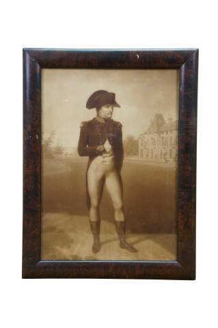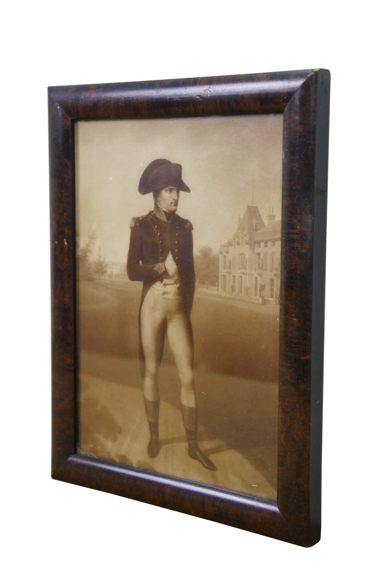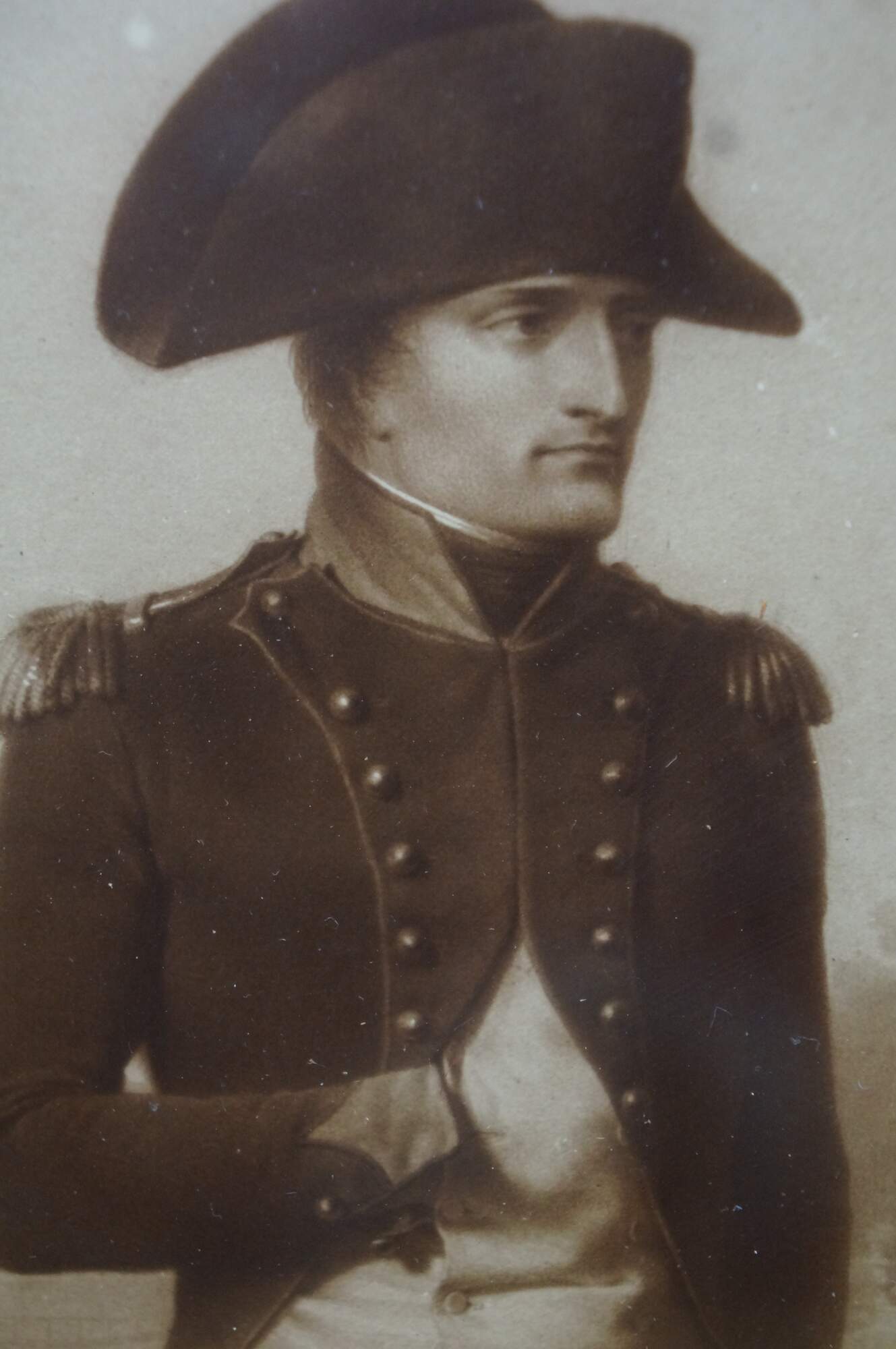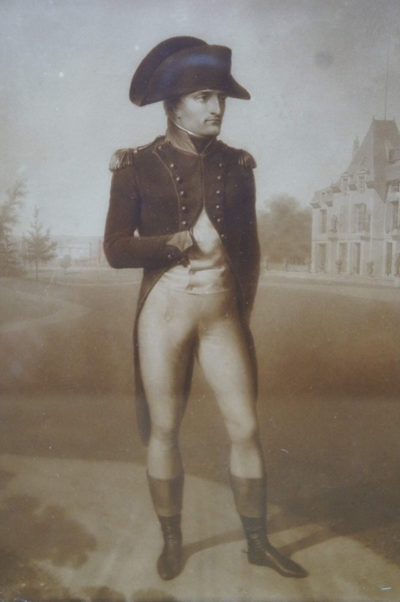 An antique portrait of Napoleon Bonaparte depicted as the First Consul. The original artwork was created by the French painter Jean-Baptiste Isabey. He is standing in front of the Château de Malmaison, which was a private residence for him and Empress Joséphine.around 1801.