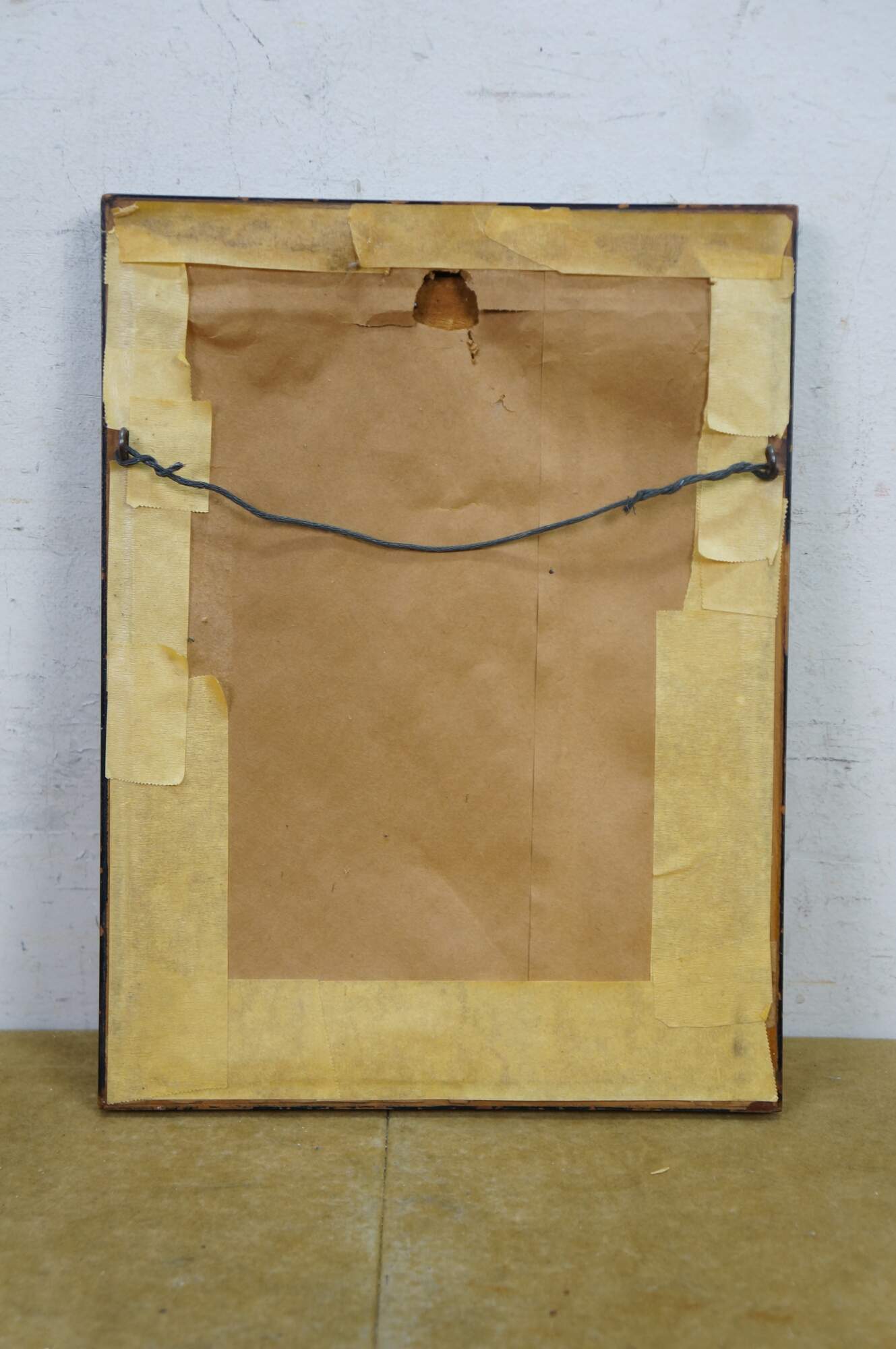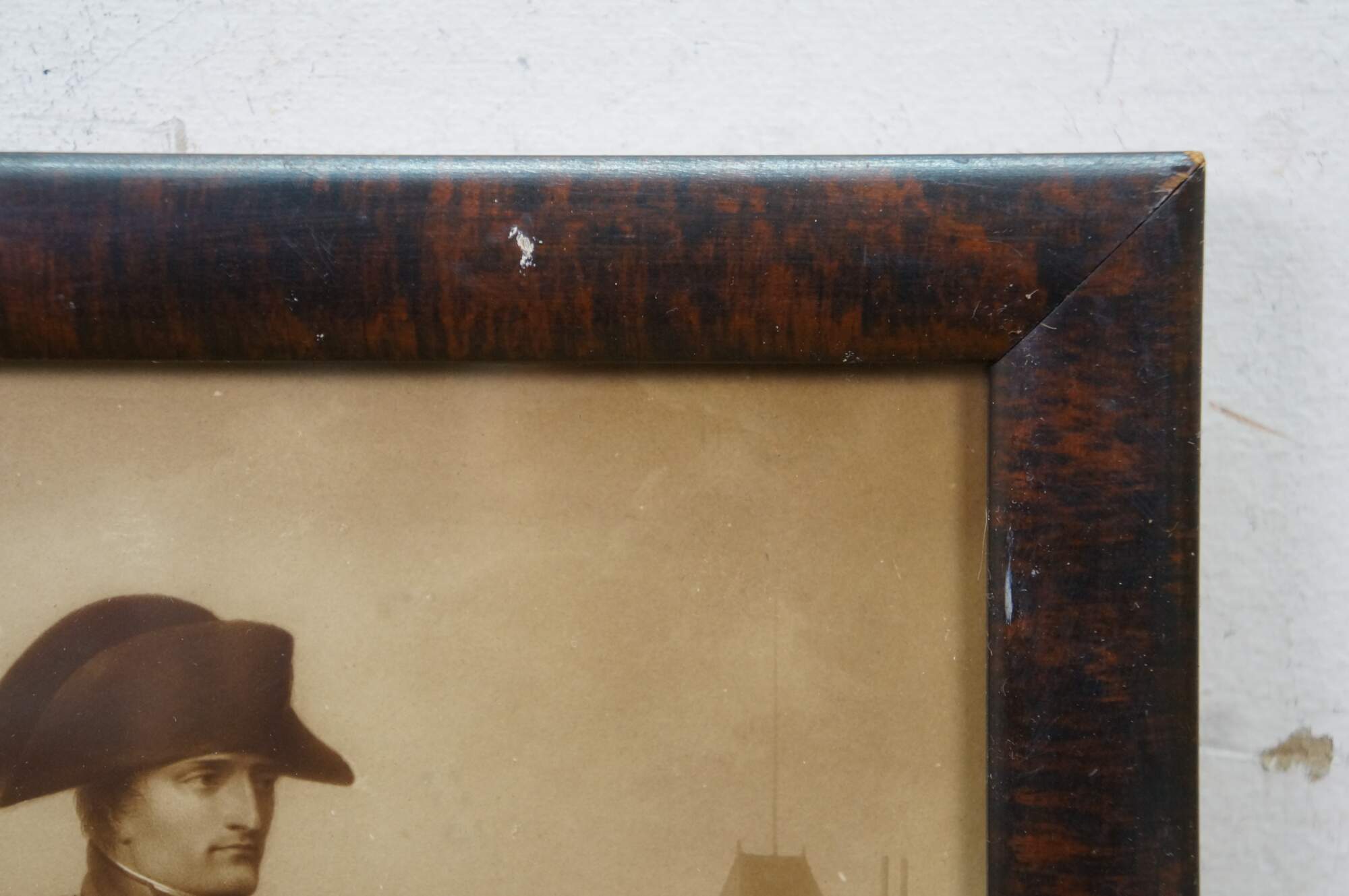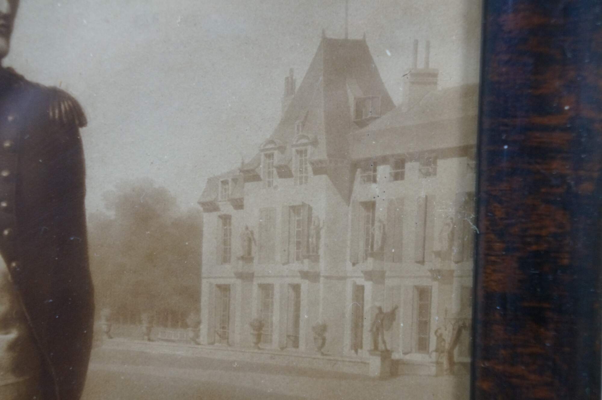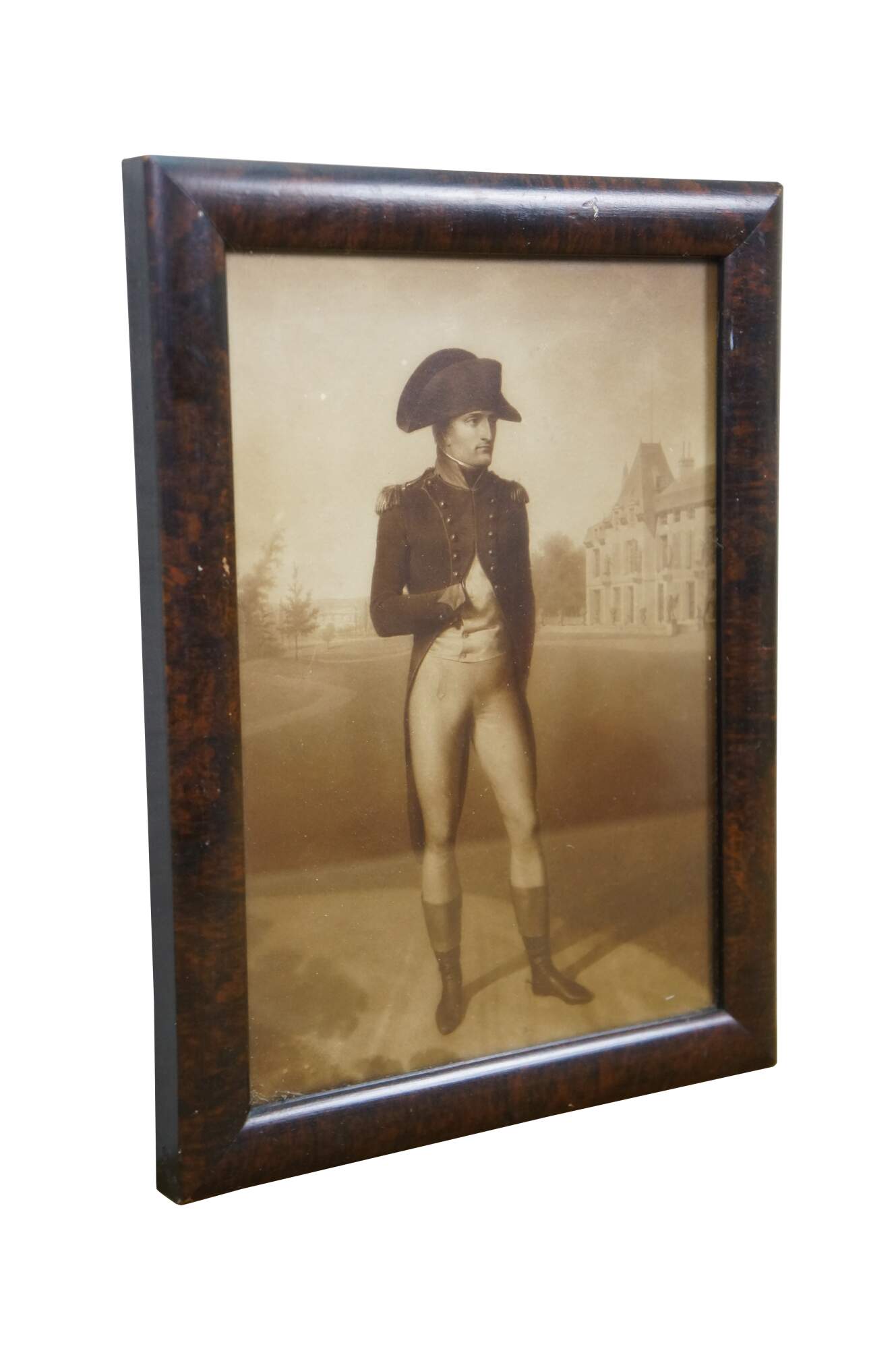 An antique portrait of Napoleon Bonaparte depicted as the First Consul. The original artwork was created by the French painter Jean-Baptiste Isabey. He is standing in front of the Château de Malmaison, which was a private residence for him and Empress Joséphine.around 1801.