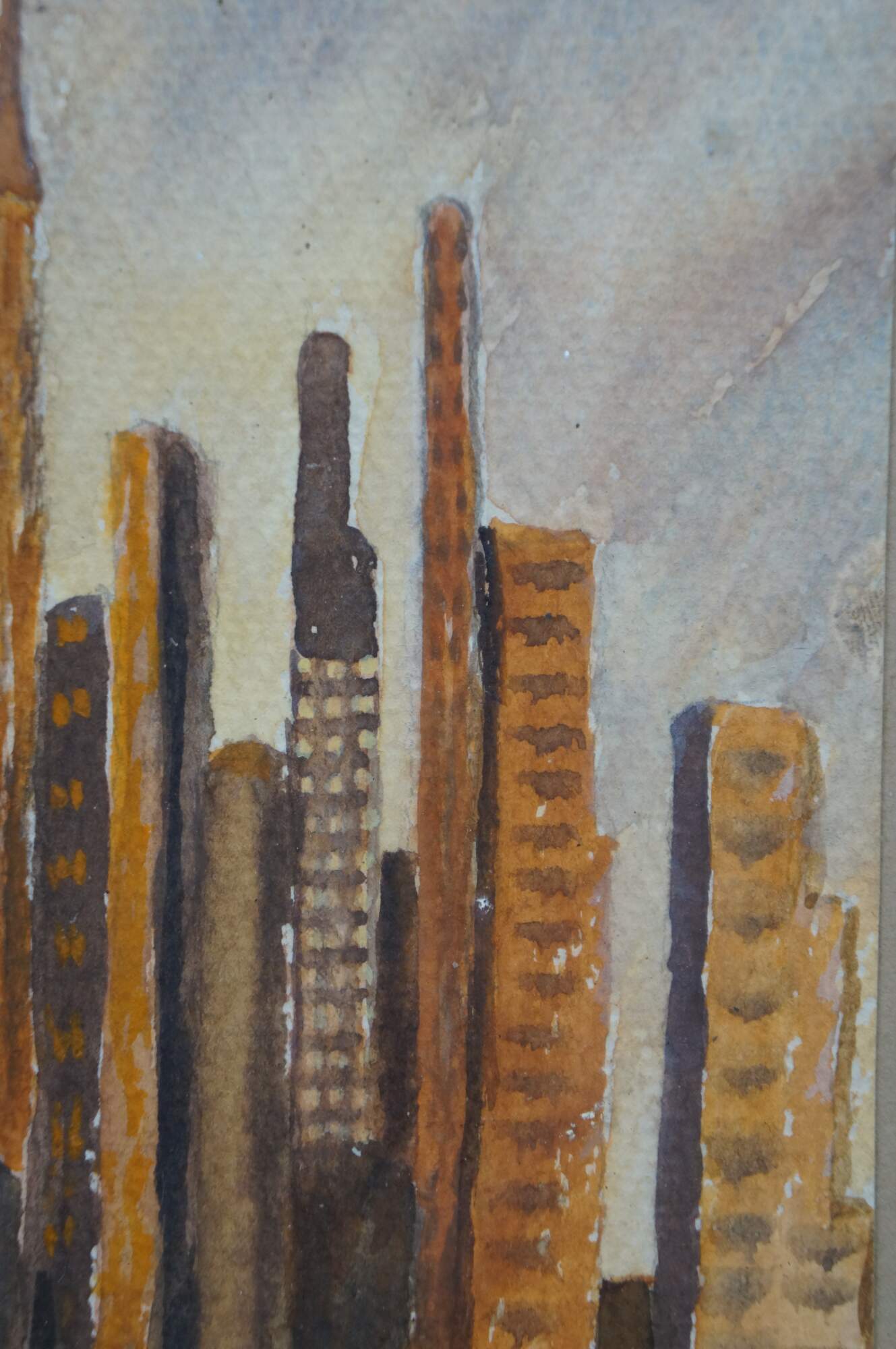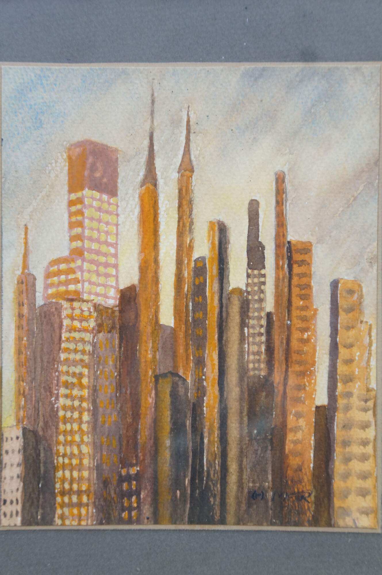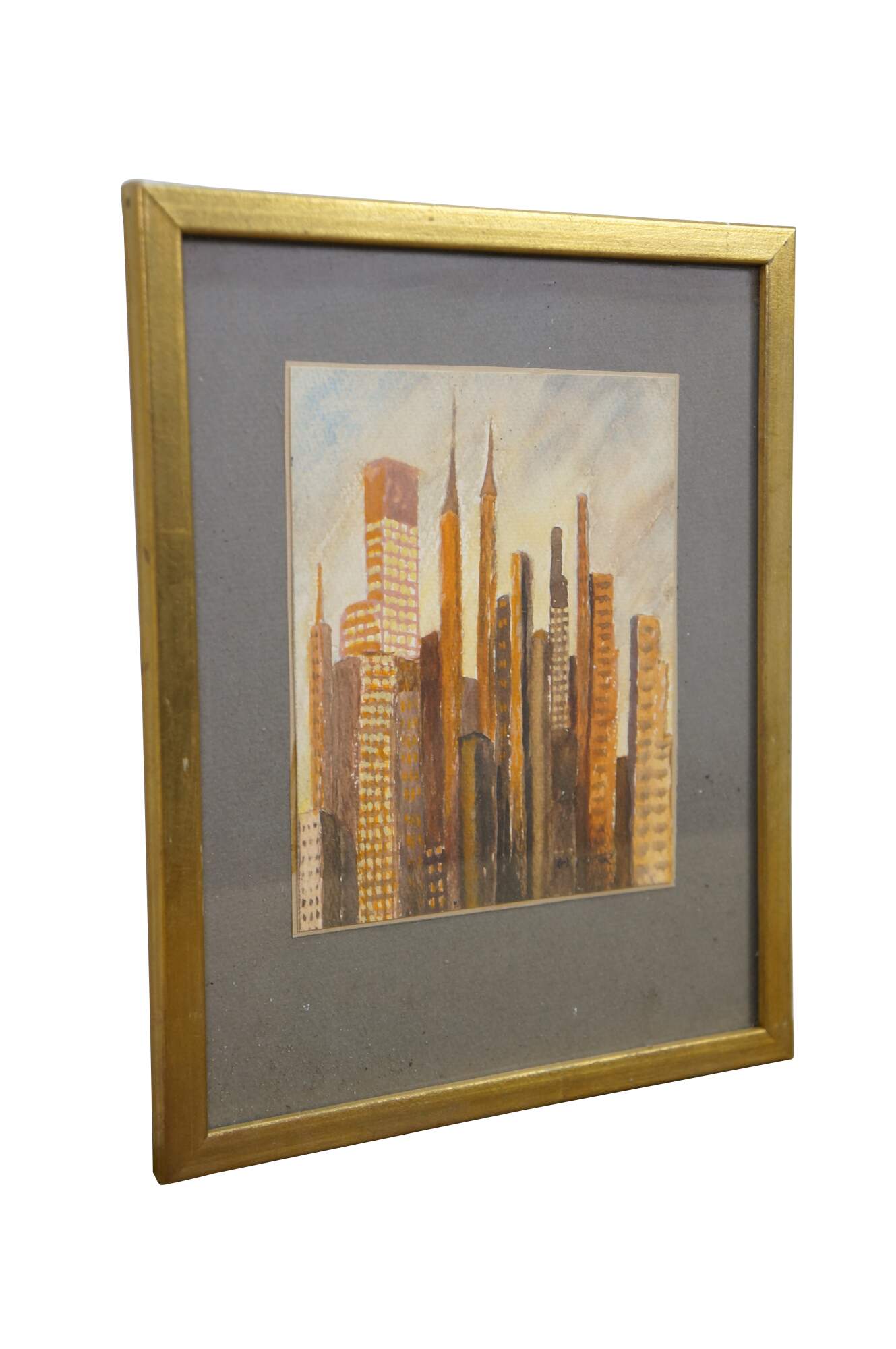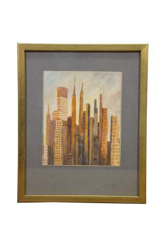 Mid Century Cityscape Watercolor Paintings by Helen J. McRae of New York. Helen had masters in Fine Art. The watercolor depicts the New York City Skyline. Signed Lower right and framed under glass.