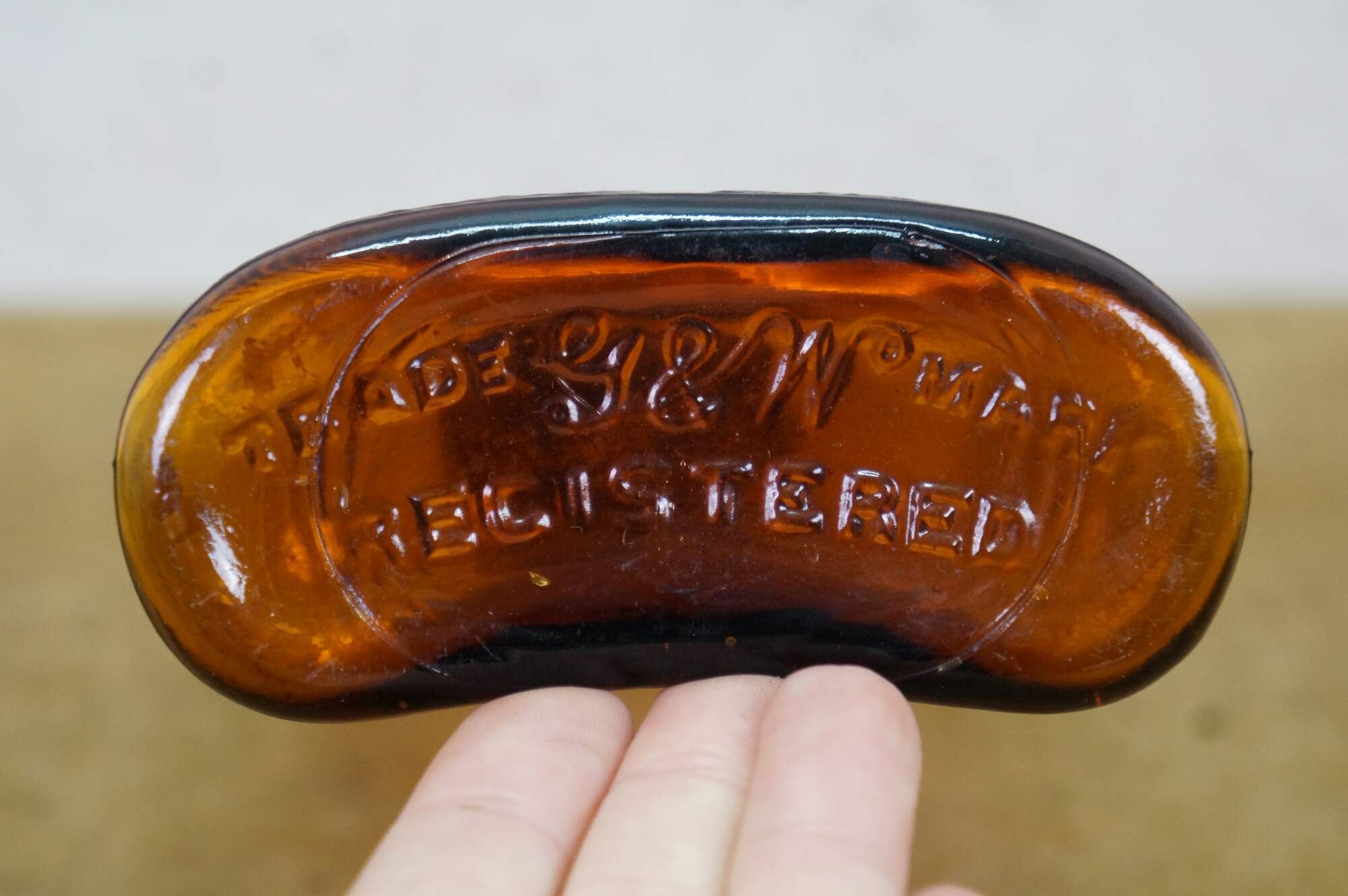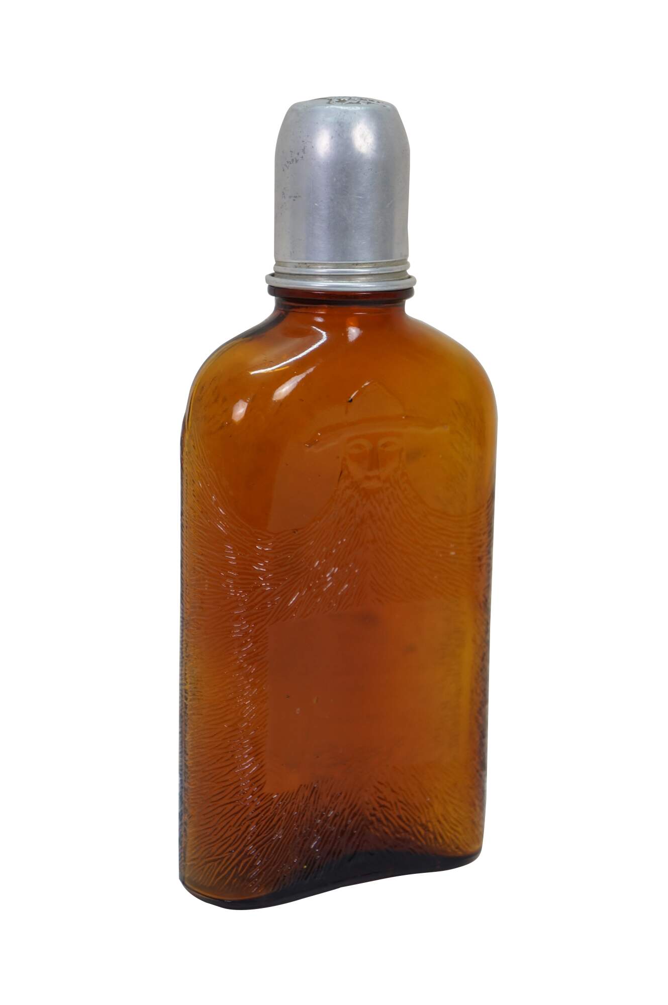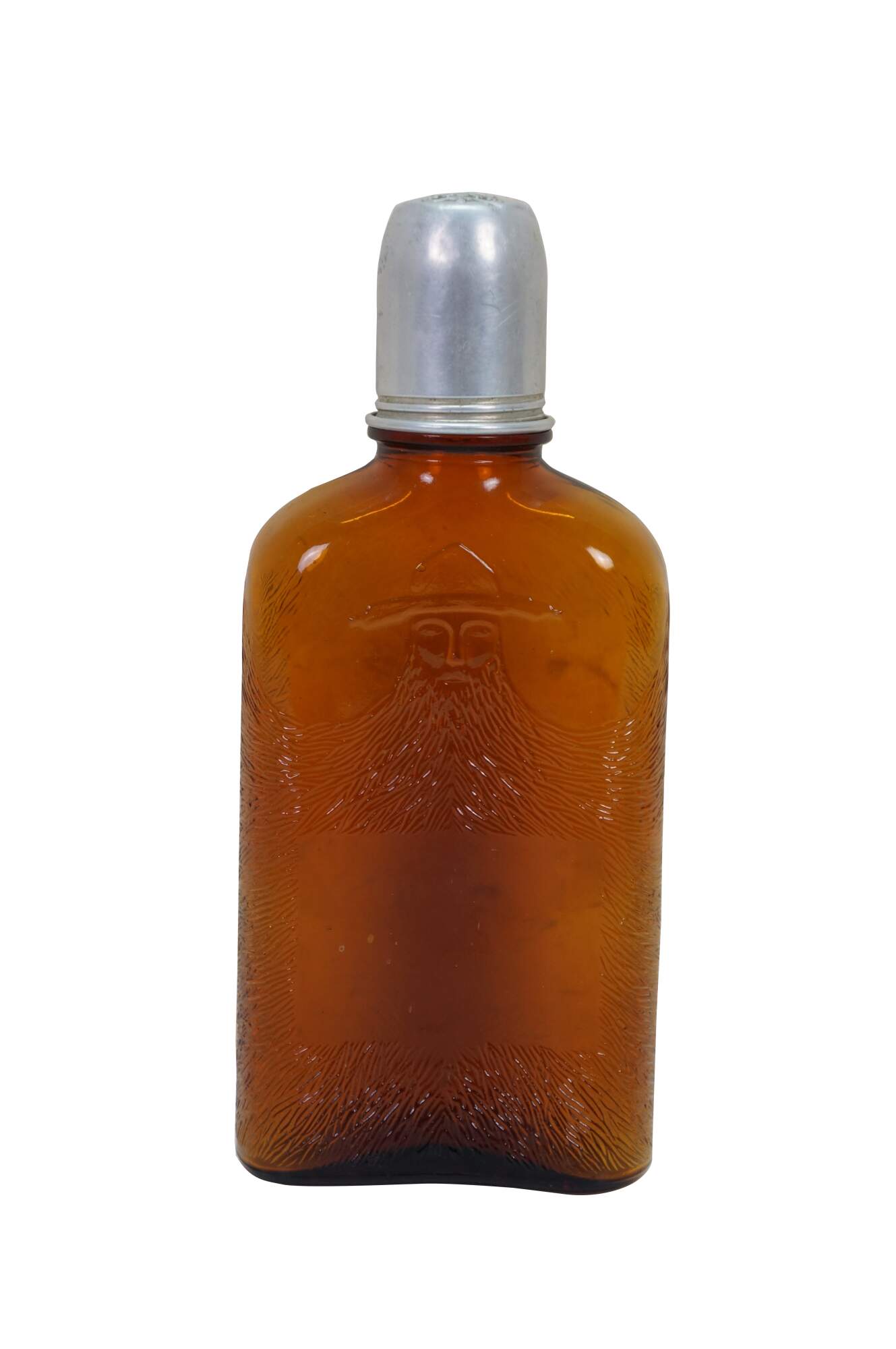 Antique Gooderham & Worts Canadian whiskey amber glass bottle, often referred to as the Bearded Man bottle. It features a distinctive embossed image of a man wearing a hat with a very large, prominent beard.