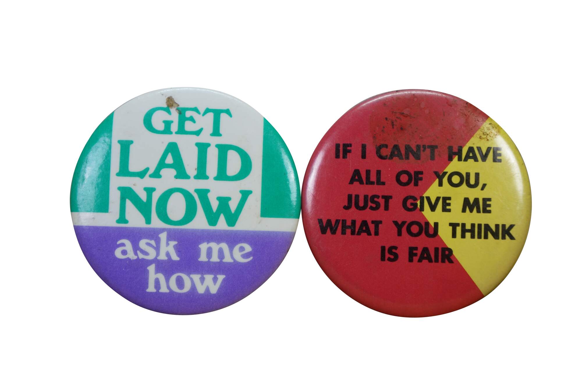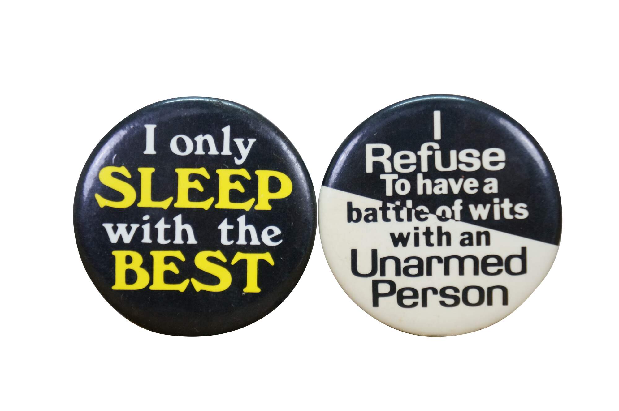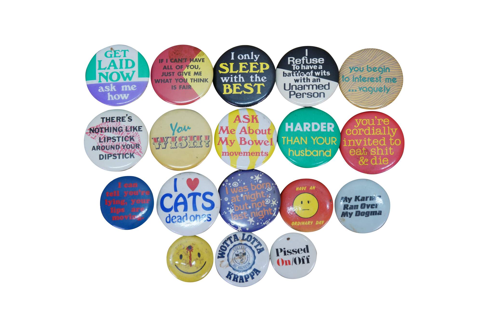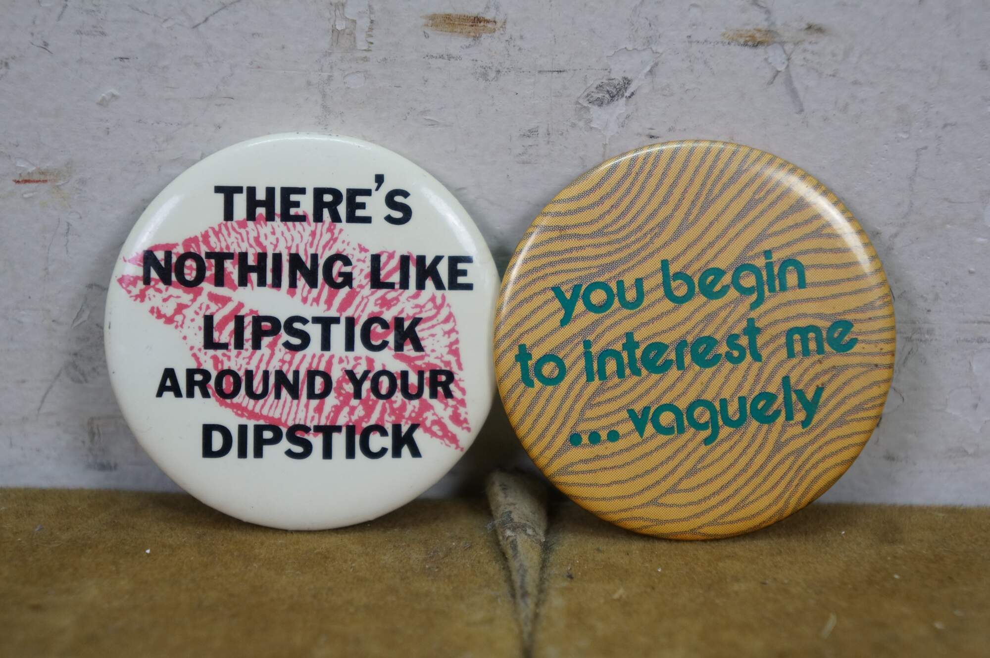 Vintage novelty pinback buttons, often called adult humor buttons or slogan pins, featuring various risqué or funny phrases from the 1970s and 80s.