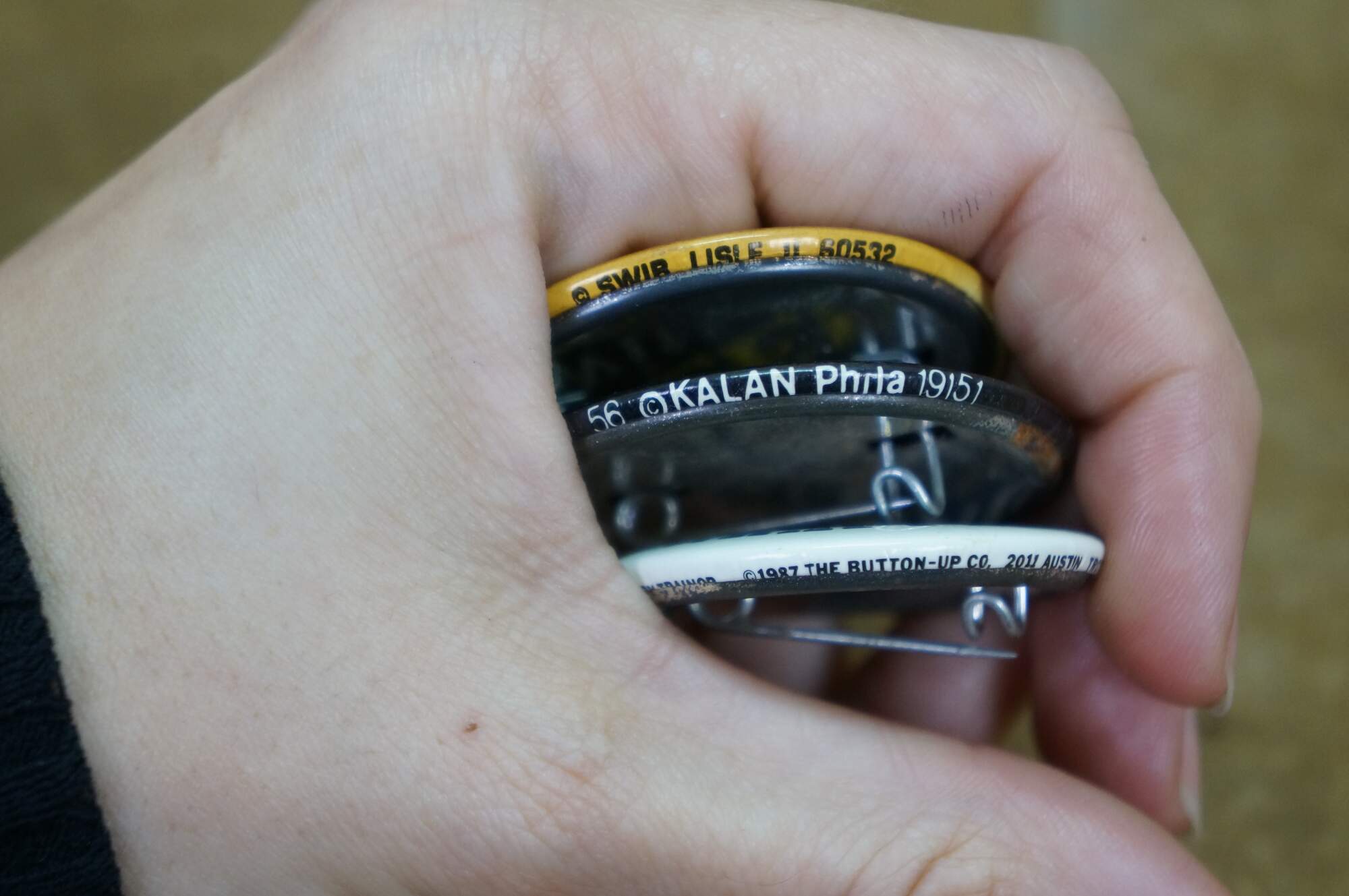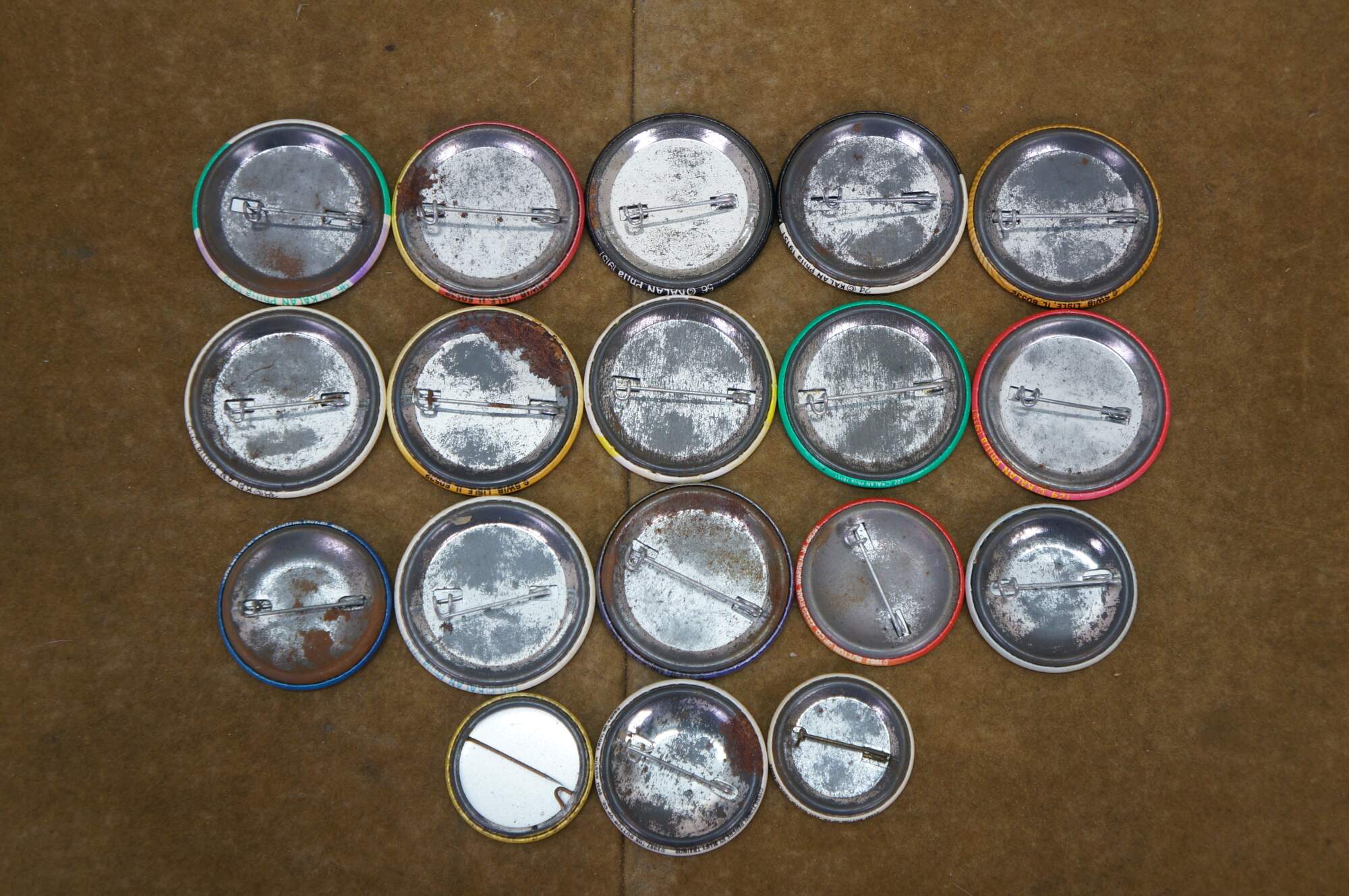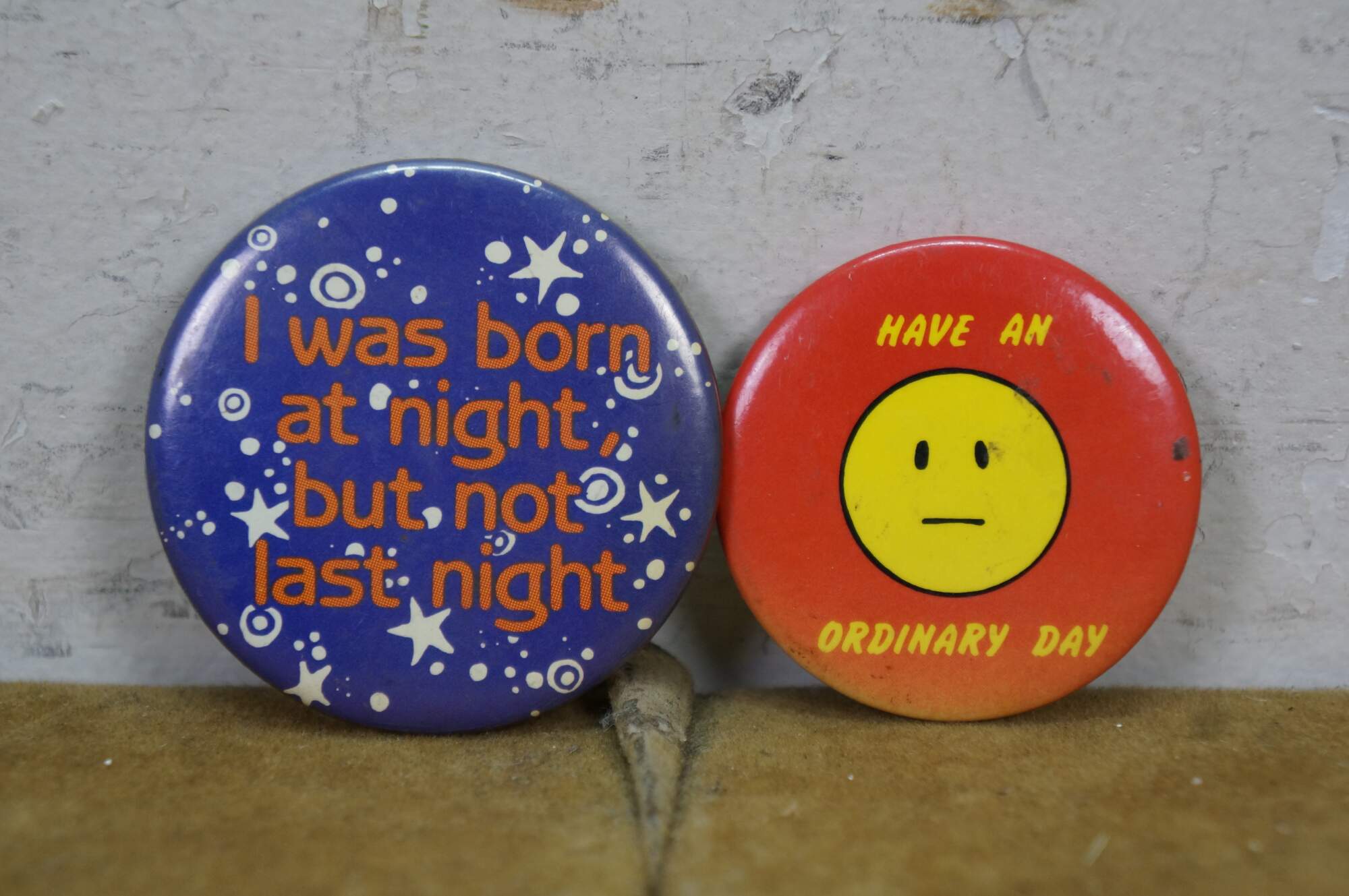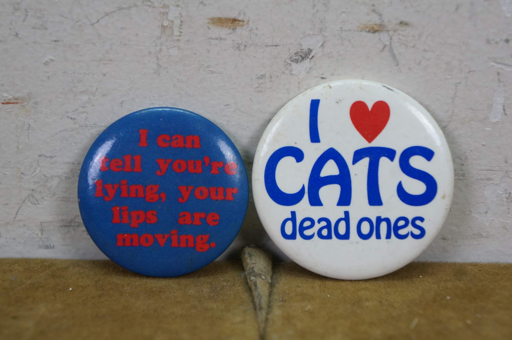 Vintage novelty pinback buttons, often called adult humor buttons or slogan pins, featuring various risqué or funny phrases from the 1970s and 80s.