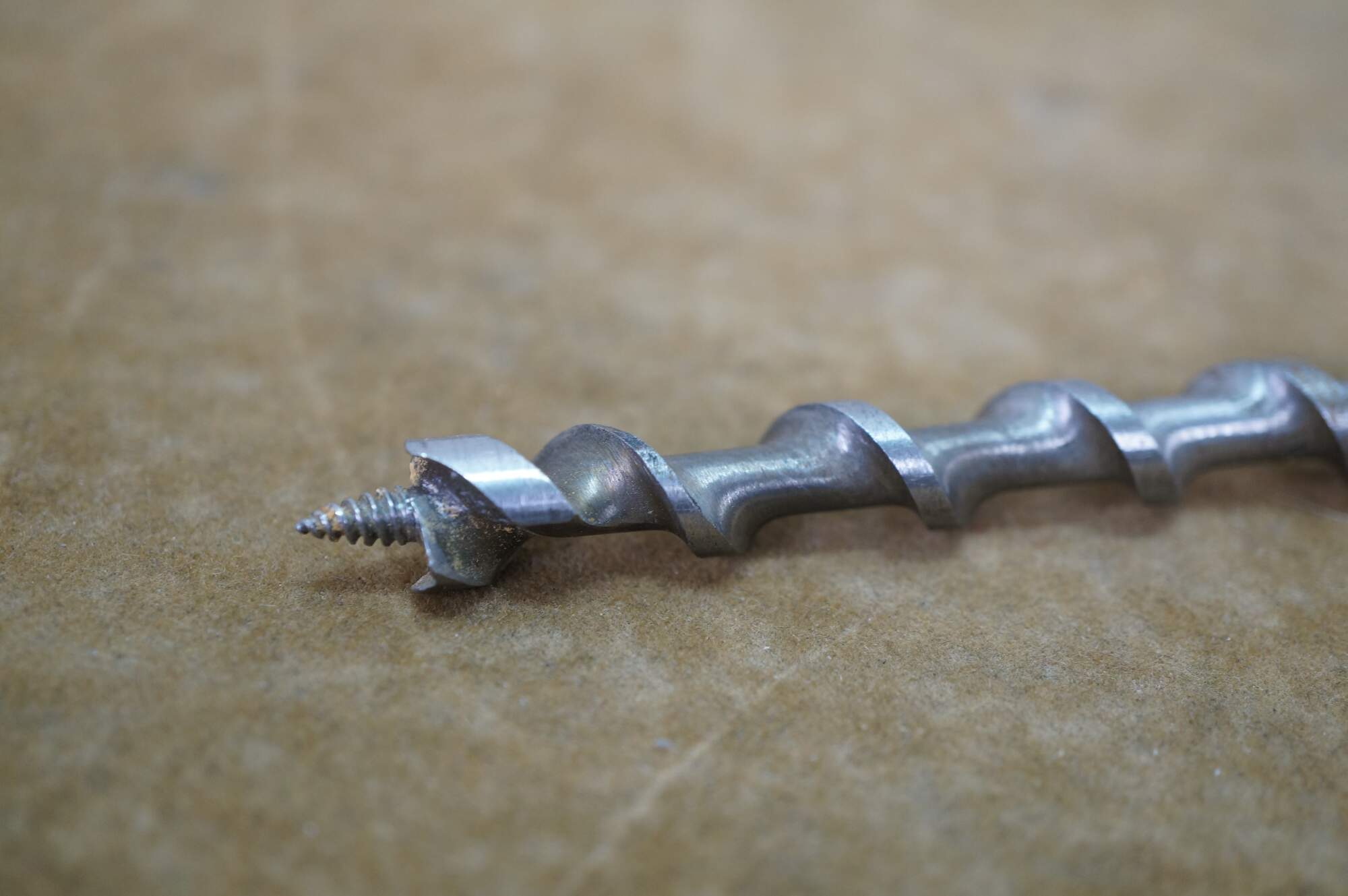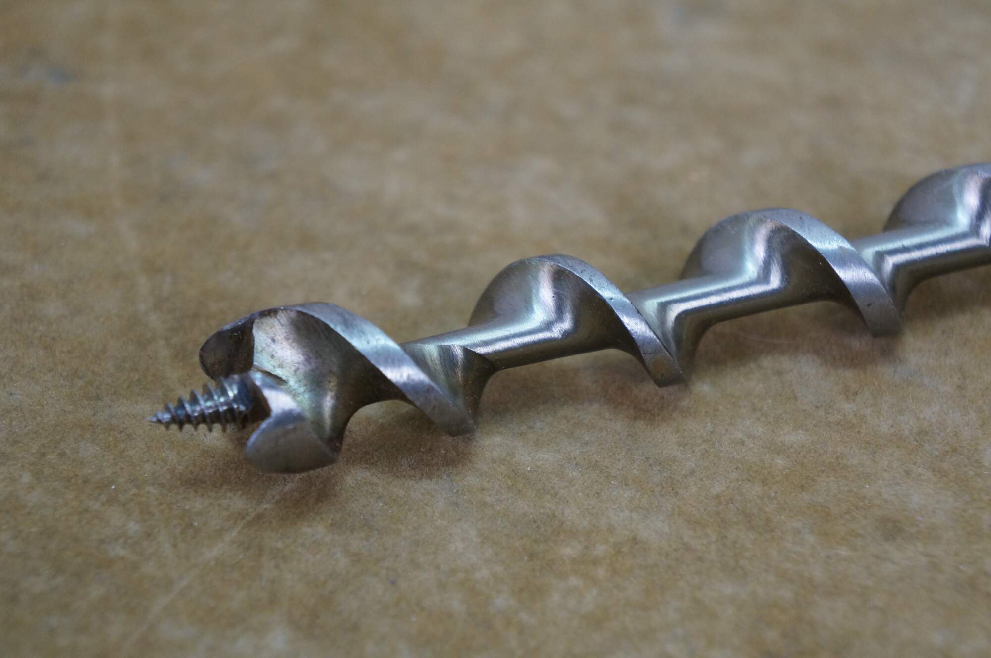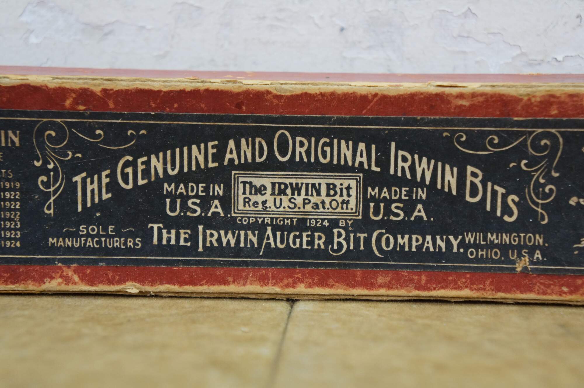 Antique circa 1924 Irwin Number 2 machinist lathe woodworking auger wood drill bit tool with original advertising box. There are a few bits included, they measure 11/16", 3/8", 1".