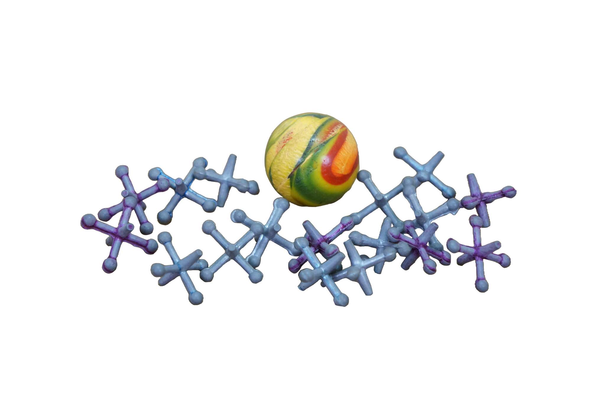 Mid century set of Jacks; includes a small, brightly colored rubber ball and 17 small, six-pointed pieces. This traditional children's game is played by tossing the ball into the air, picking up the jacks, and catching the ball before it bounces more than once. Circa 1950s.