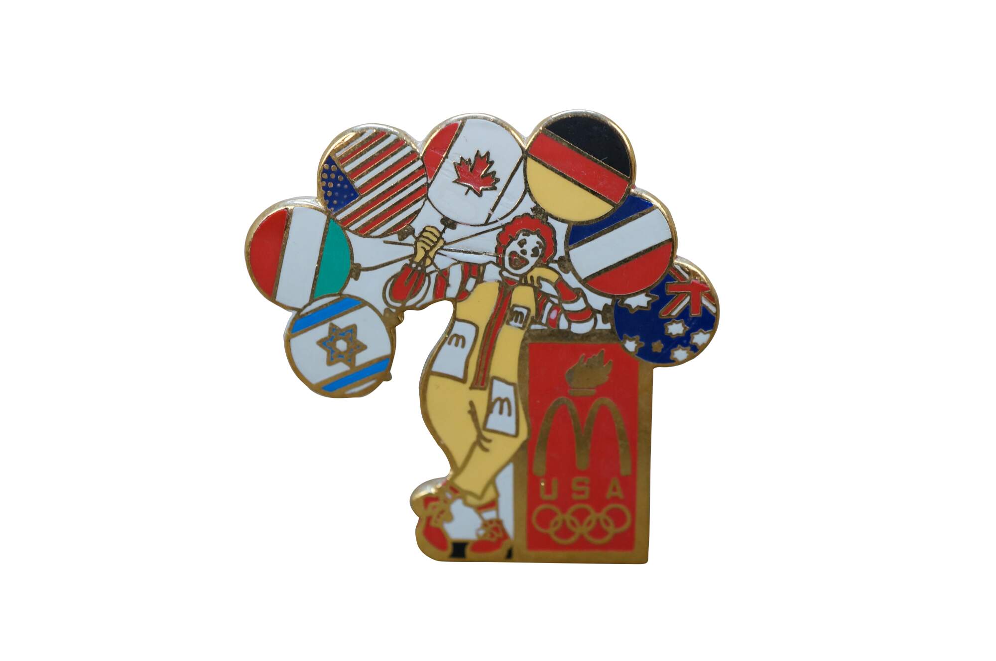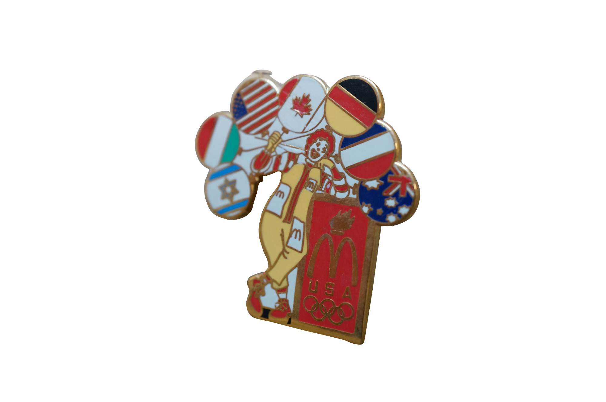Vintage McDonald's Olympics souvenir lapel pin from the 1996 Atlanta games featuring Ronald McDonald holding balloons representing various nations' flags.