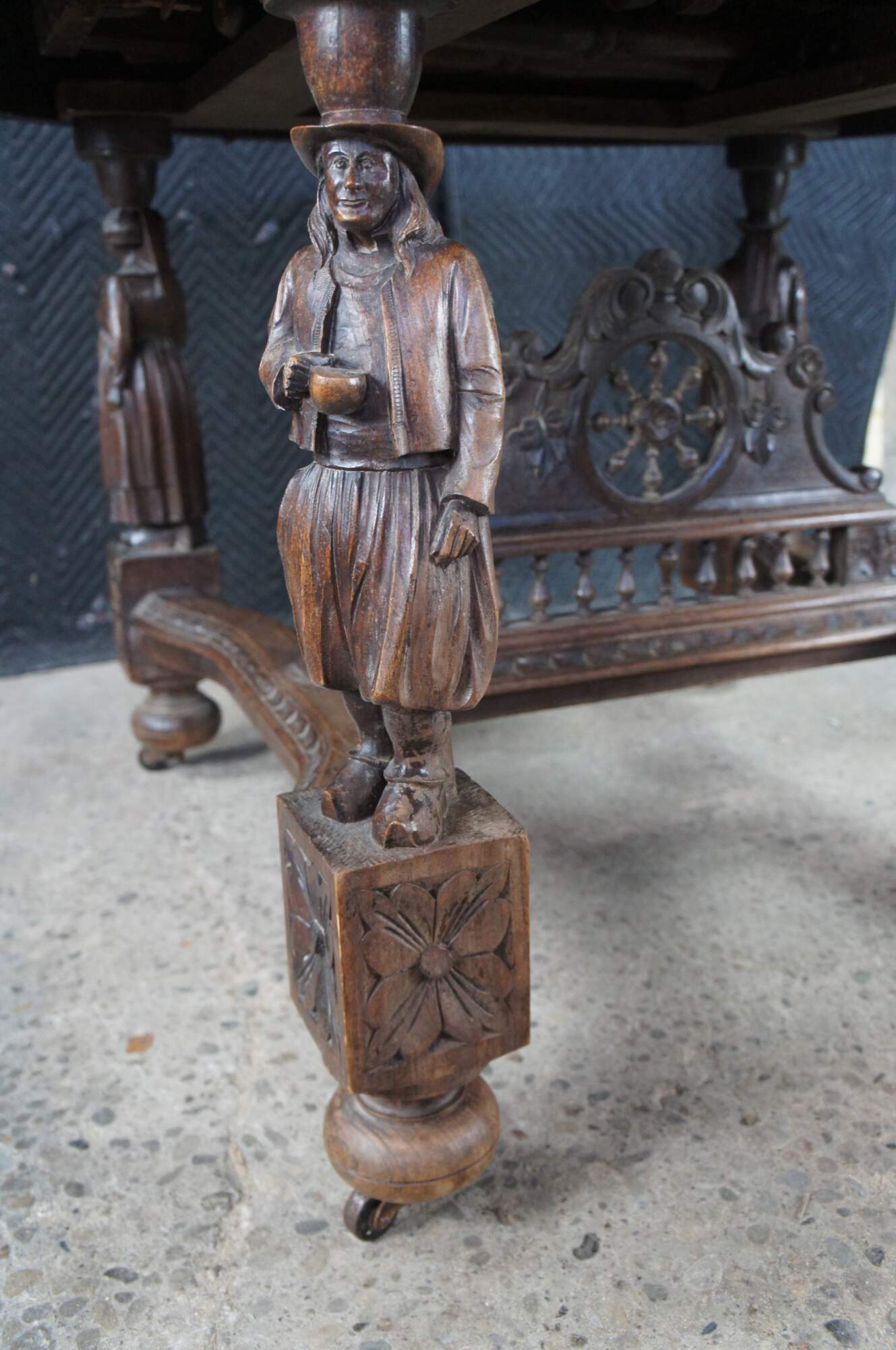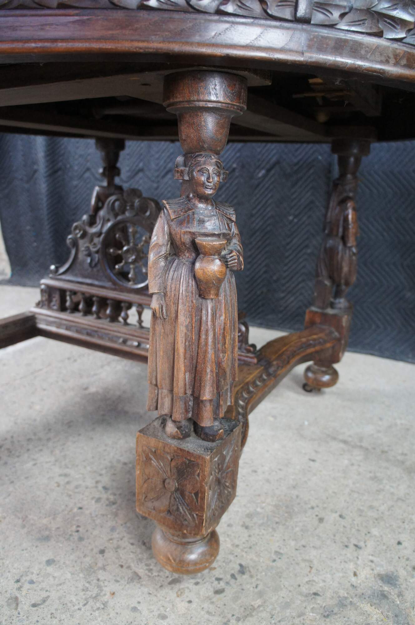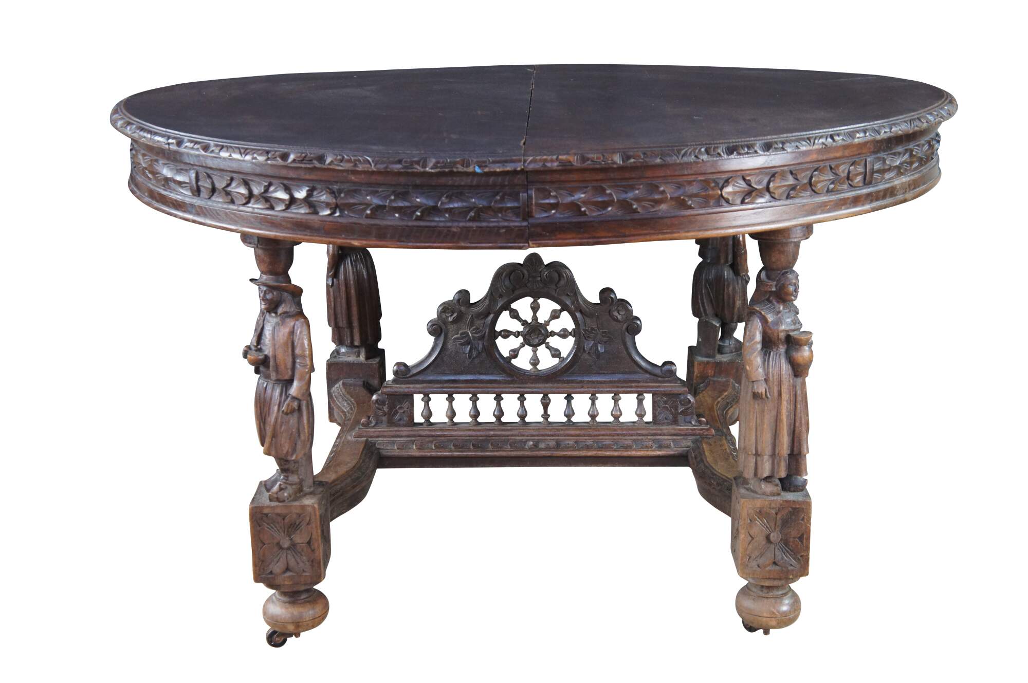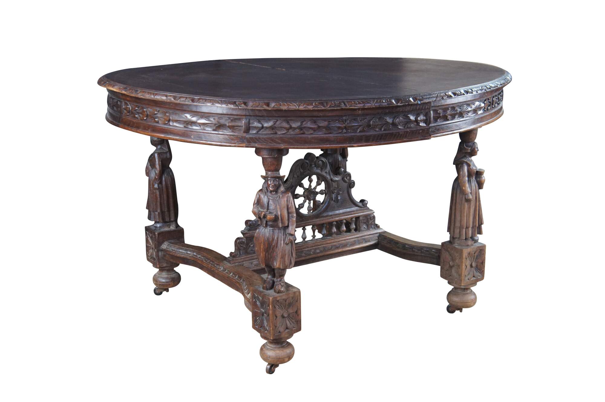 This beautiful table was hand crafted from chestnut featuring figural legs of men and women holding a sythe and sheath of wheat, and drinking. The legs are connected by a pierced nautical wheel with floret medallions and scrolled acathus leaves supported by a bauluster rail. Jake add more here.
