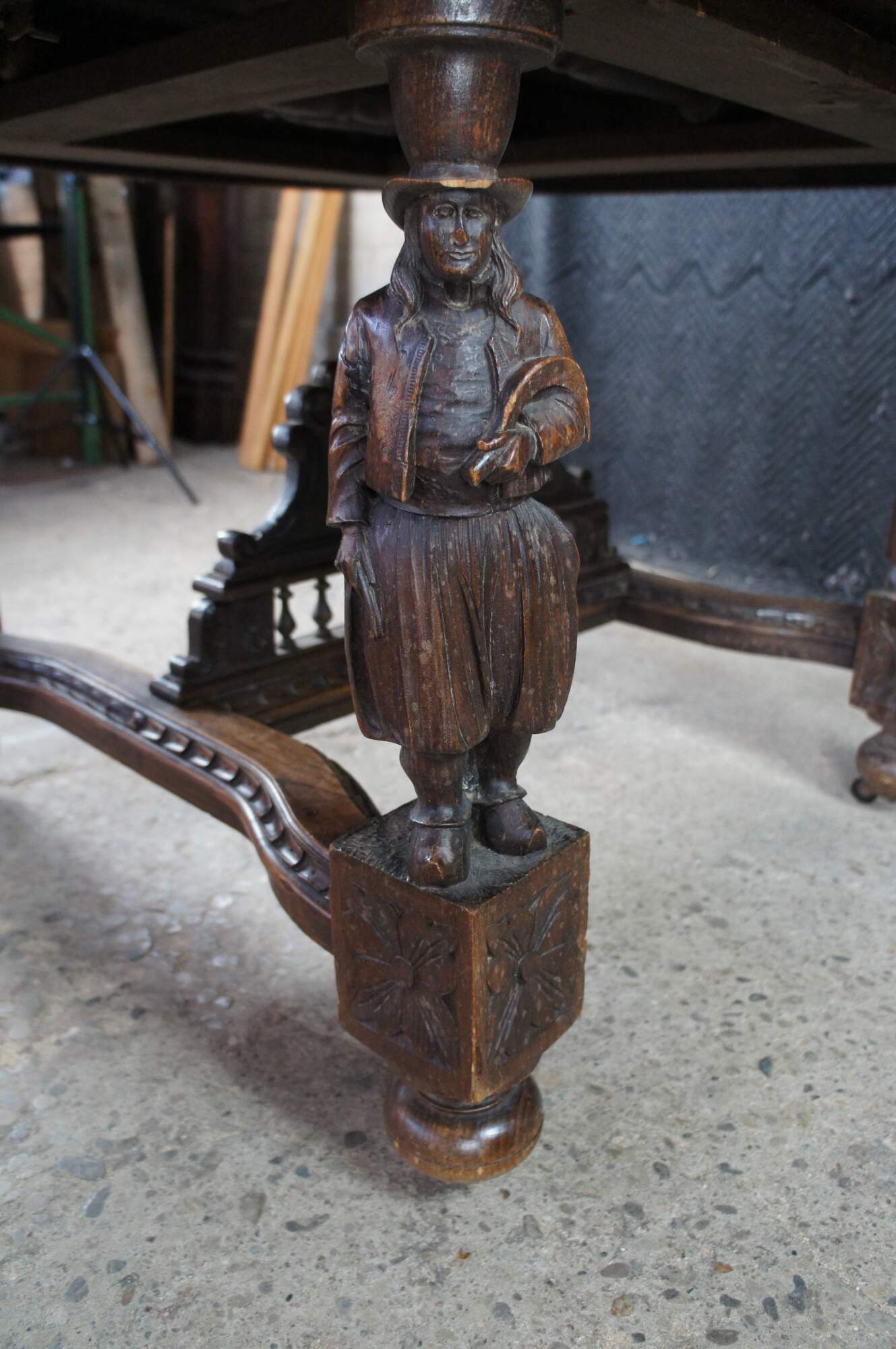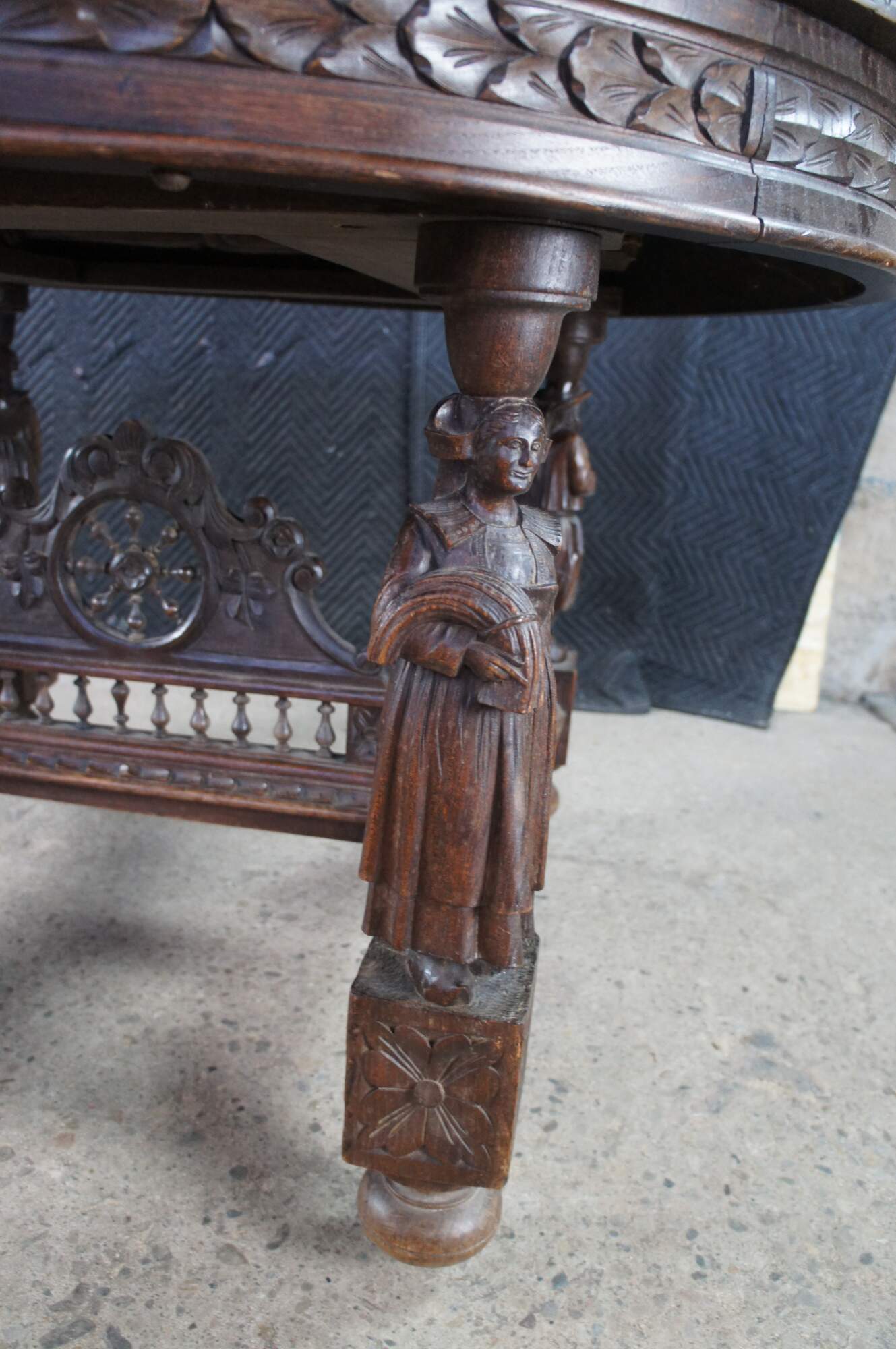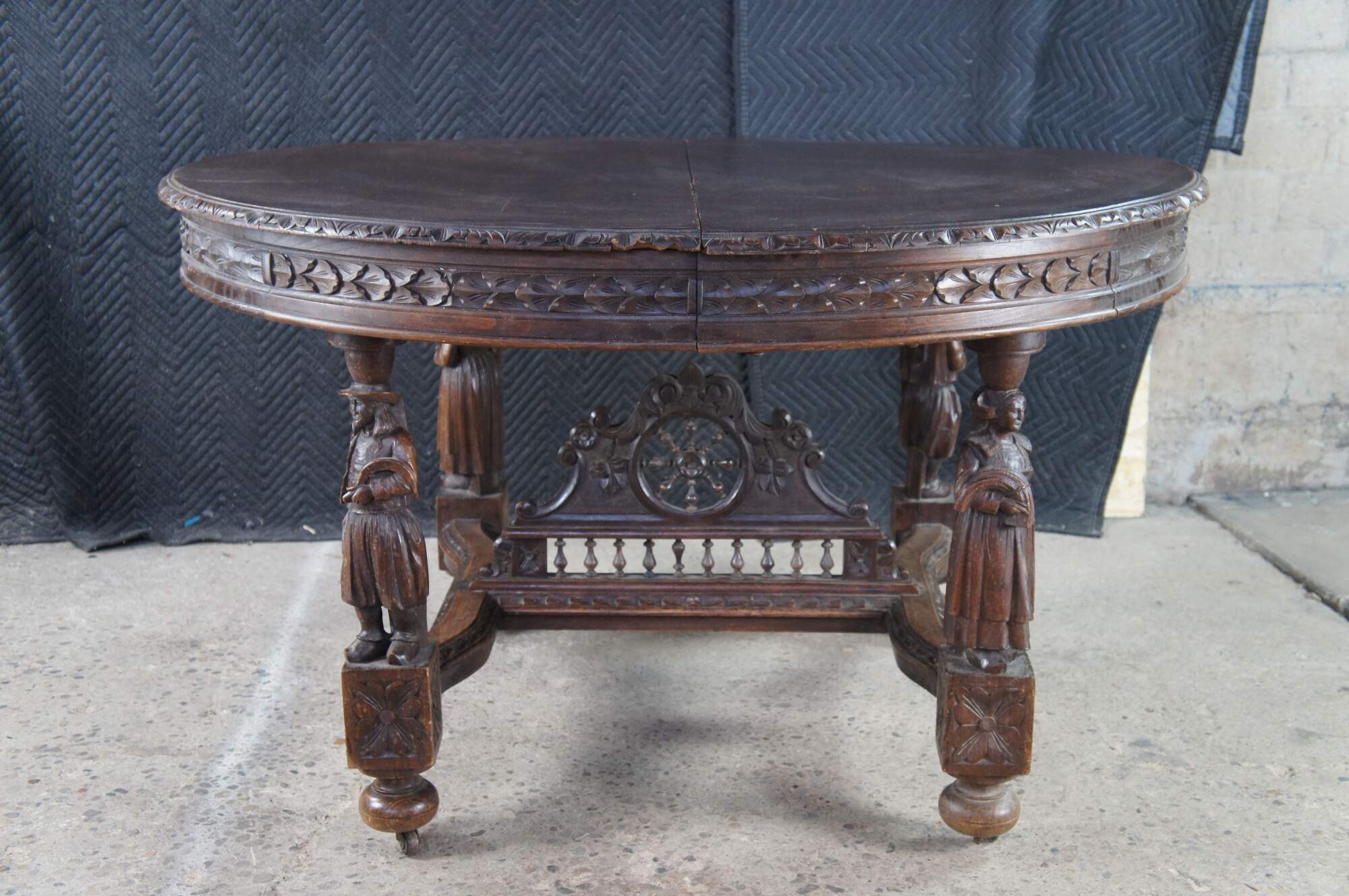This beautiful table was hand crafted from chestnut featuring figural legs of men and women holding a sythe and sheath of wheat, and drinking. The legs are connected by a pierced nautical wheel with floret medallions and scrolled acathus leaves supported by a bauluster rail. Jake add more here.