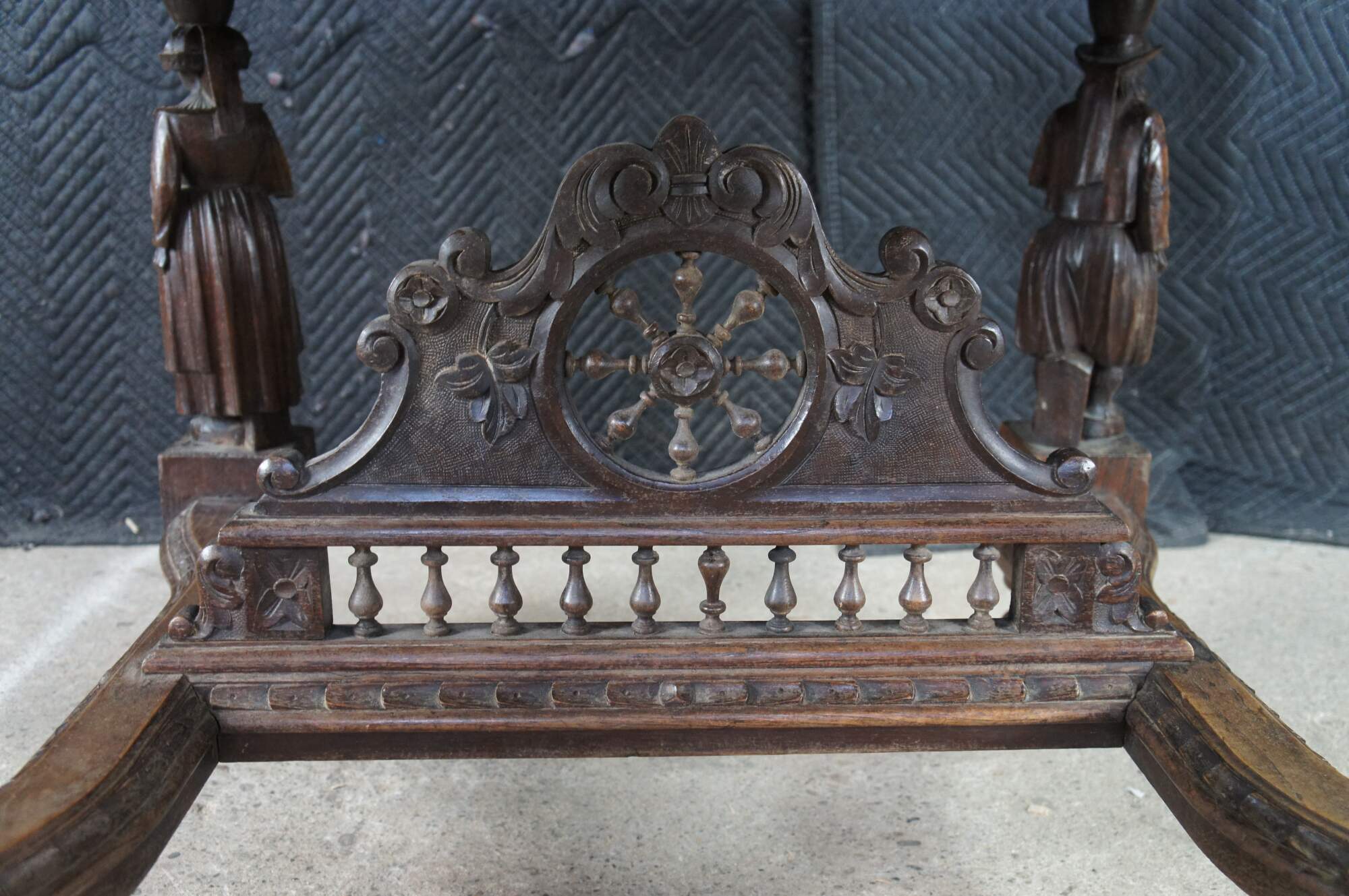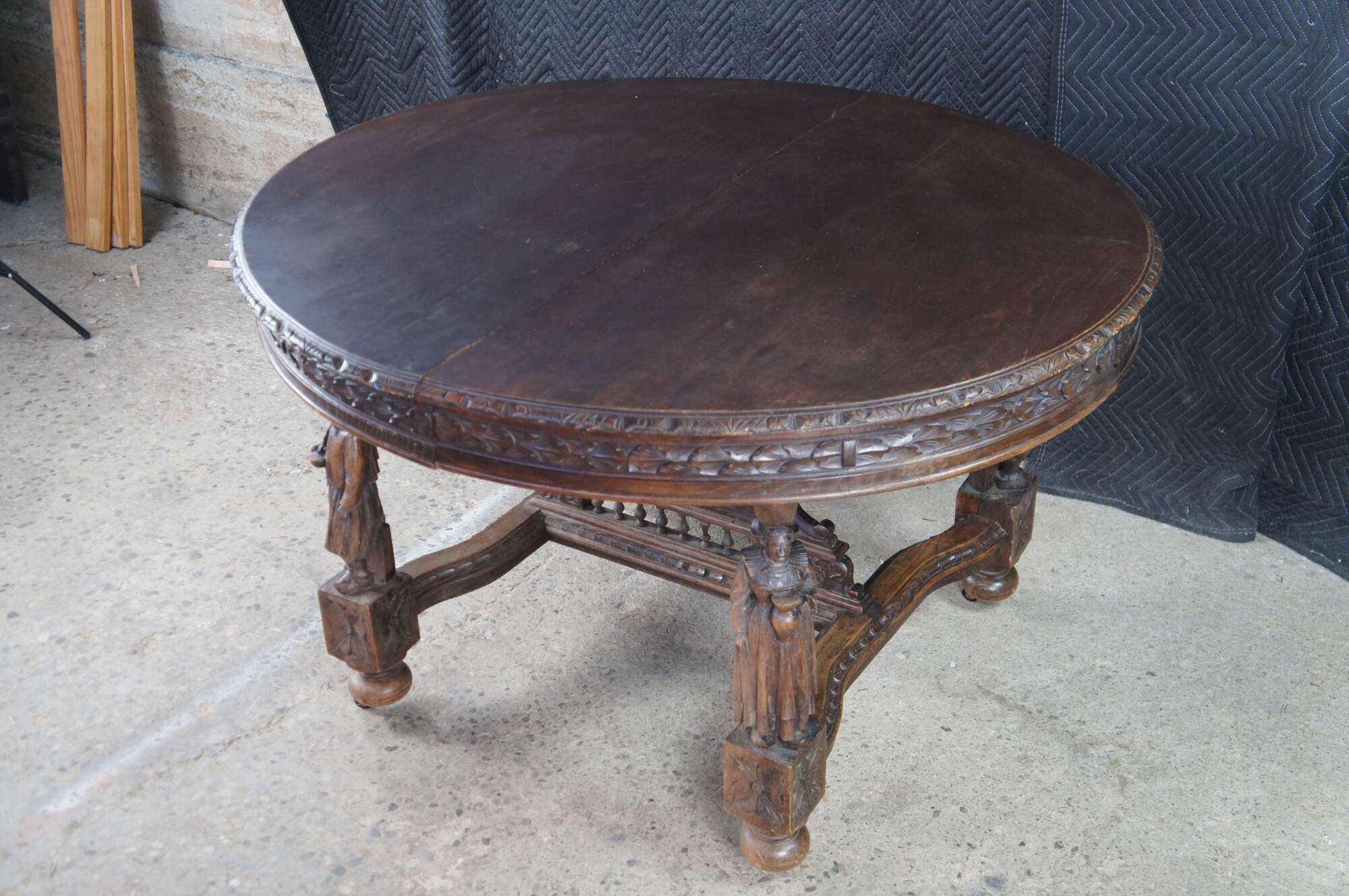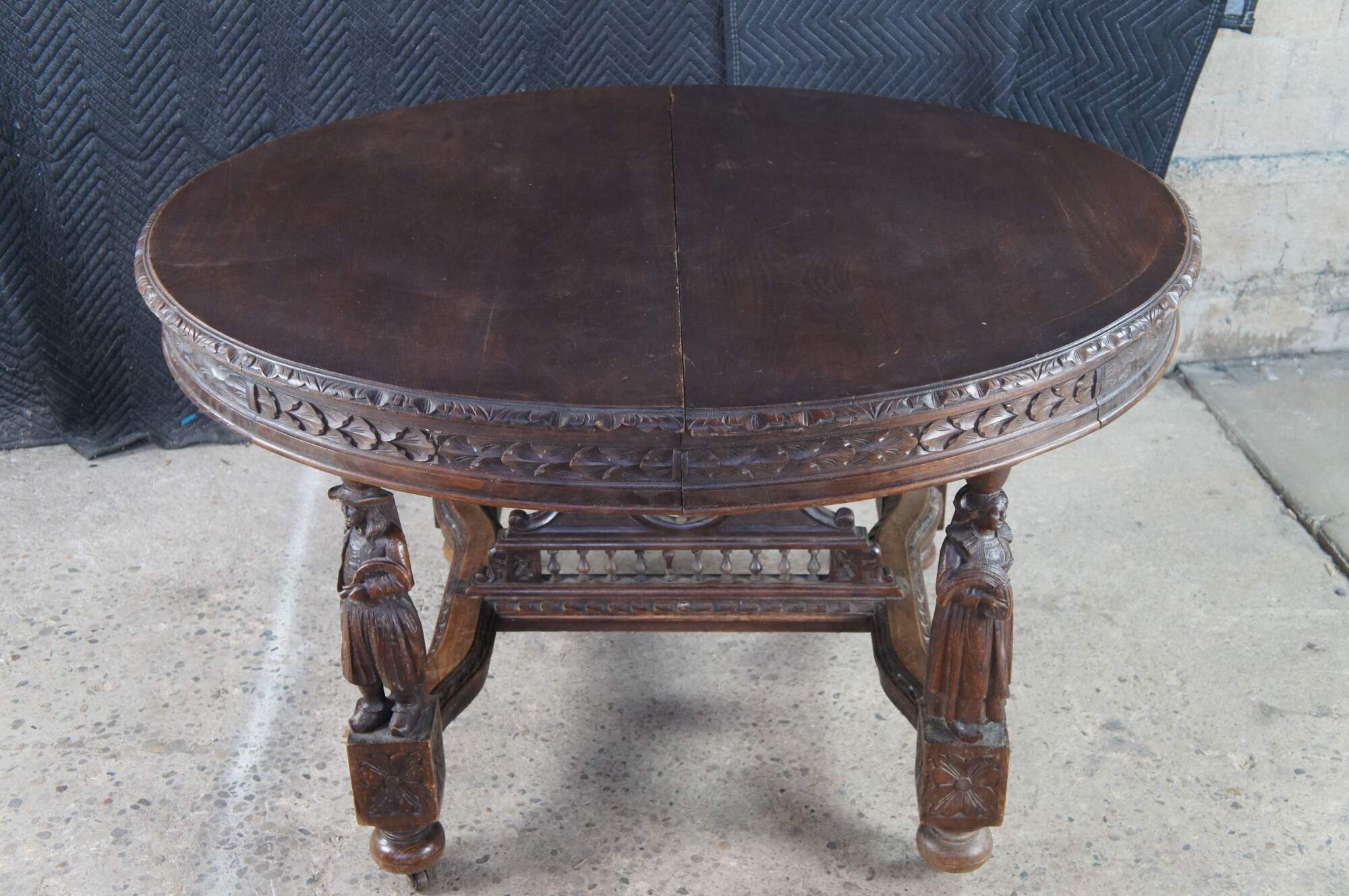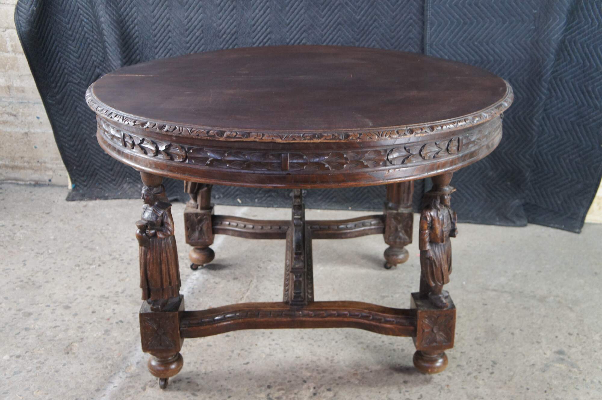 This beautiful table was hand crafted from chestnut featuring figural legs of men and women holding a sythe and sheath of wheat, and drinking. The legs are connected by a pierced nautical wheel with floret medallions and scrolled acathus leaves supported by a bauluster rail. Jake add more here.