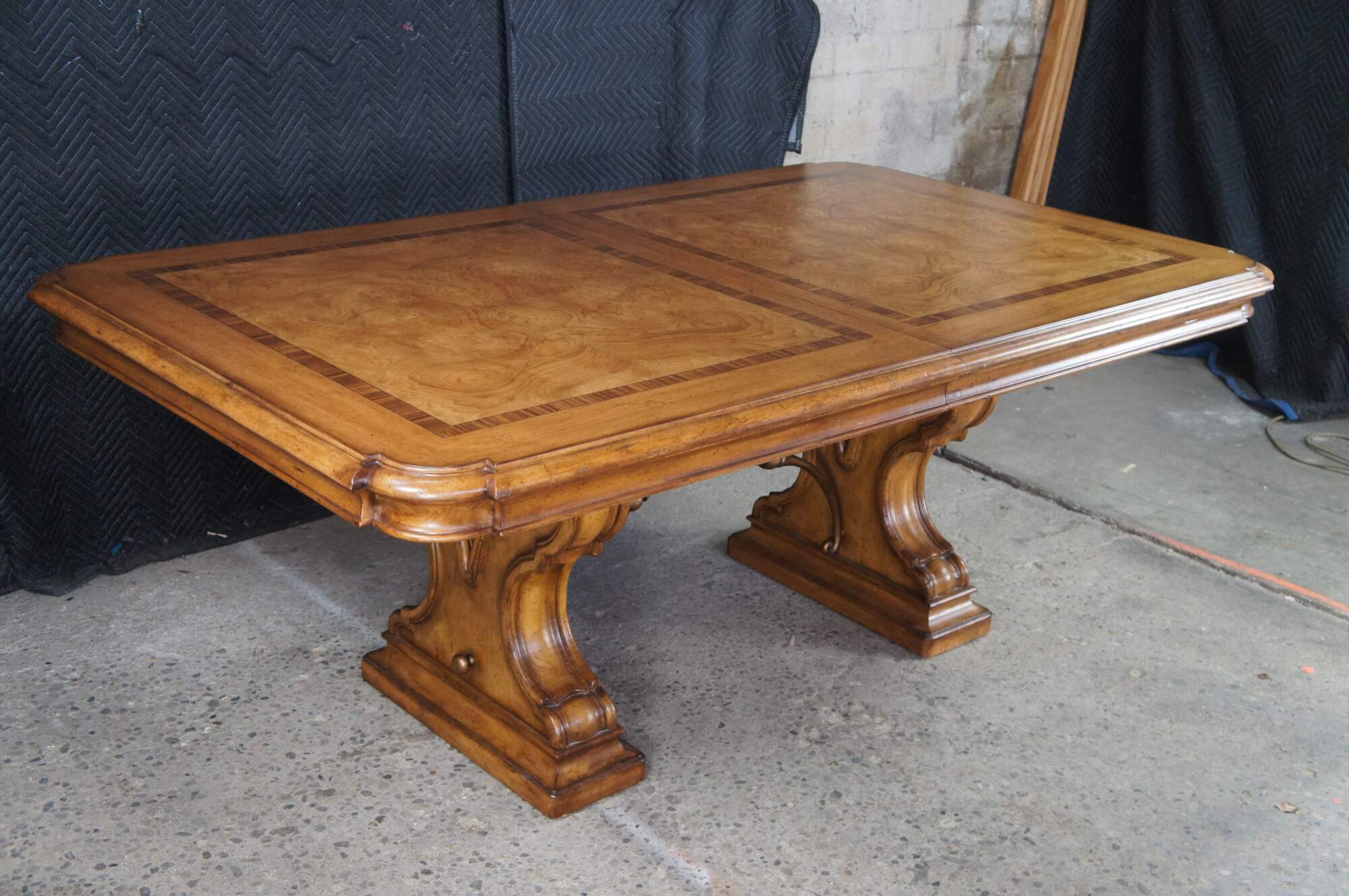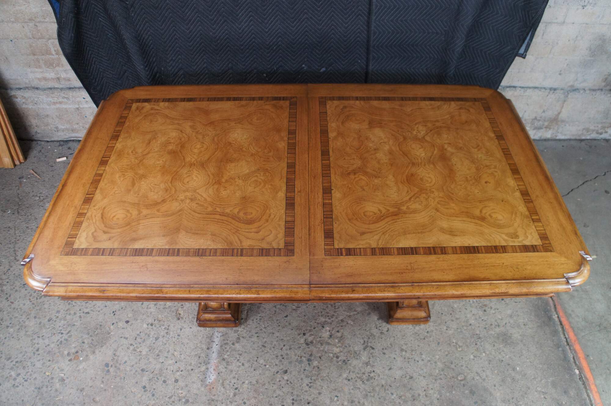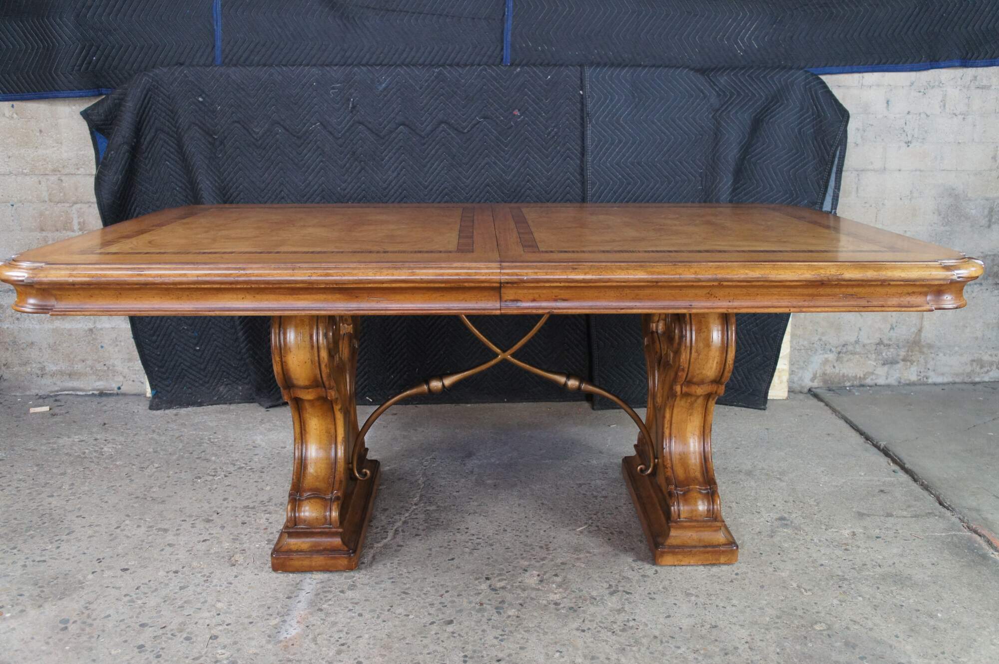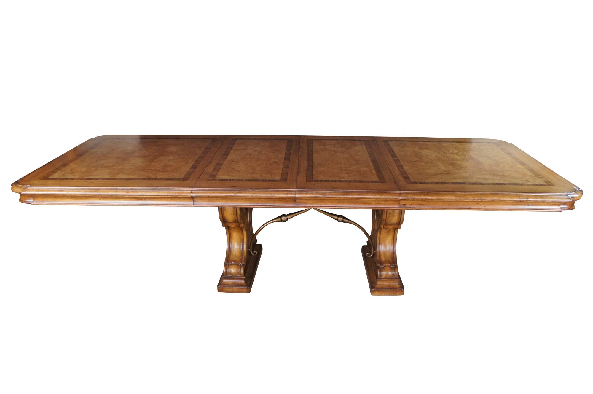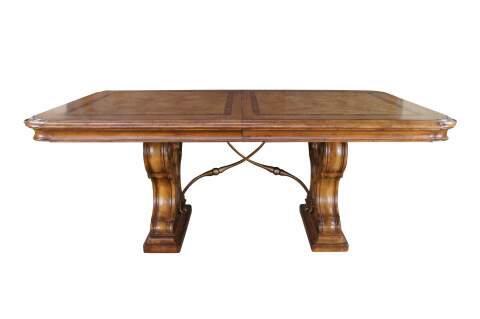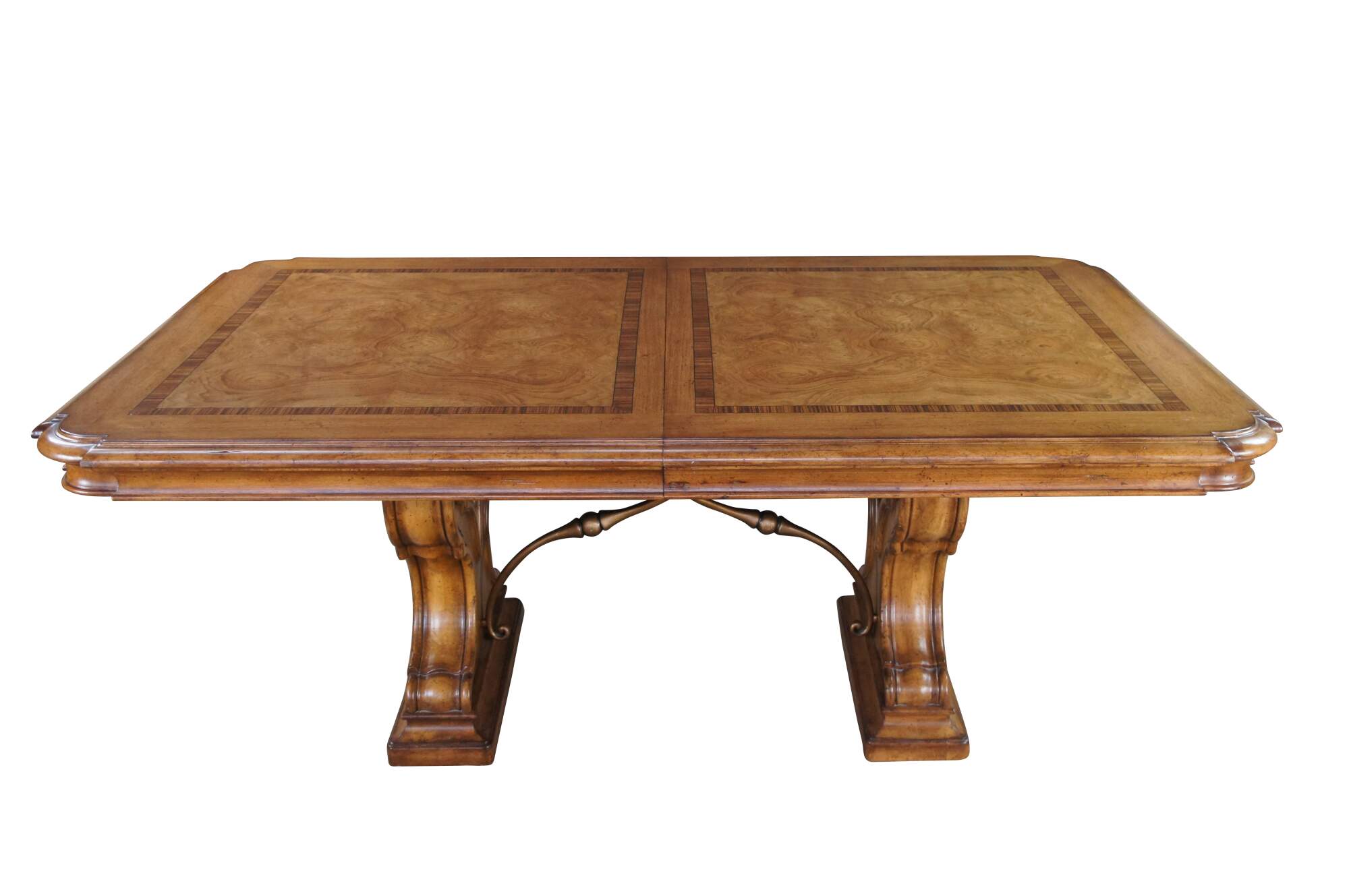 Vintage Thomasville Italian Hills of Tuscany Bibbiano dining table featuring olive ash burl, rustic pecan, and zebrawood inlay top with notched corners, and supported by a double pedestal trestle base connected by scrolled Spanish style metal stretchers. Extendable with two large leaves.