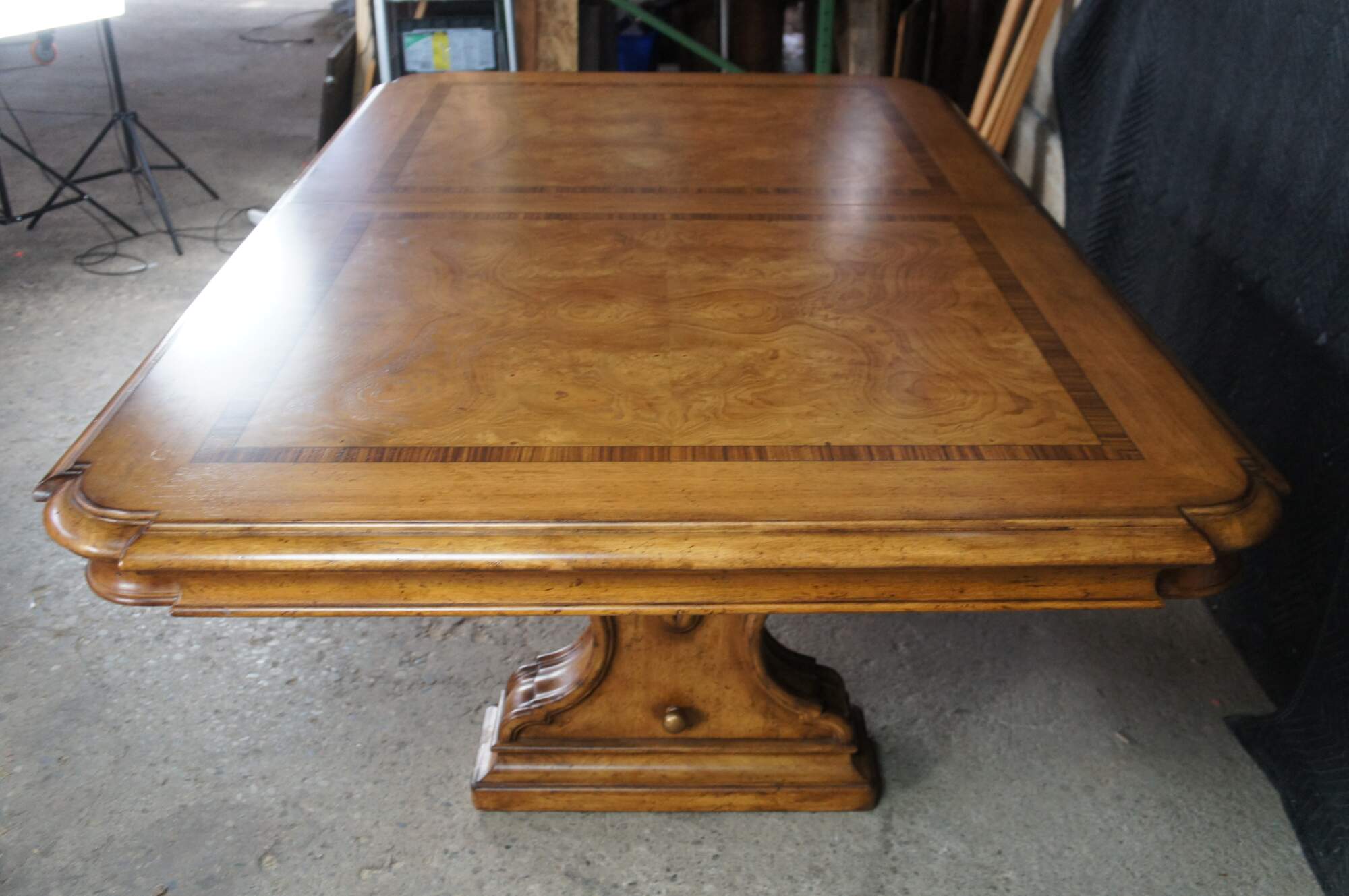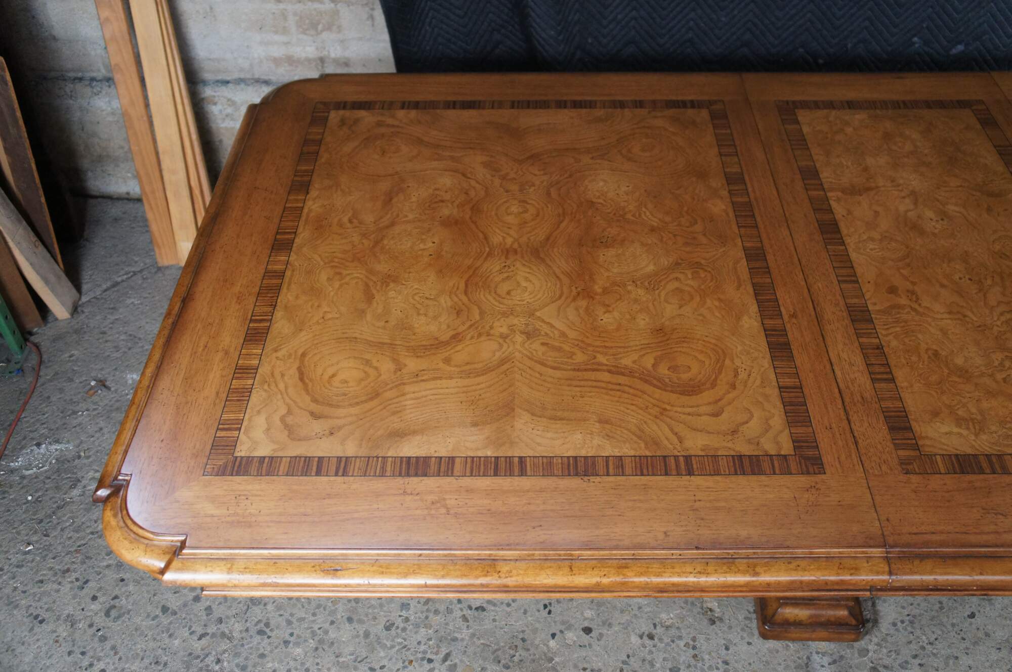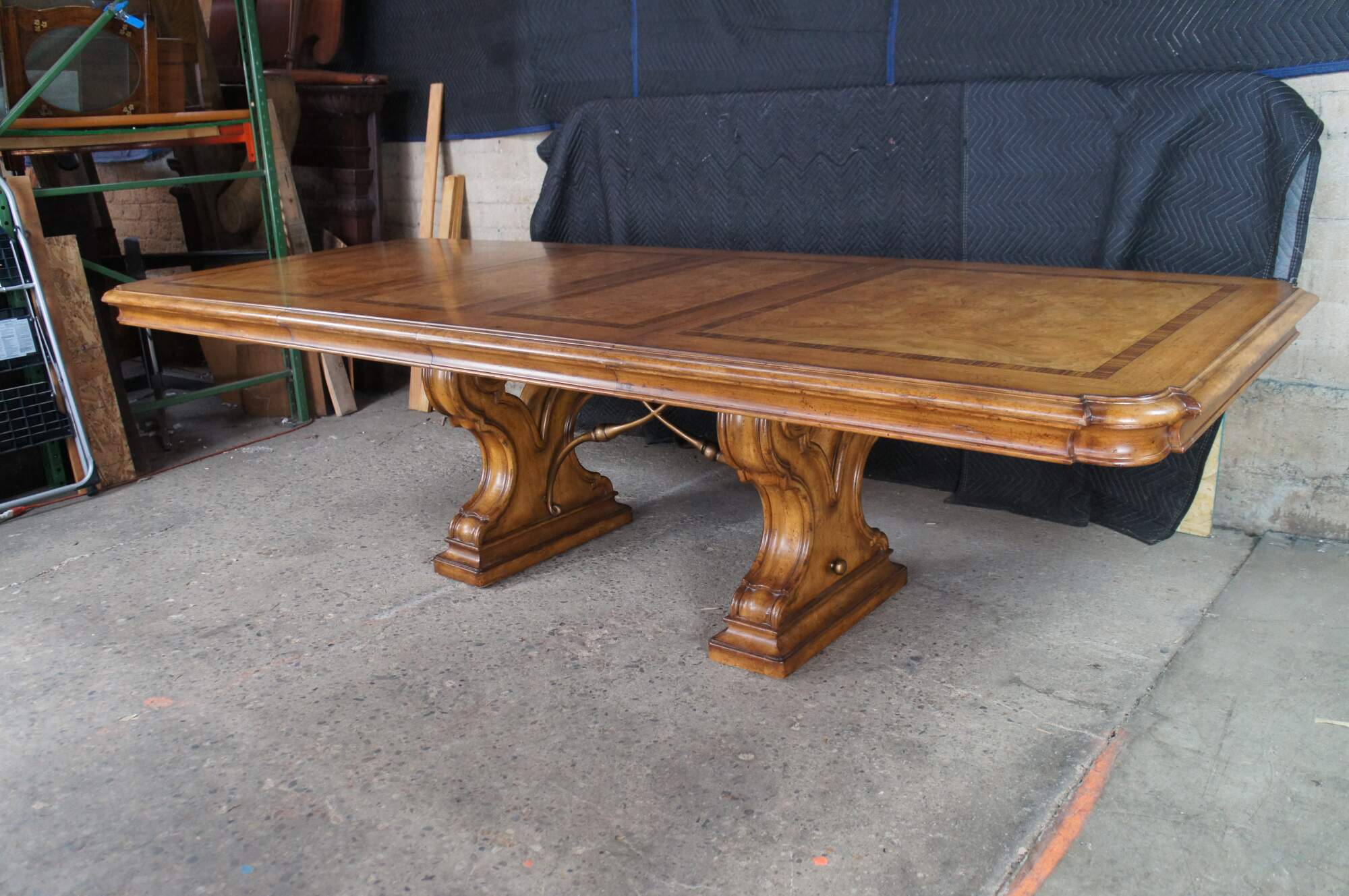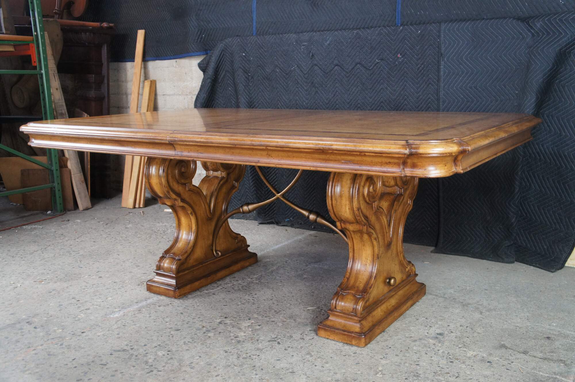 Vintage Thomasville Italian Hills of Tuscany Bibbiano dining table featuring olive ash burl, rustic pecan, and zebrawood inlay top with notched corners, and supported by a double pedestal trestle base connected by scrolled Spanish style metal stretchers. Extendable with two large leaves.
