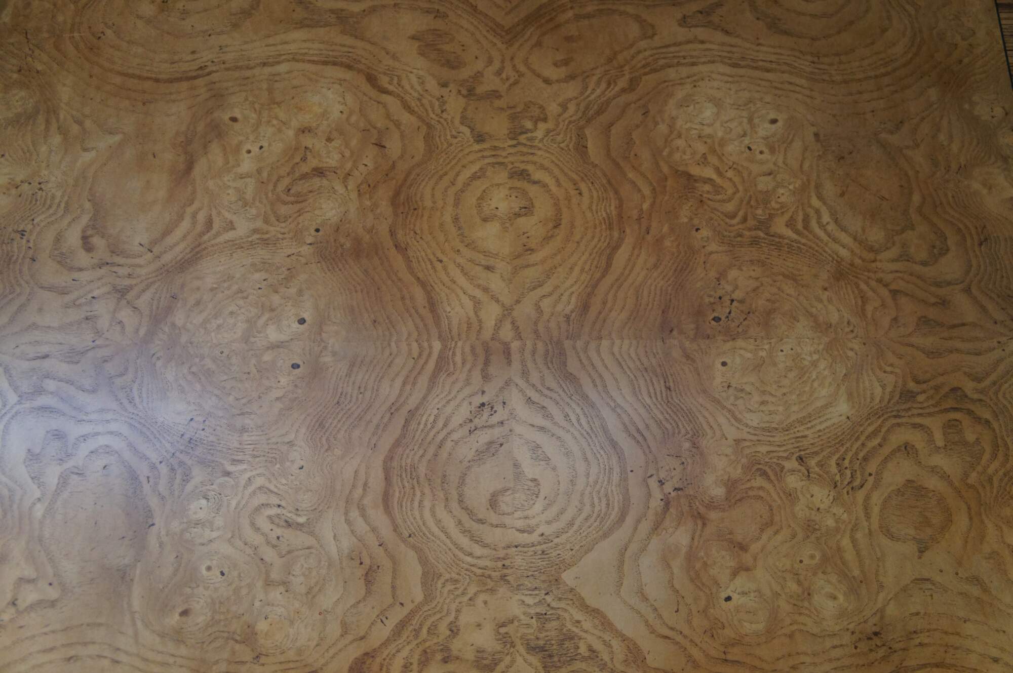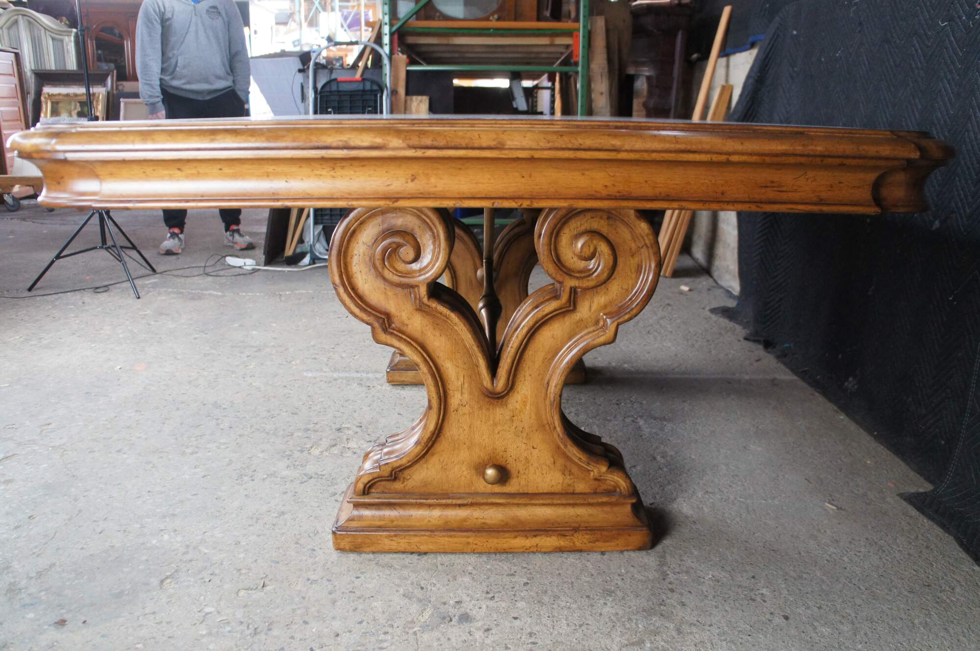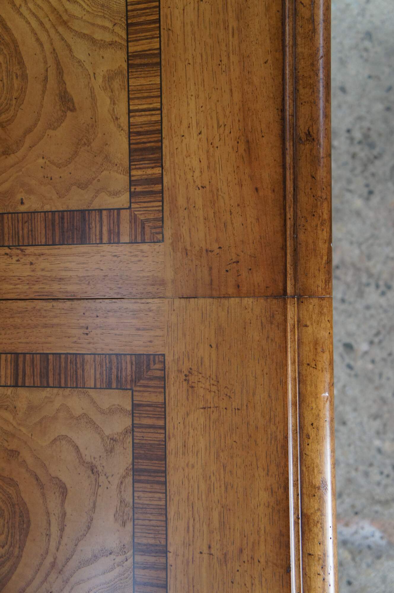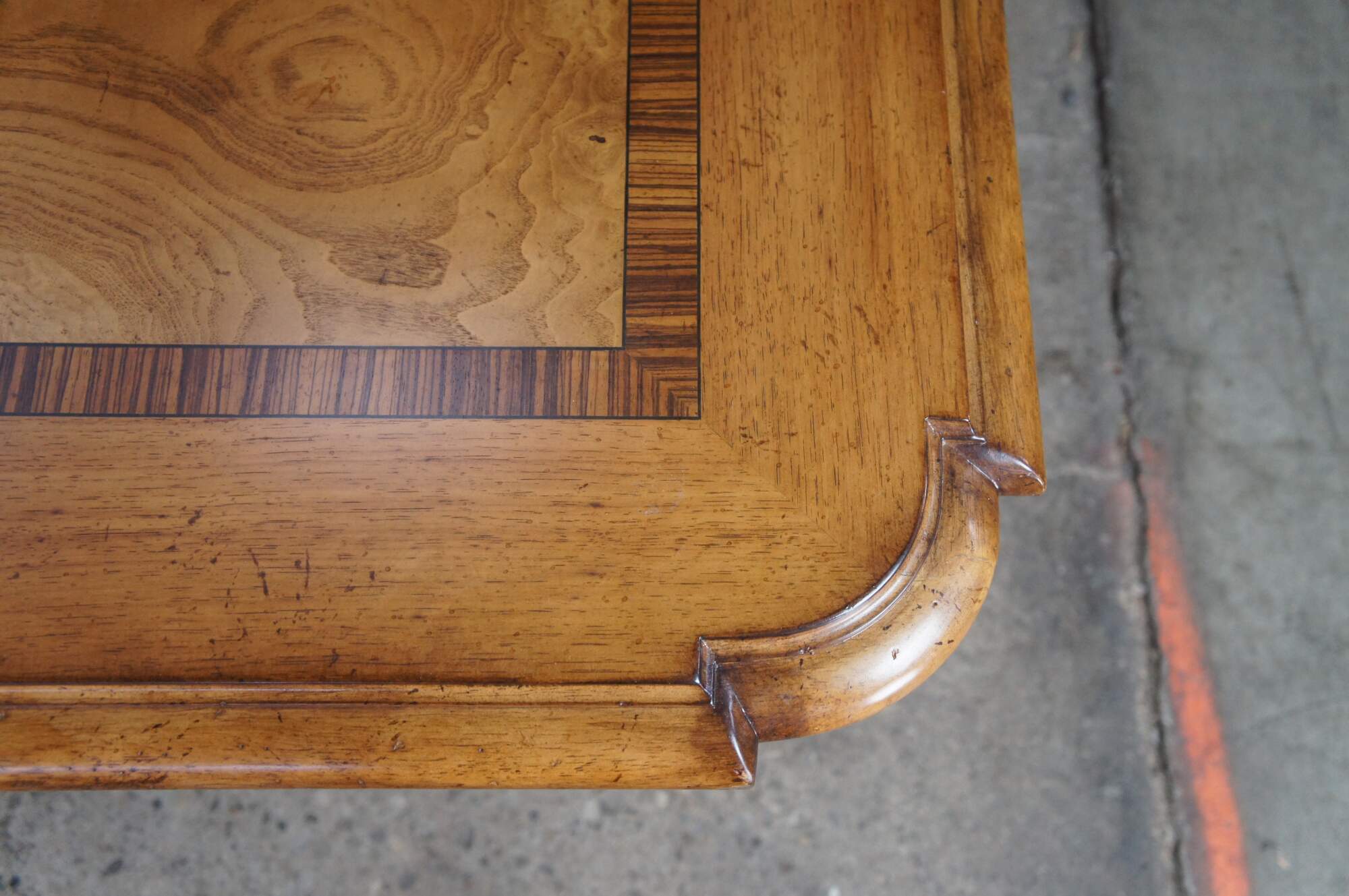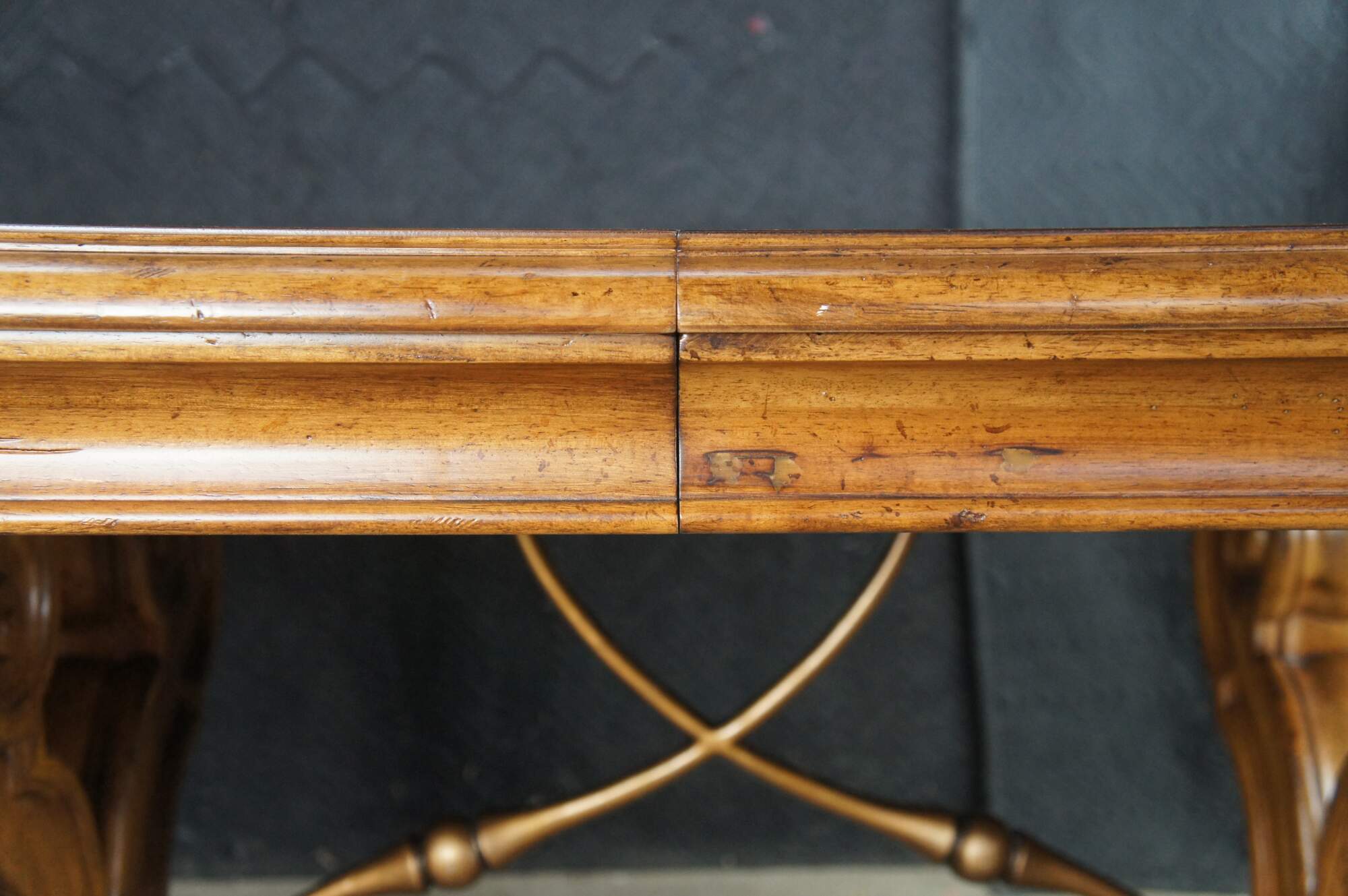 Vintage Thomasville Italian Hills of Tuscany Bibbiano dining table featuring olive ash burl, rustic pecan, and zebrawood inlay top with notched corners, and supported by a double pedestal trestle base connected by scrolled Spanish style metal stretchers. Extendable with two large leaves.