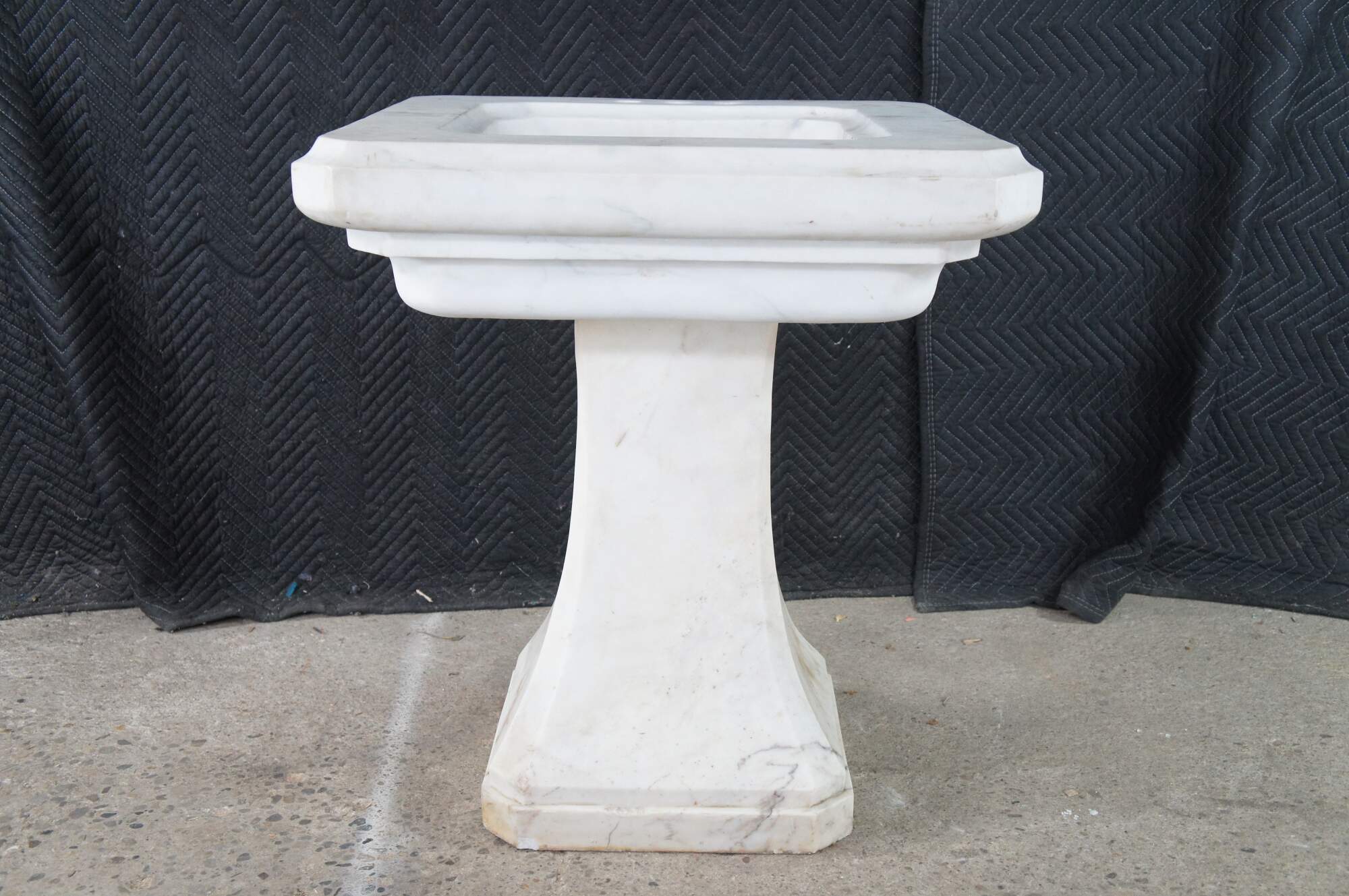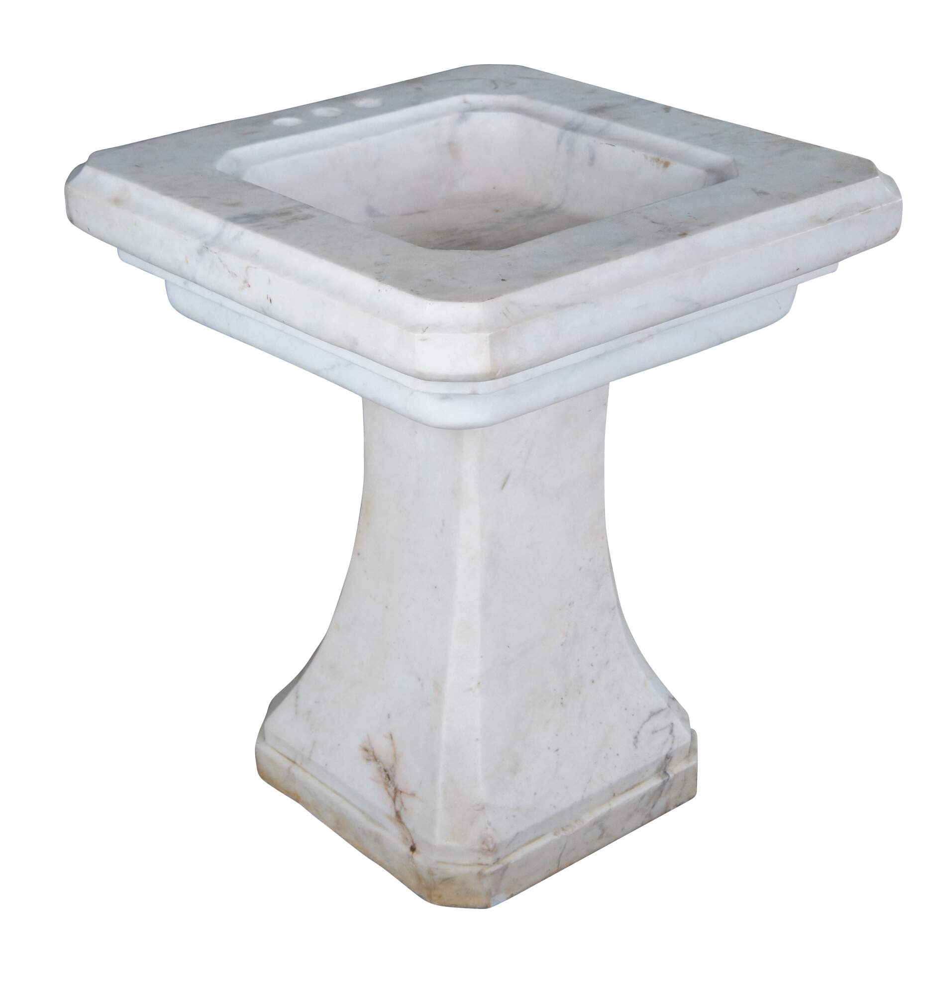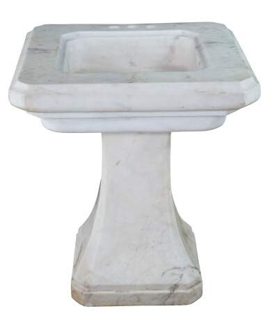Monumental mid century Italian white Carrara marble bathroom sink. A tapered rectangular plith column supports a square form sink with a beveled and notched design.