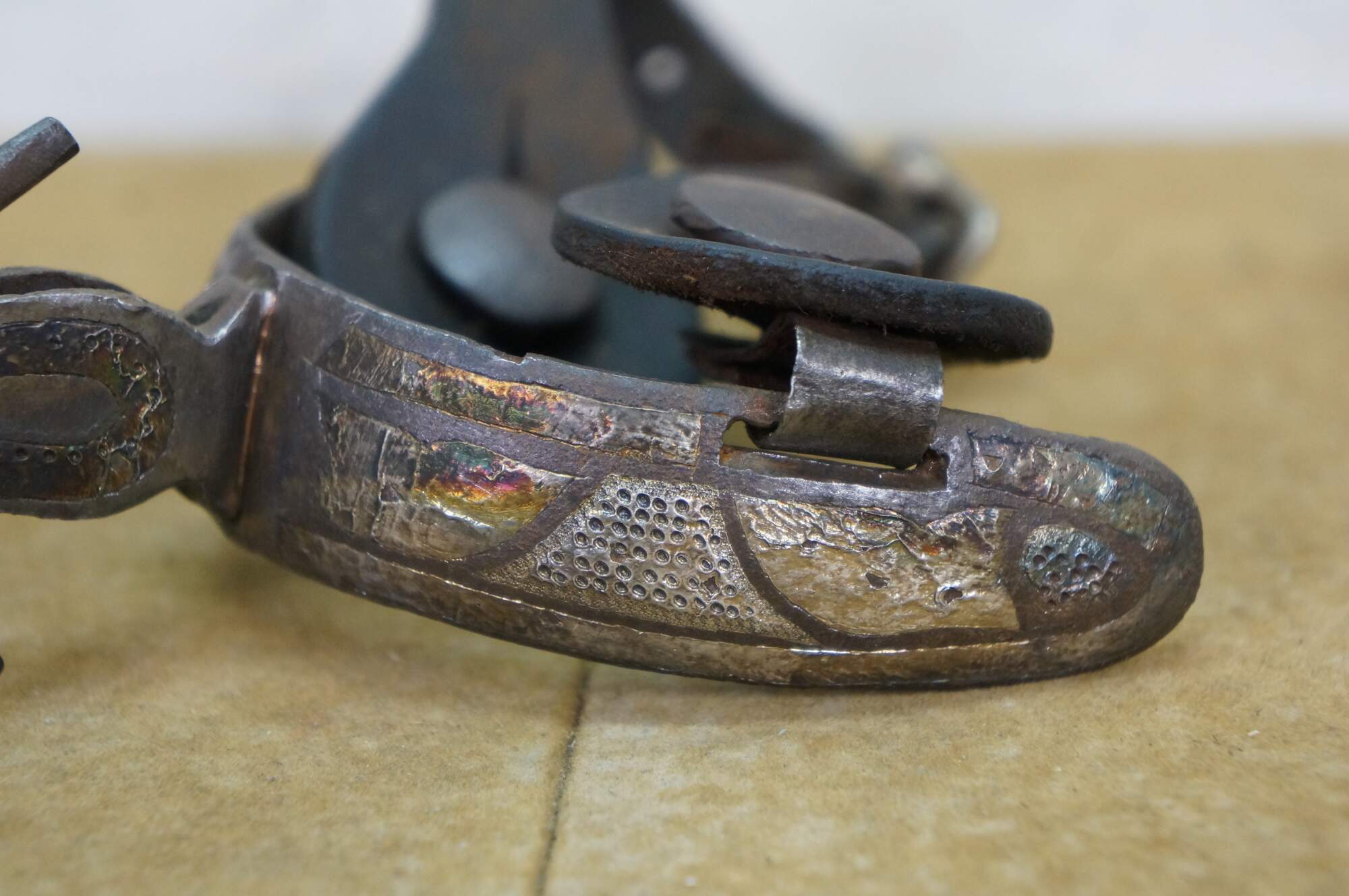Antique Western / Southwestern Mexican Spanish Cowboy equestrian / horseshoe Charro spurs made of wrought iron with copper inlay and leather straps.