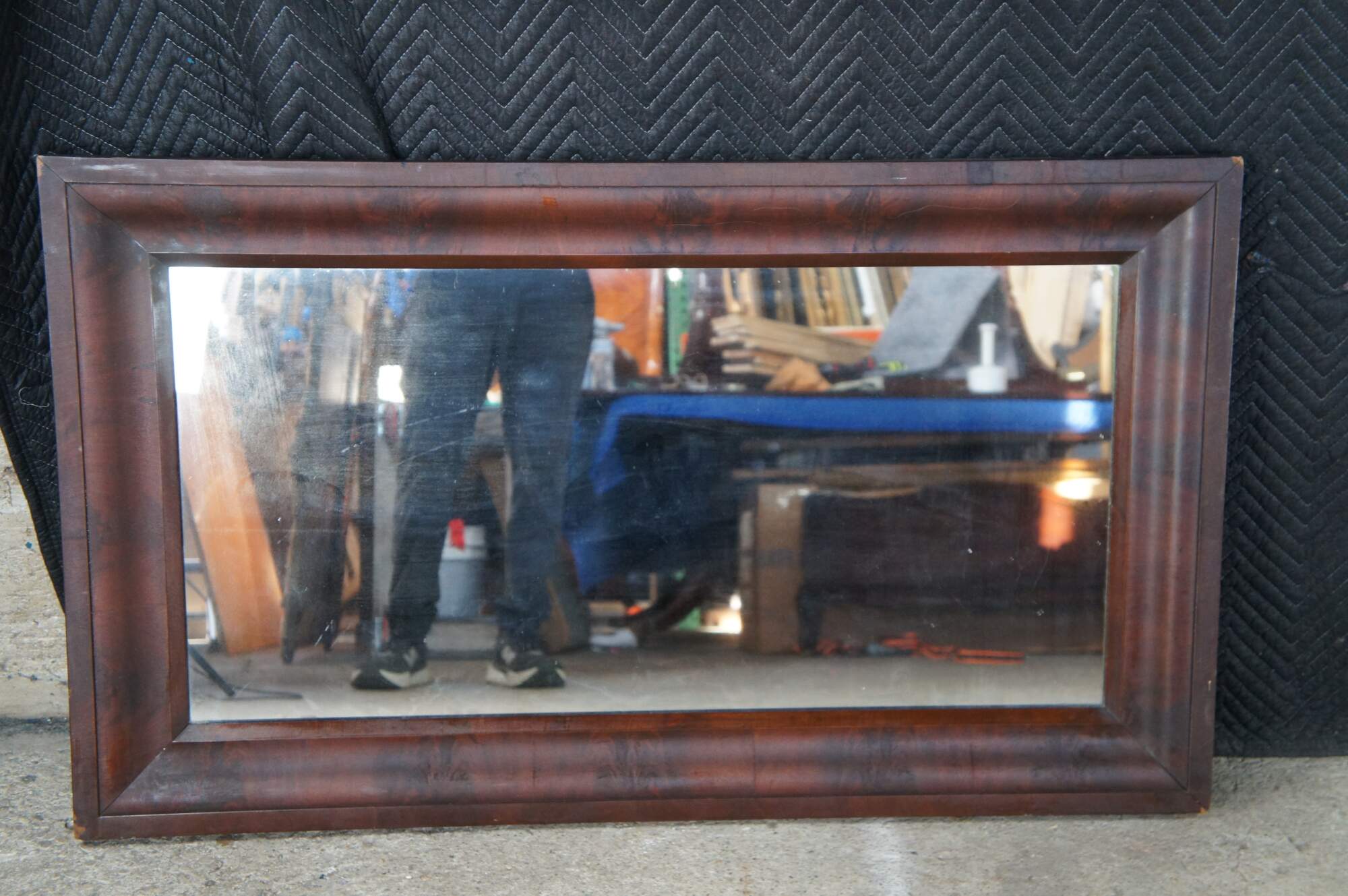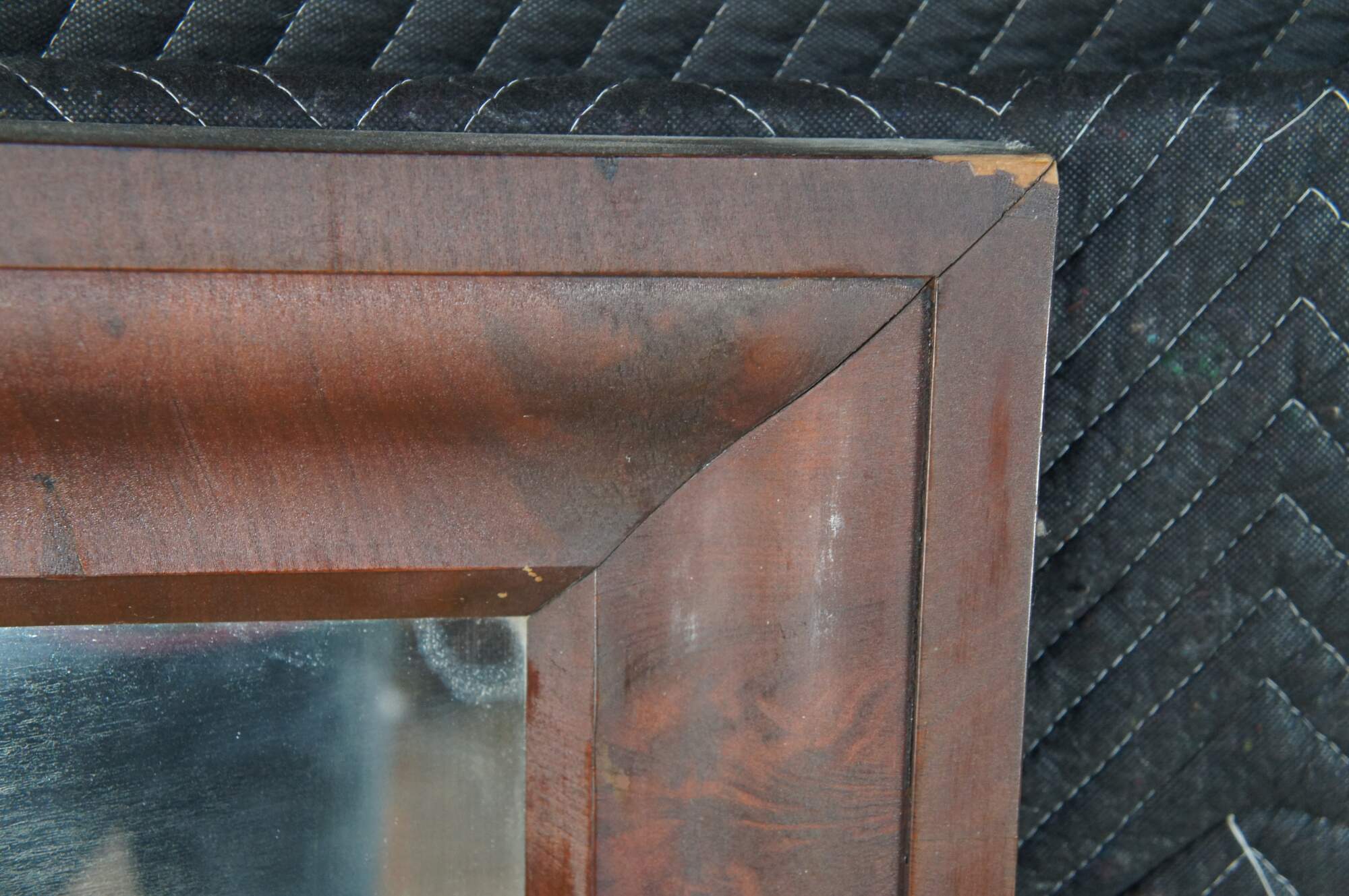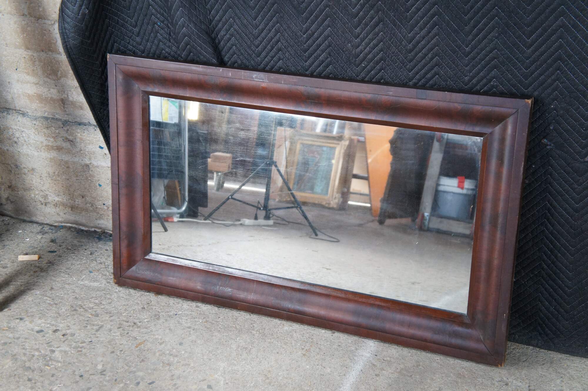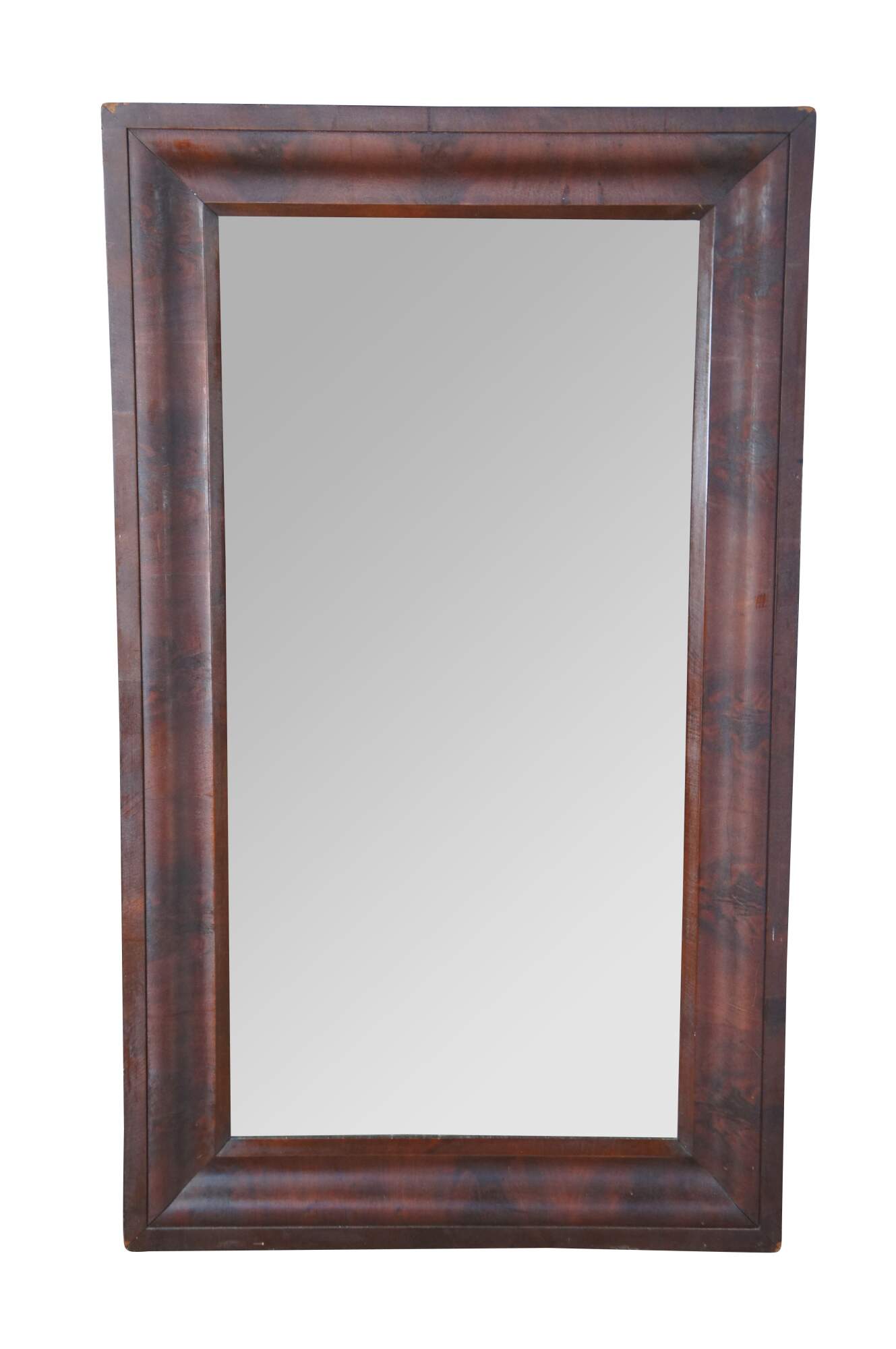 A very large and impressive antique American Empire wall vanity mirror, made of flamed mahogany featuring rectangular form with a deep beveled frame.