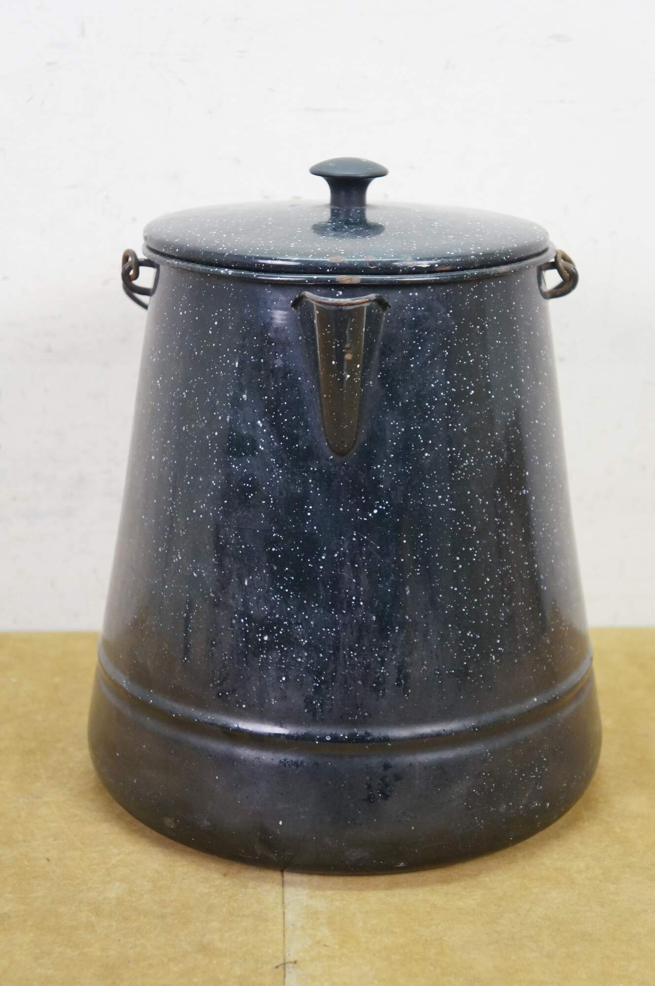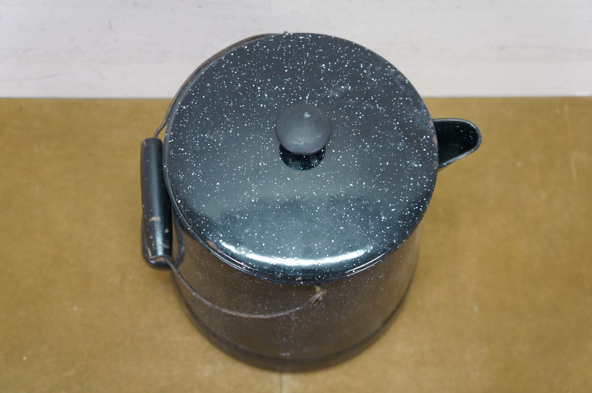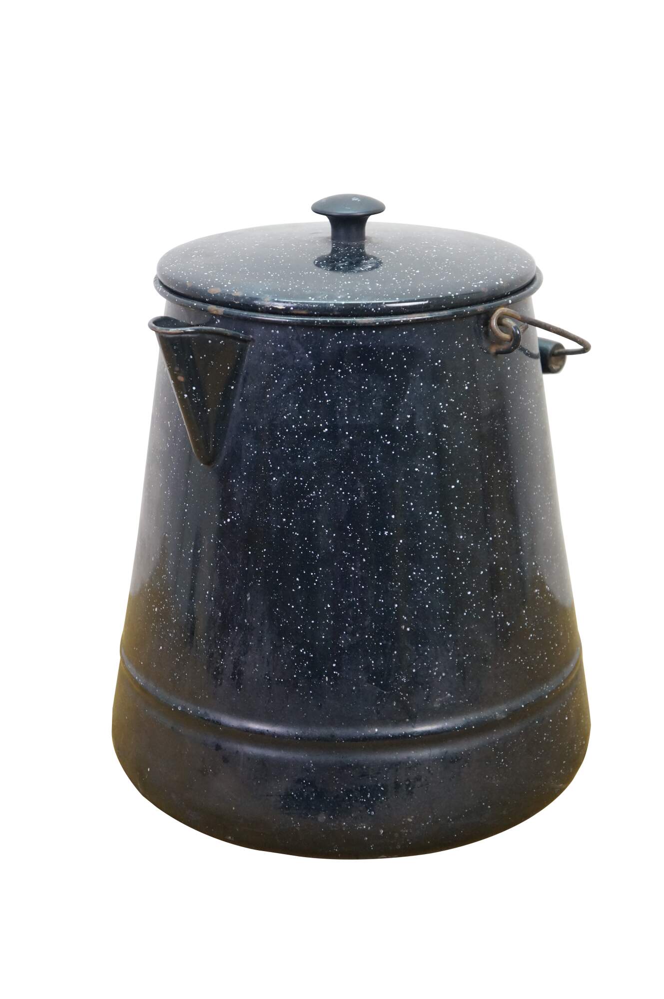 Antique graniteware / enamelware coffee / tea / water pot / pitcher / kettle. It is made of metal coated in a speckled, rust-resistant black porcelain enamel.� The pot includes a bale handle with a wooden grip for lifting, a sturdy spout, and a lid.� Campfire, Camping, Farmhouse.