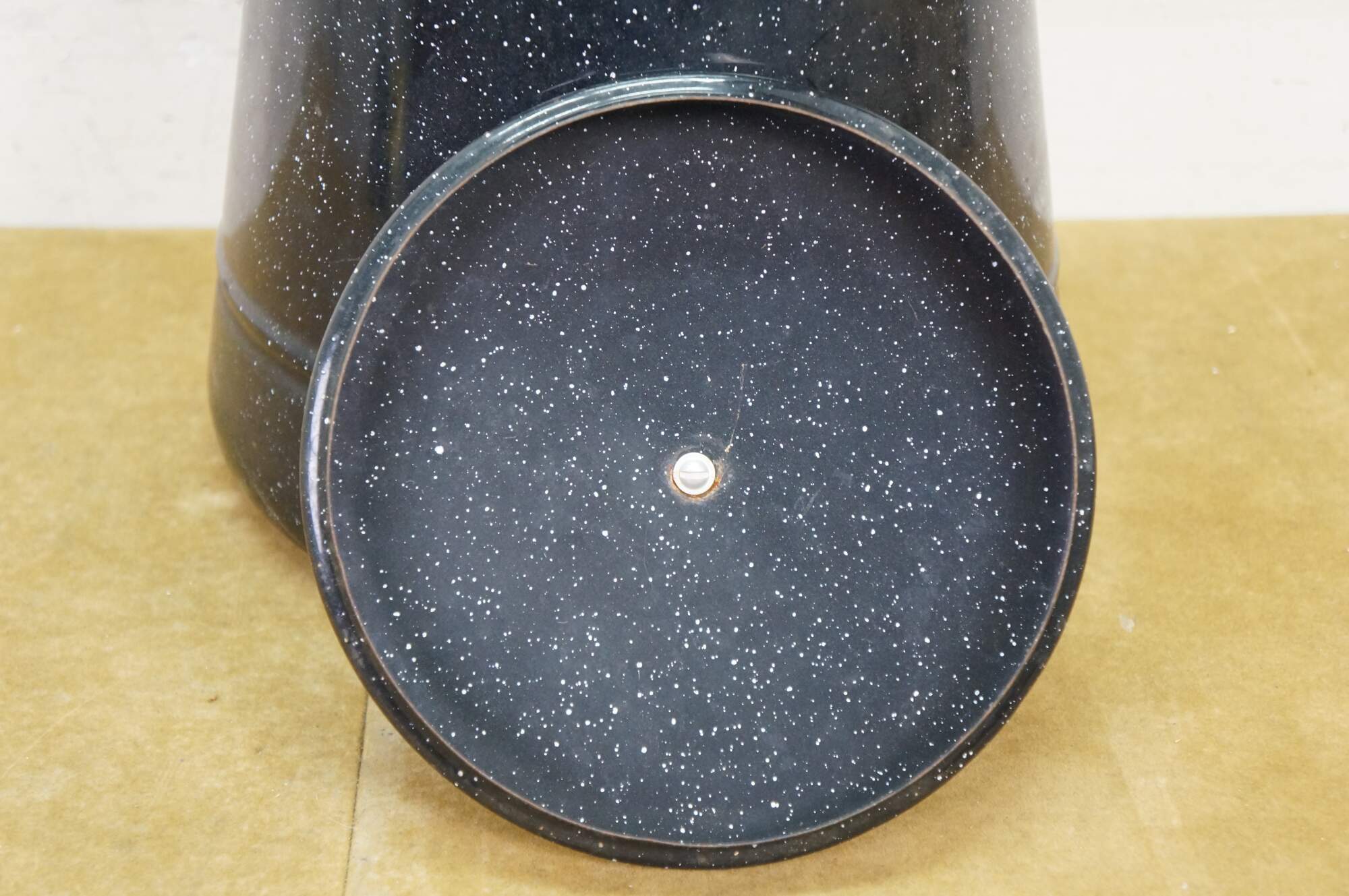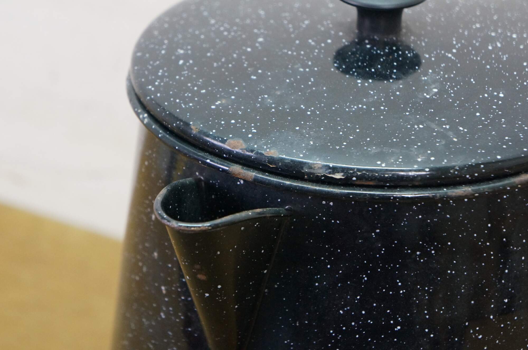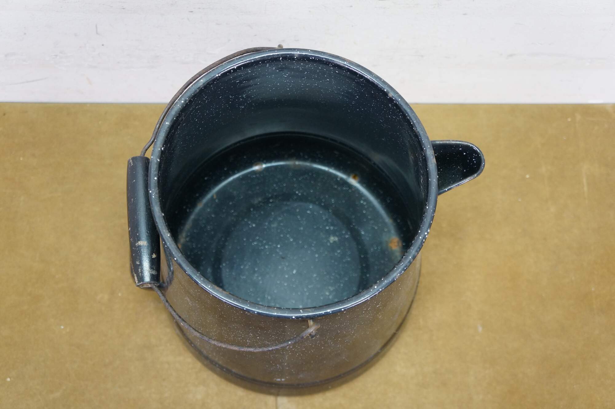 Antique graniteware / enamelware coffee / tea / water pot / pitcher / kettle. It is made of metal coated in a speckled, rust-resistant black porcelain enamel.� The pot includes a bale handle with a wooden grip for lifting, a sturdy spout, and a lid.� Campfire, Camping, Farmhouse.