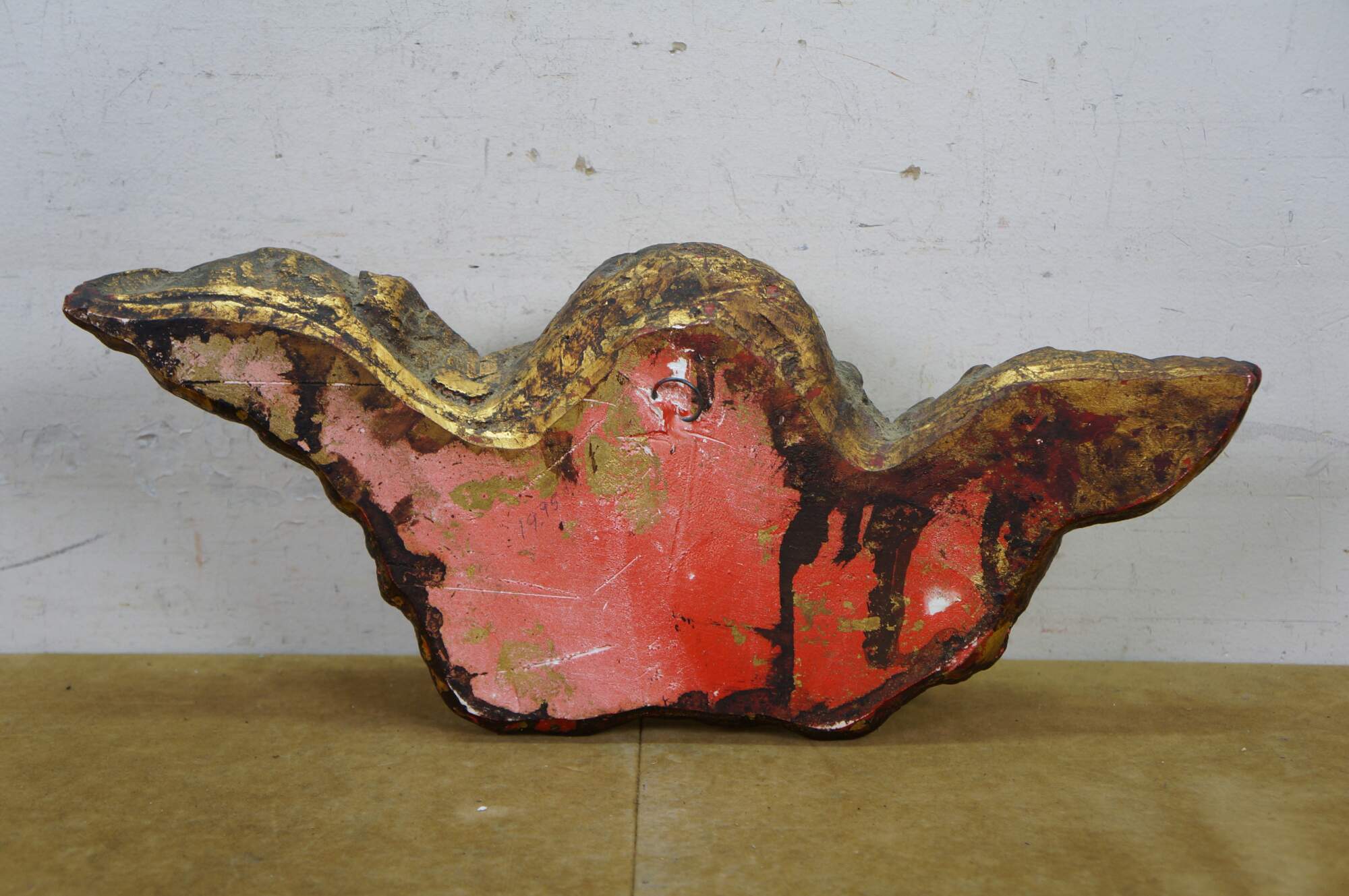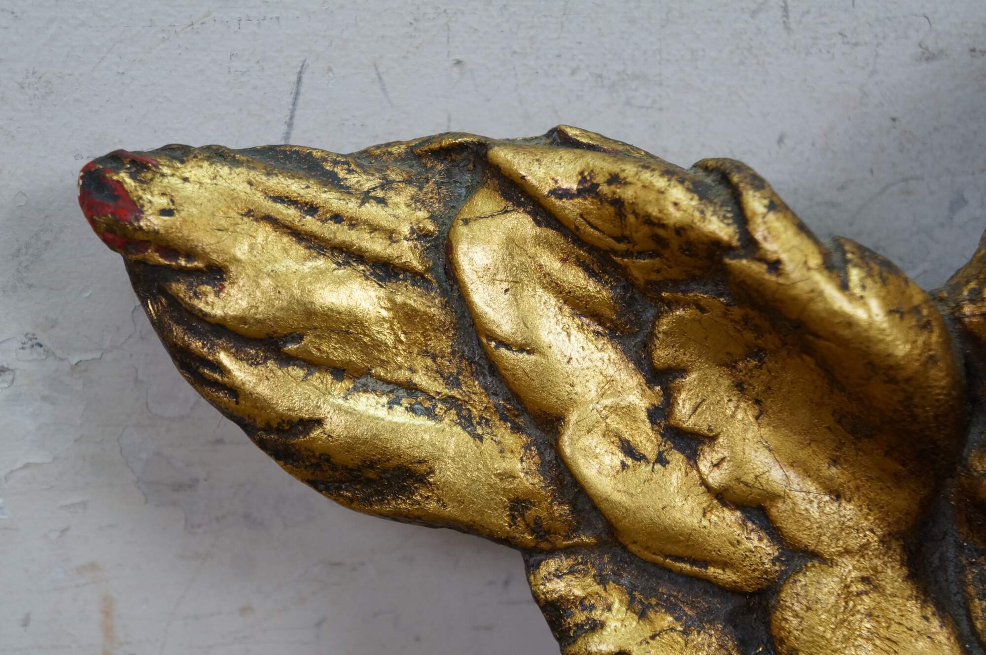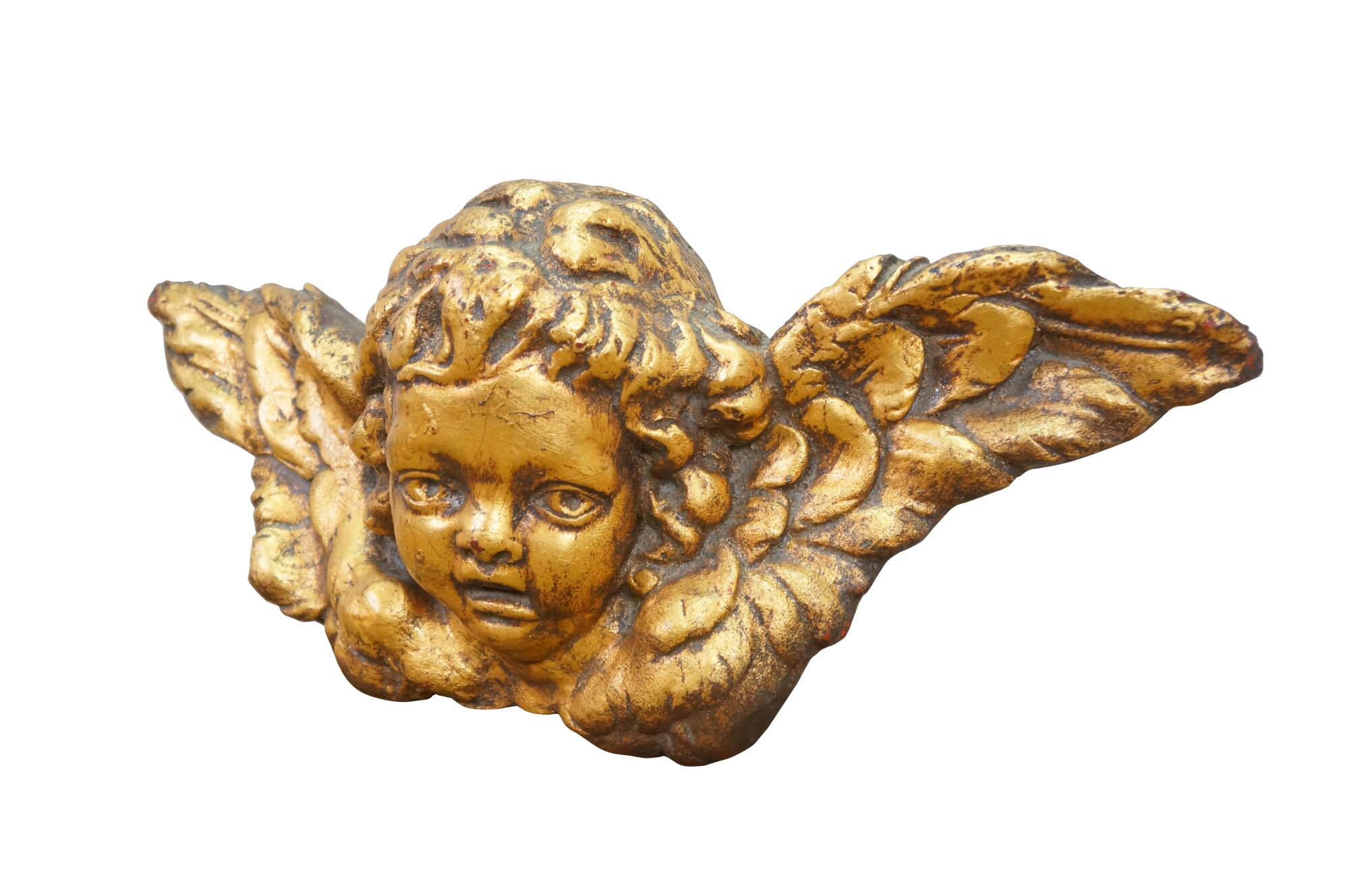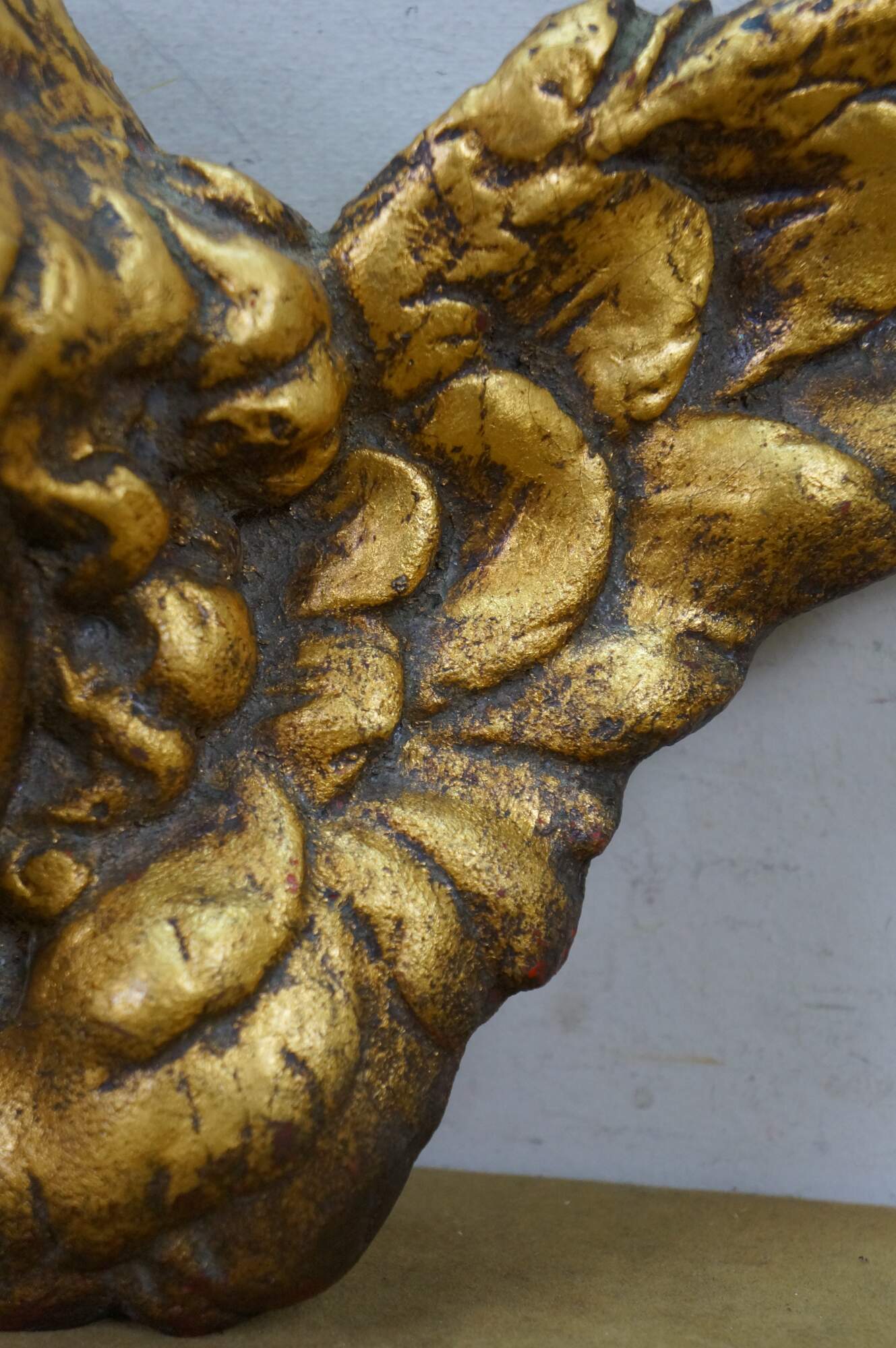 Large vintage Baroque / Rococo / Hollywood Regency style cherub / putti wall plaque sculpture, typically made of plaster or resin with a gold leaf / gilt finish.� Features a winged angelic head and shoulders, designed to project from a wall.