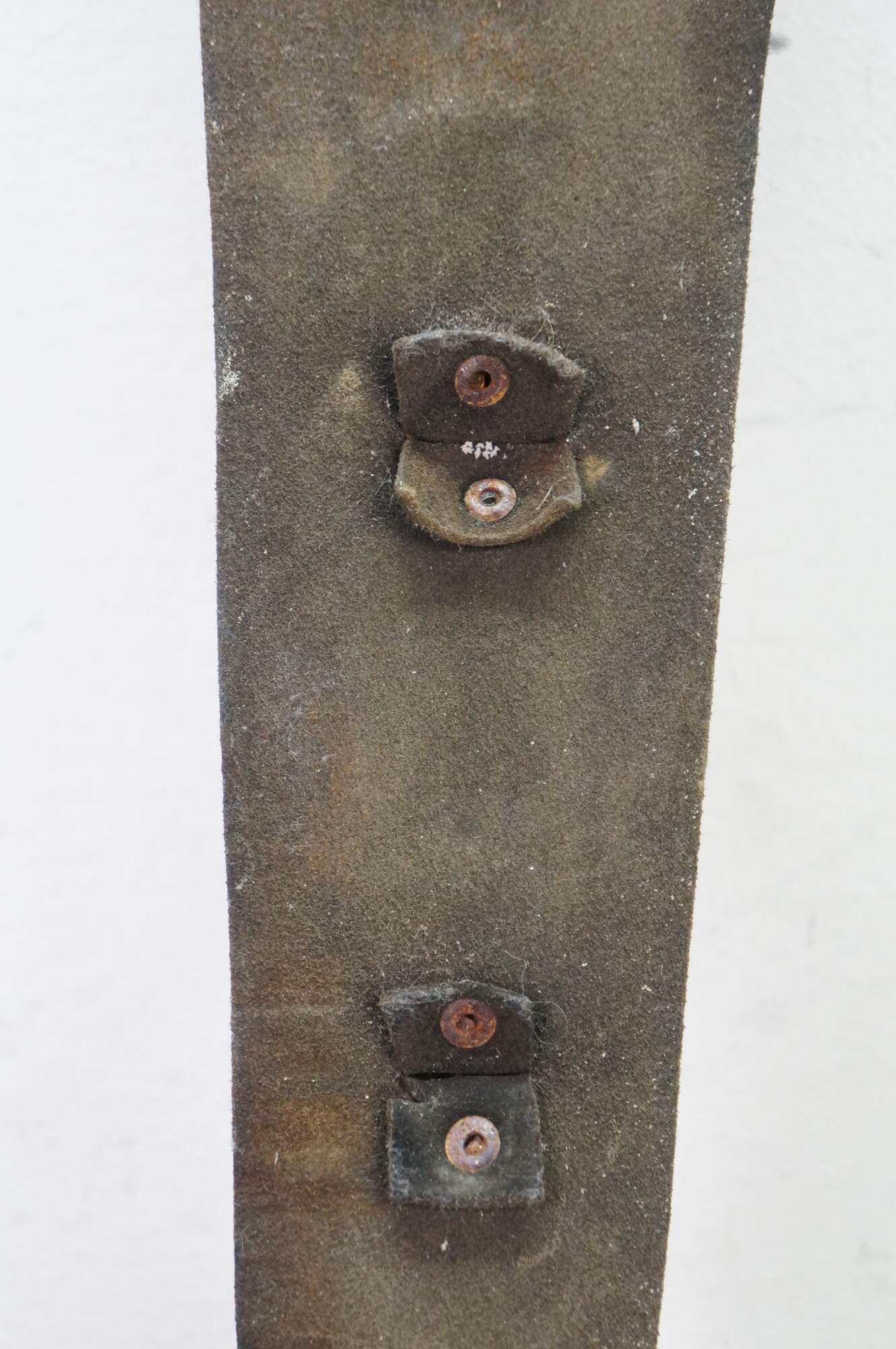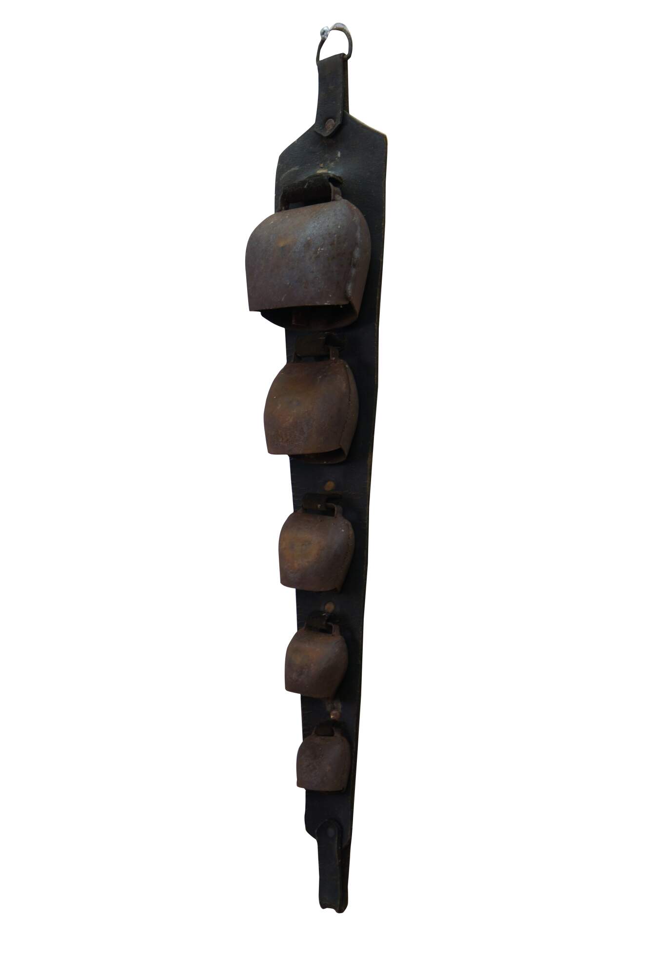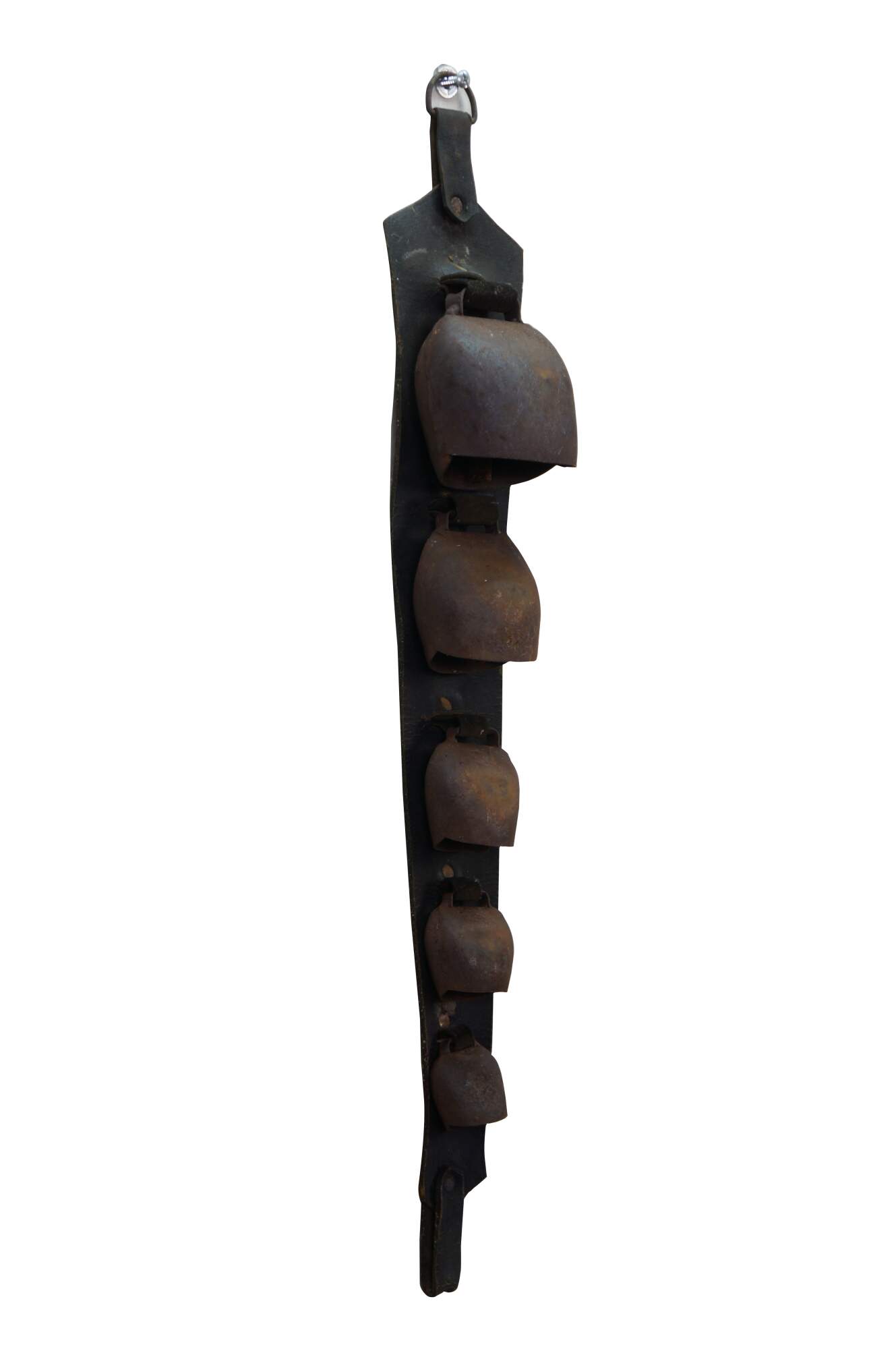 Antique set of Swiss cow / farmhouse / iron sleigh bells, graduated and attached to a leather strap.