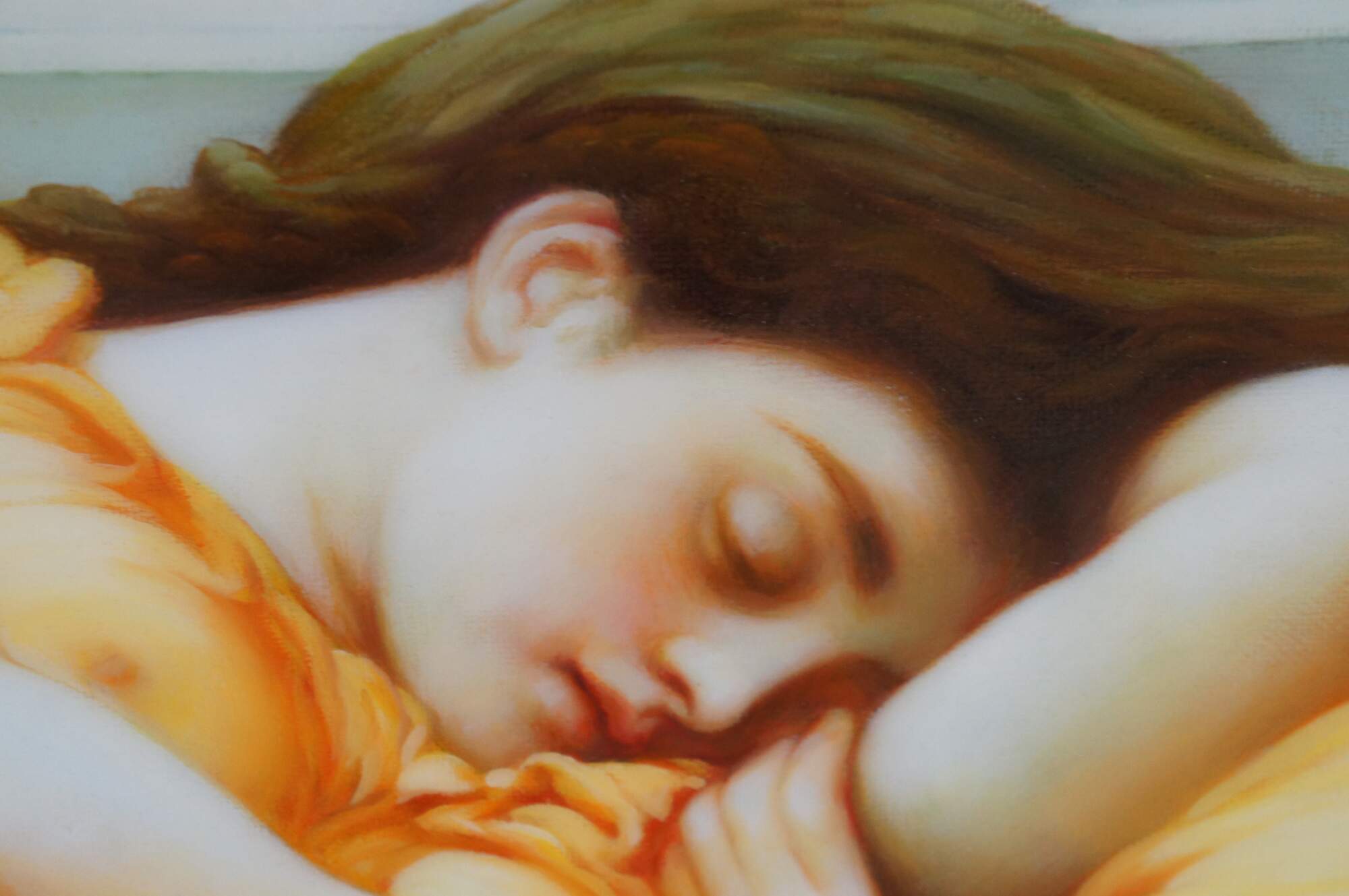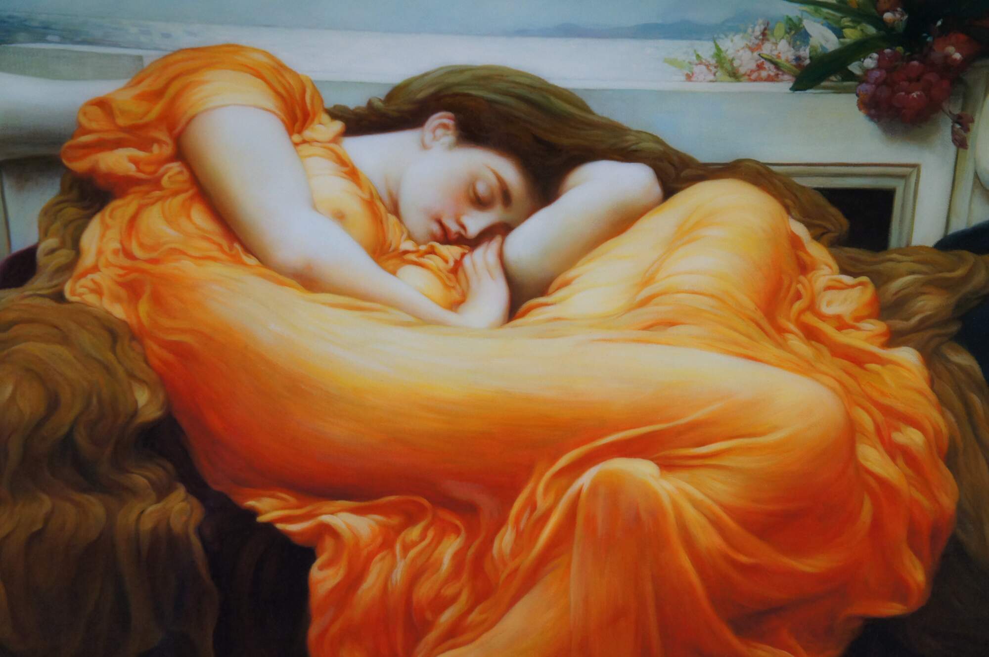 This painting depicts a young Neoclassical / Victorian woman with a sensuous, complex pose, sleeping peacefully on a marble terrace in a vivid, sheer orange gown. The setting is Mediterranean, with the sea visible in the distance, and the warm, golden light suggests the heat of summer. Leighton was known for his classicist Academic style and his commitment to the ideal of art for art's sake, focusing on aesthetic beauty rather than narrative context. The pose of the sleeping figure was reportedly inspired by Michelangelo's sculpture Night.