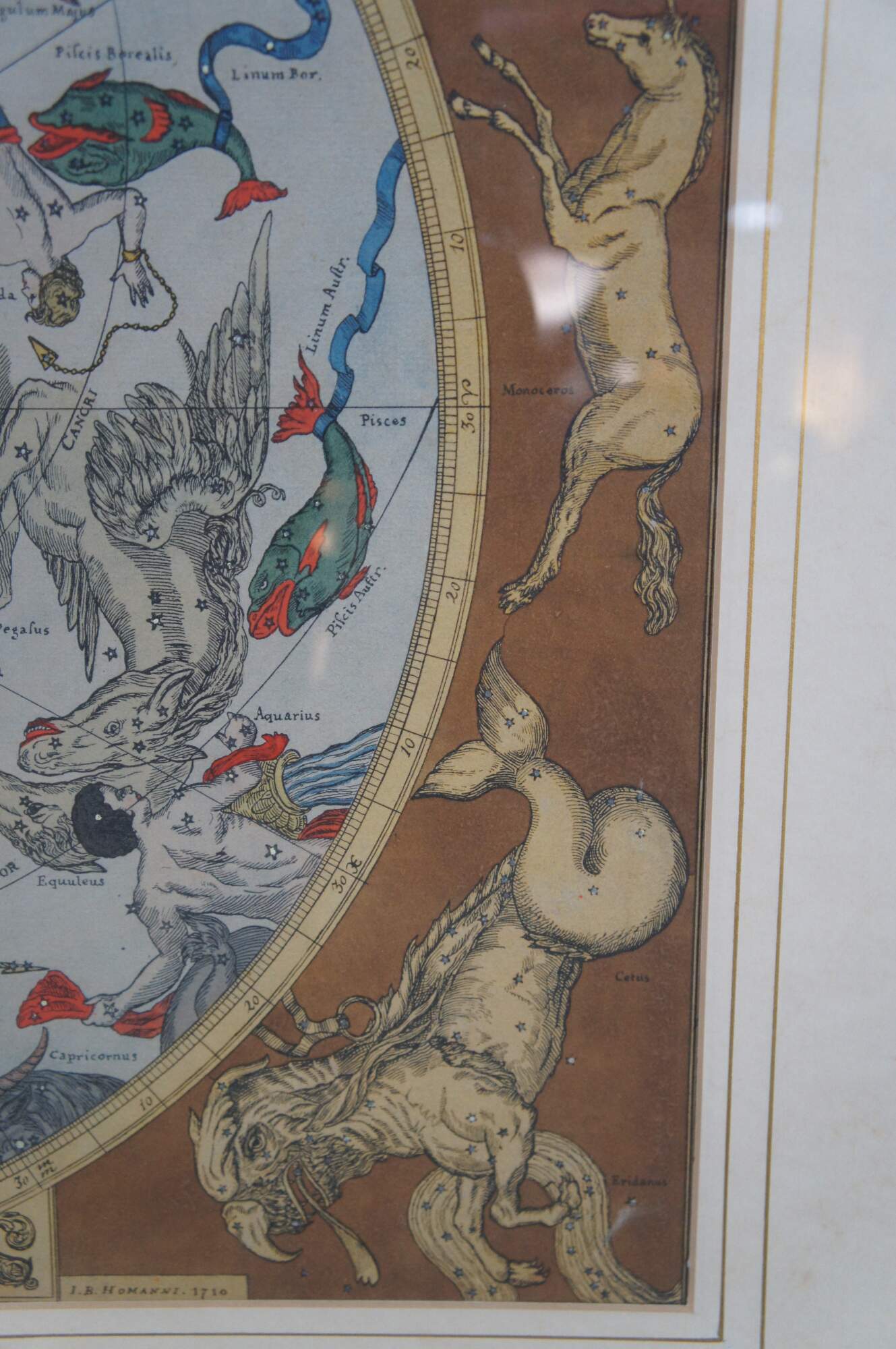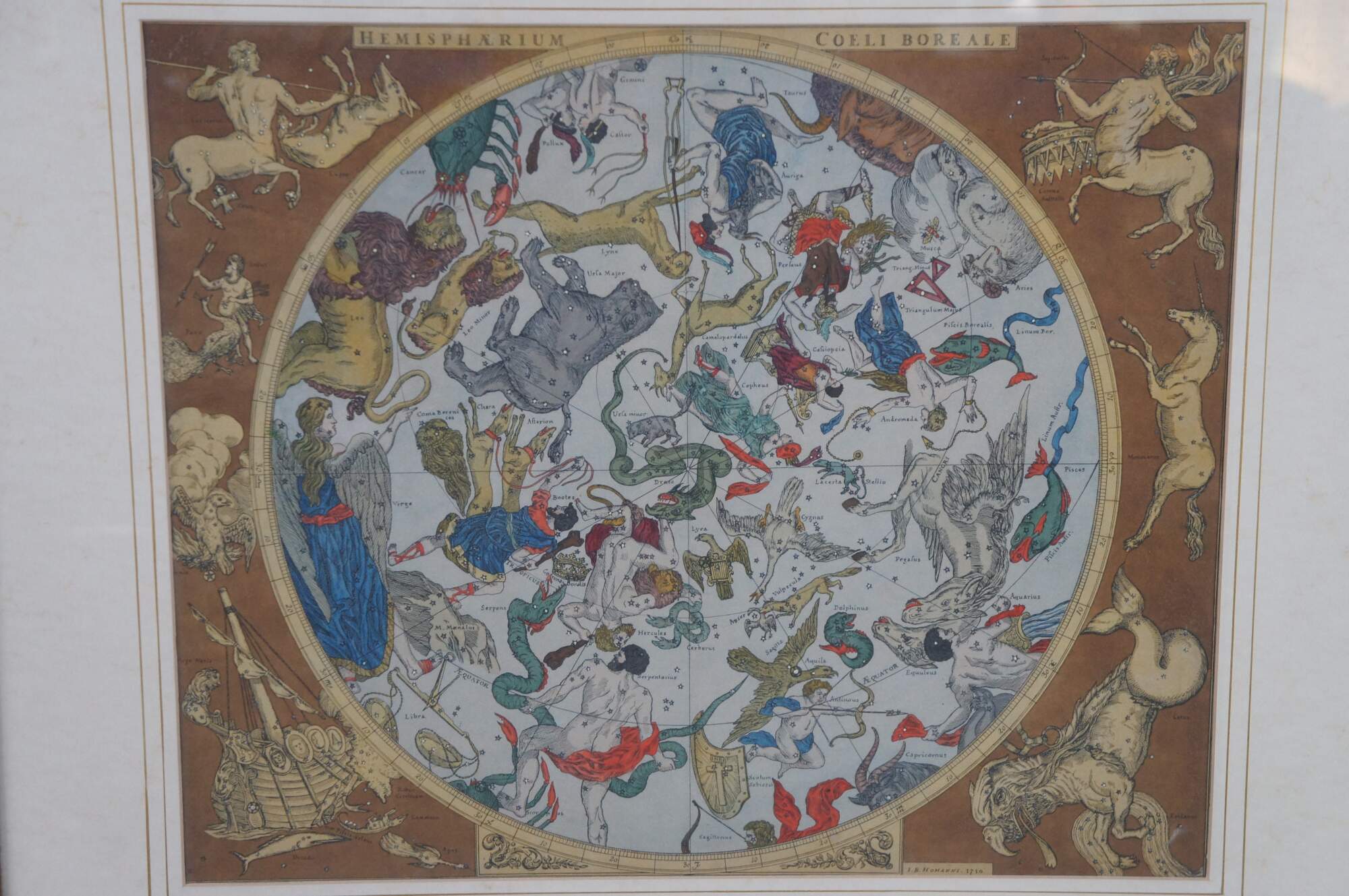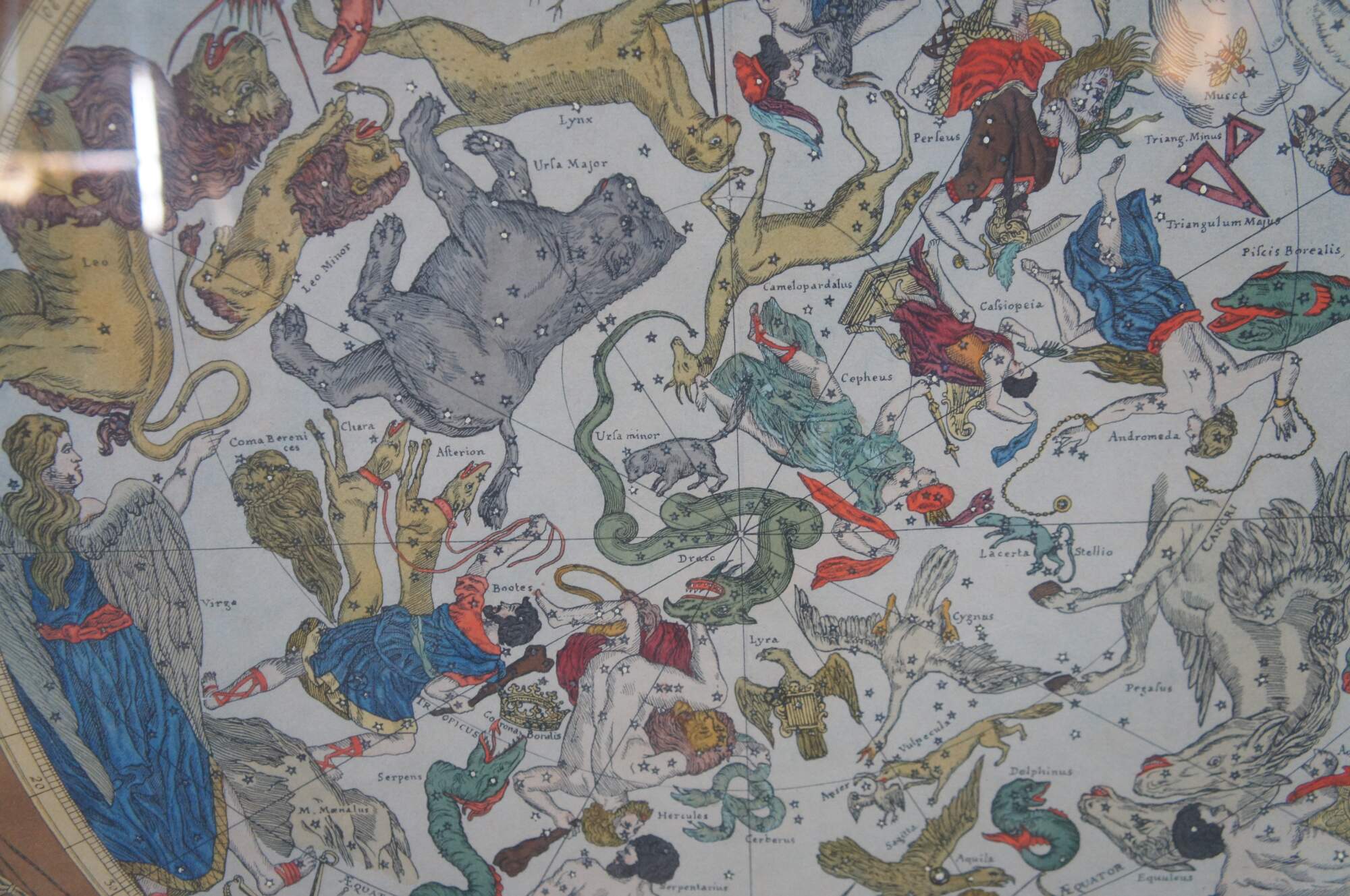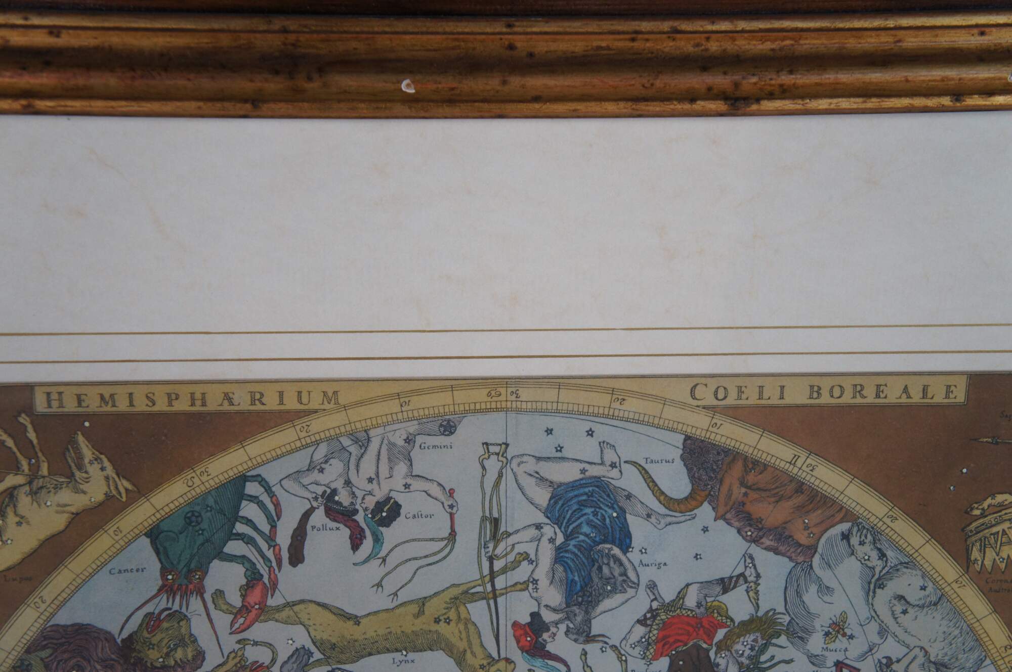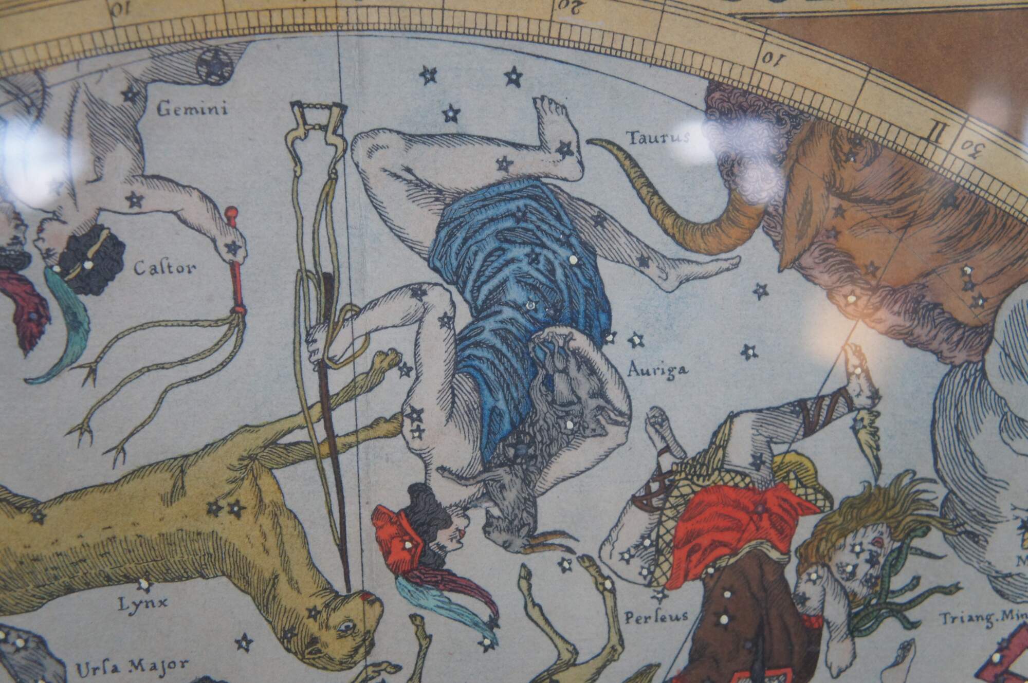 Large vintage copy of the Hemisphaerium Coeli Boreale historical celestial map. It depicts the constellations of the Northern Hemisphere based on classical Greek mythology and early astronomical data. The original map was notably published by the Homann Heirs in Nuremberg, Germany, around 1710–1742. It features decorative vignettes of celestial monsters, animals, and mythological figures surrounding the central circular chart.