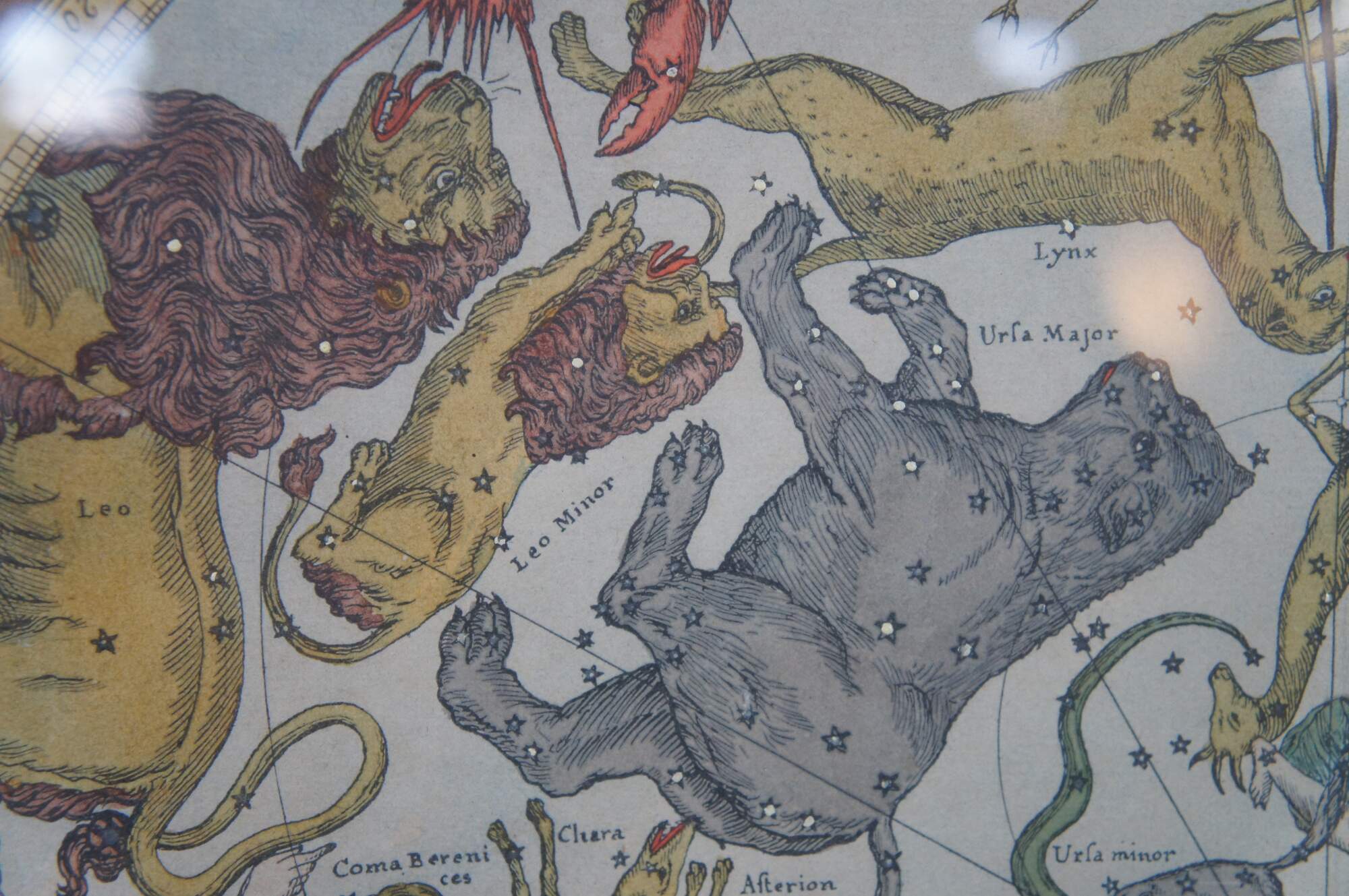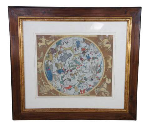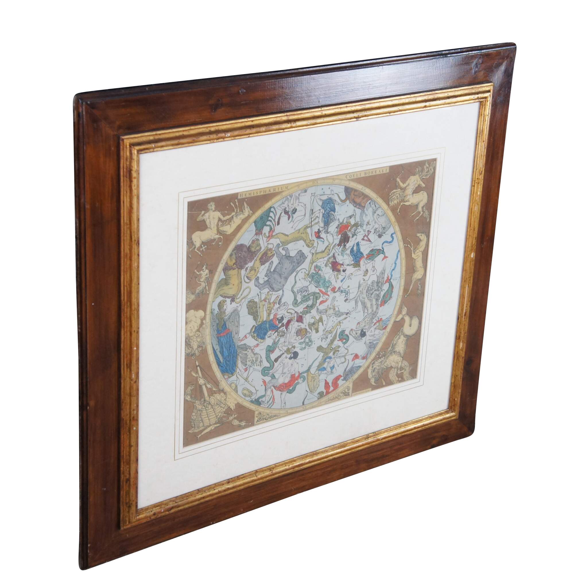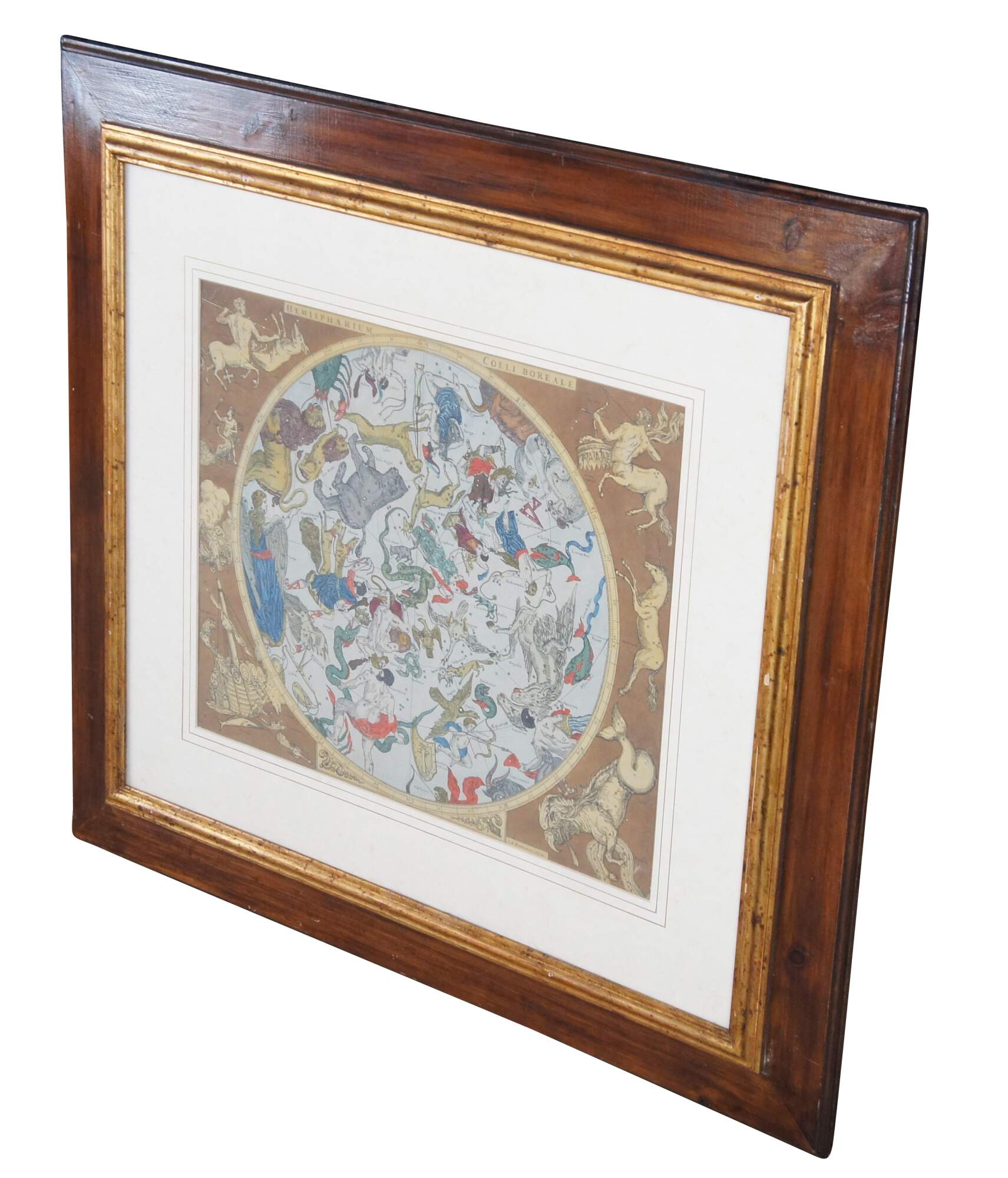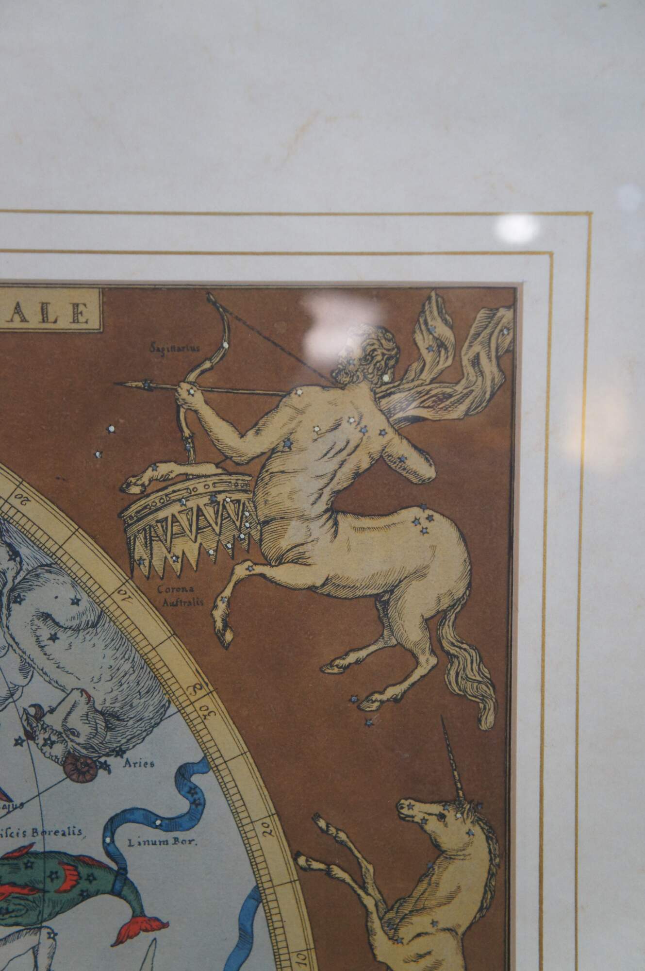 Large vintage copy of the Hemisphaerium Coeli Boreale historical celestial map. It depicts the constellations of the Northern Hemisphere based on classical Greek mythology and early astronomical data. The original map was notably published by the Homann Heirs in Nuremberg, Germany, around 1710–1742. It features decorative vignettes of celestial monsters, animals, and mythological figures surrounding the central circular chart.
