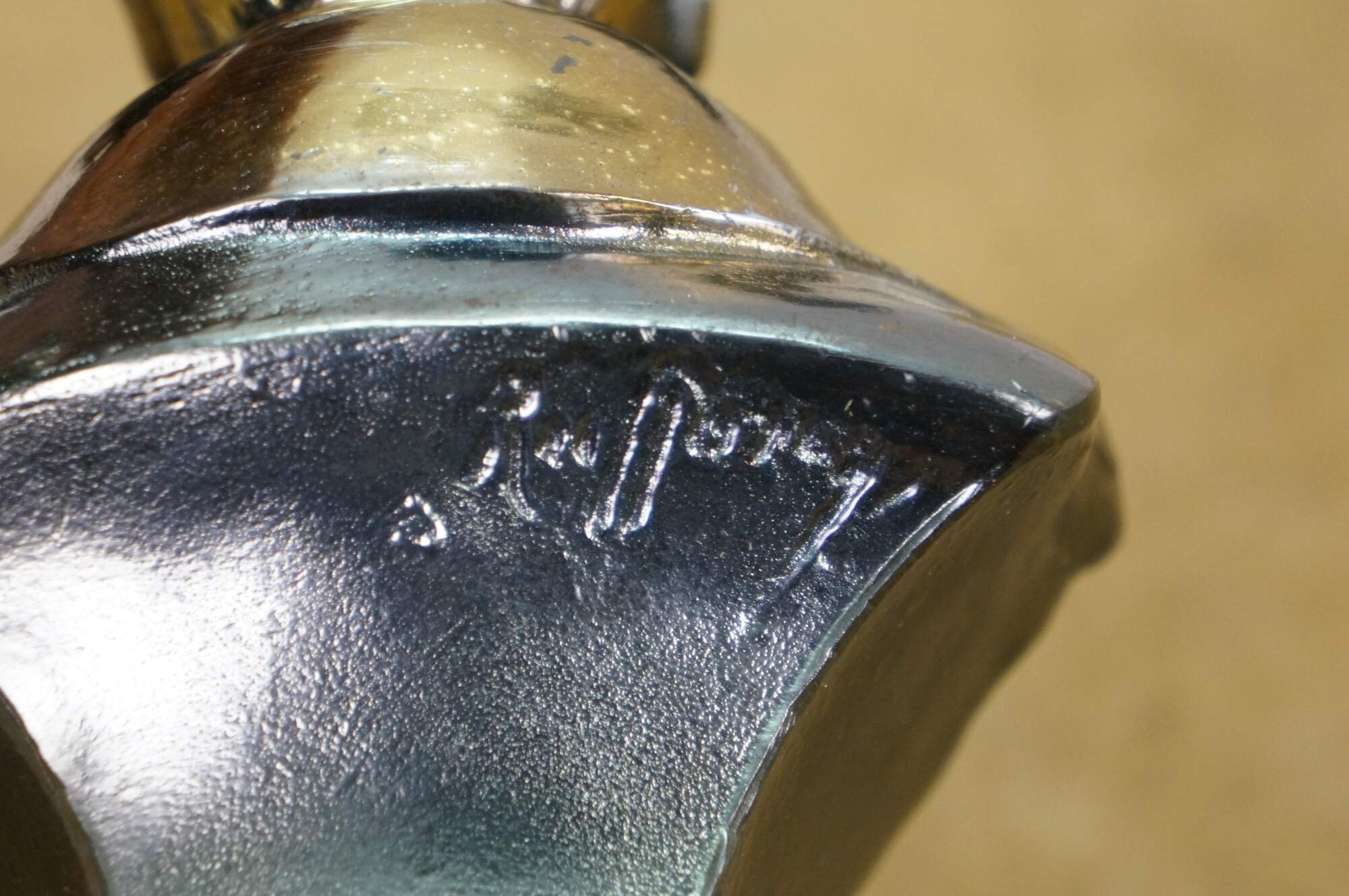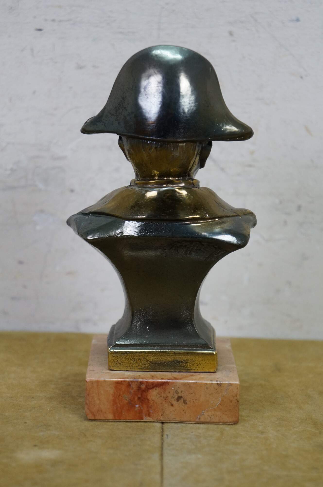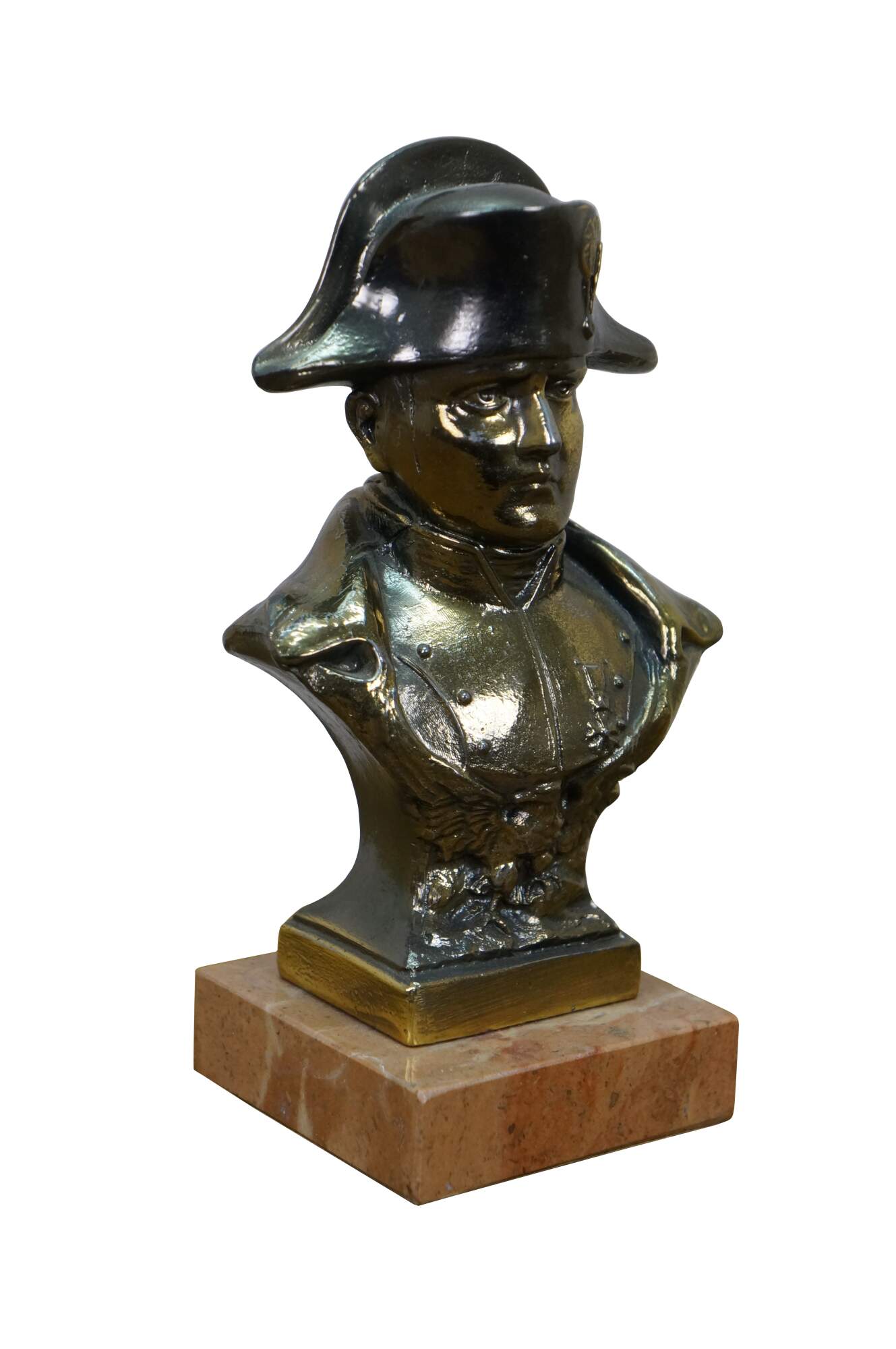 Vintage cast spelter metal Napoleon bust statue featuring the famous military officer in Regalia uniform and spread wing Federal style eagle. Signed on back shoulder by artist.